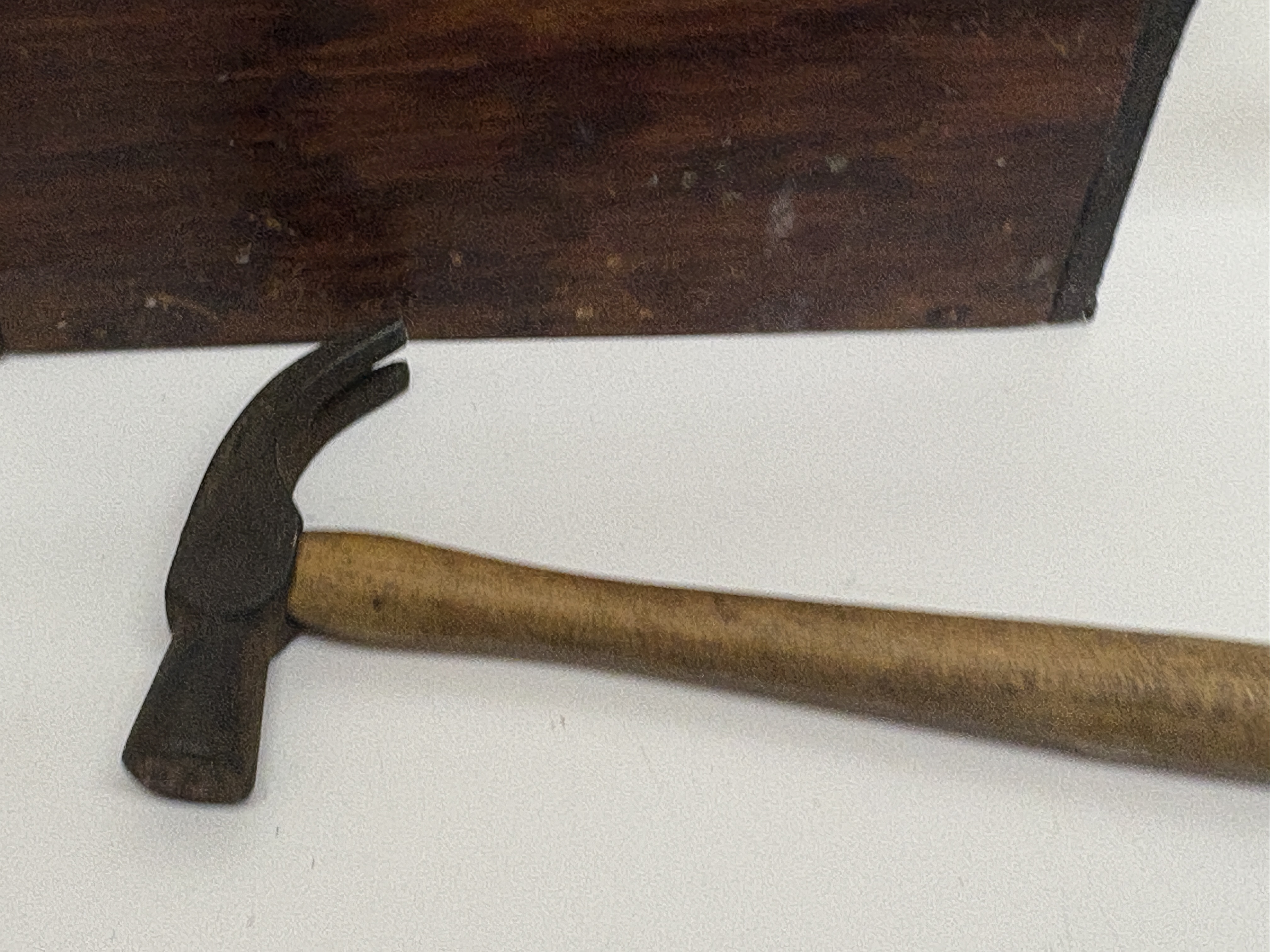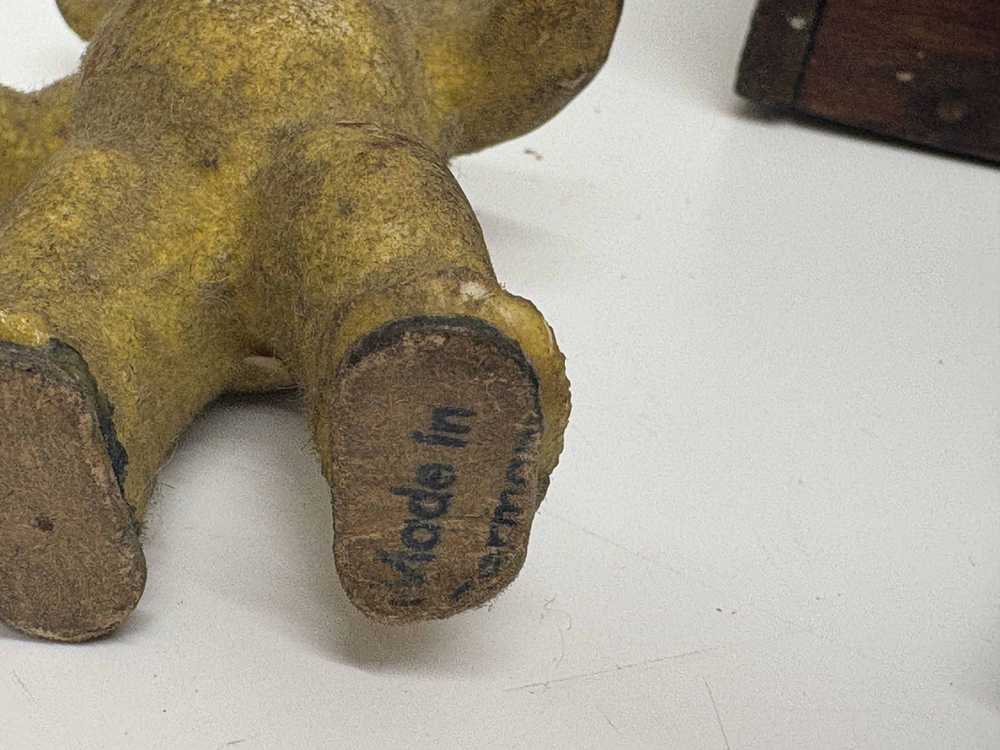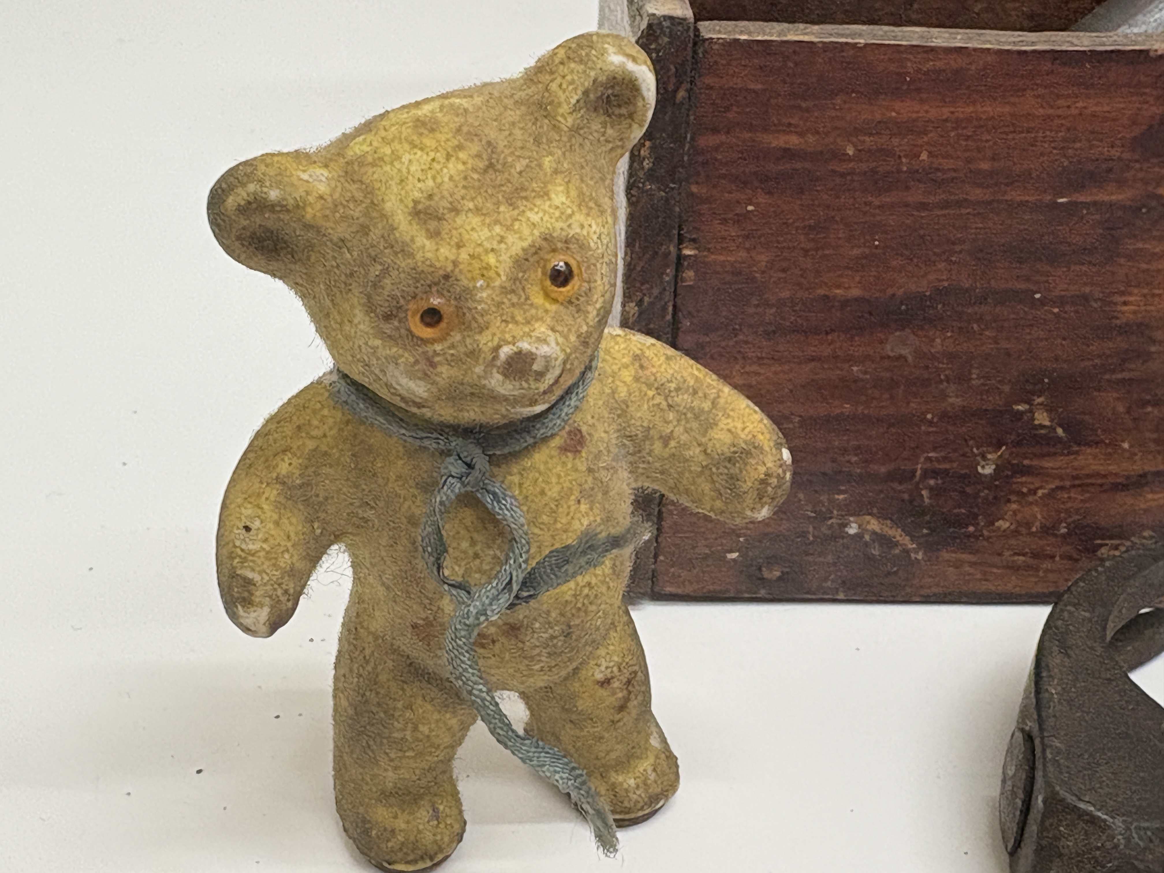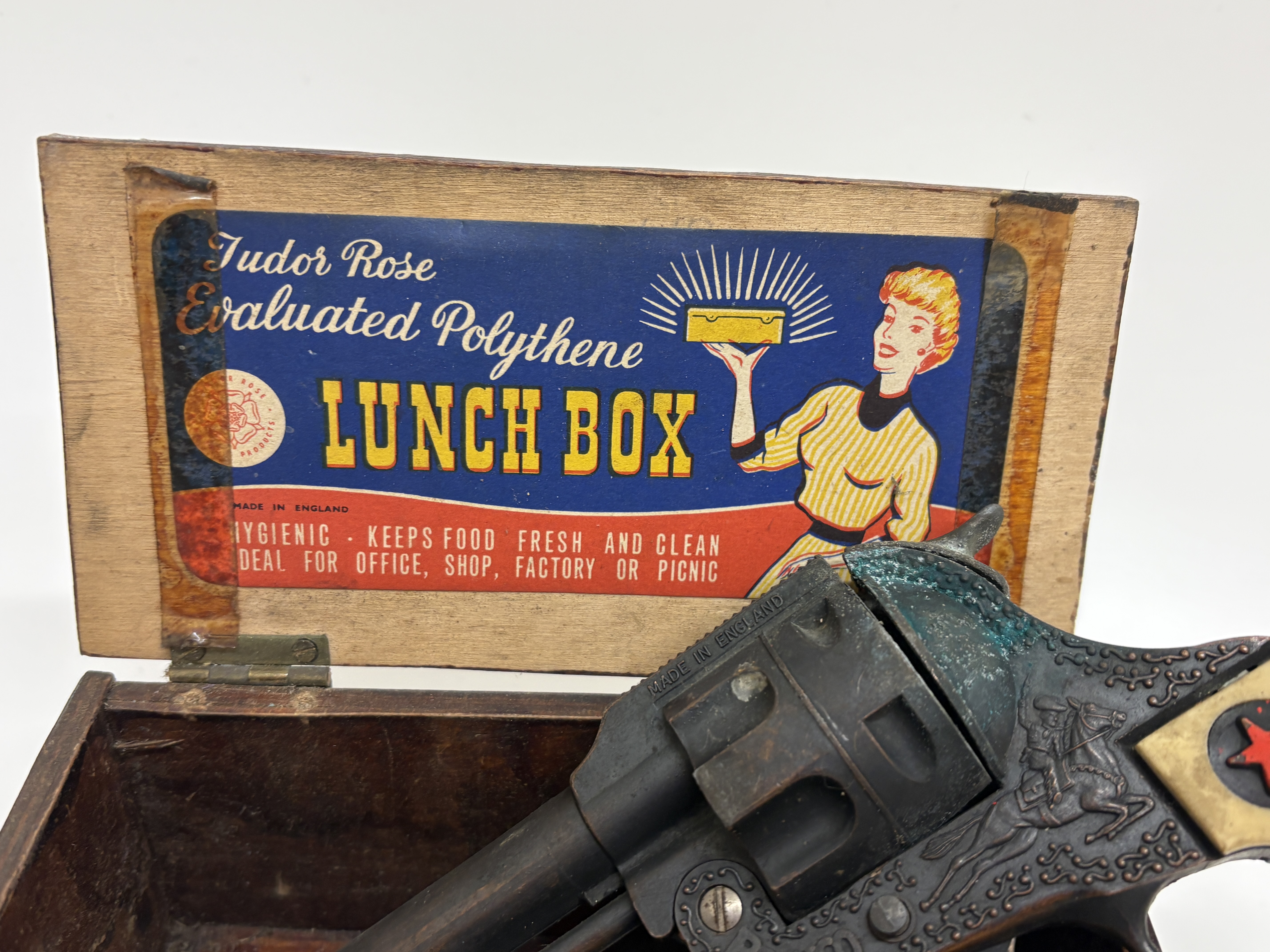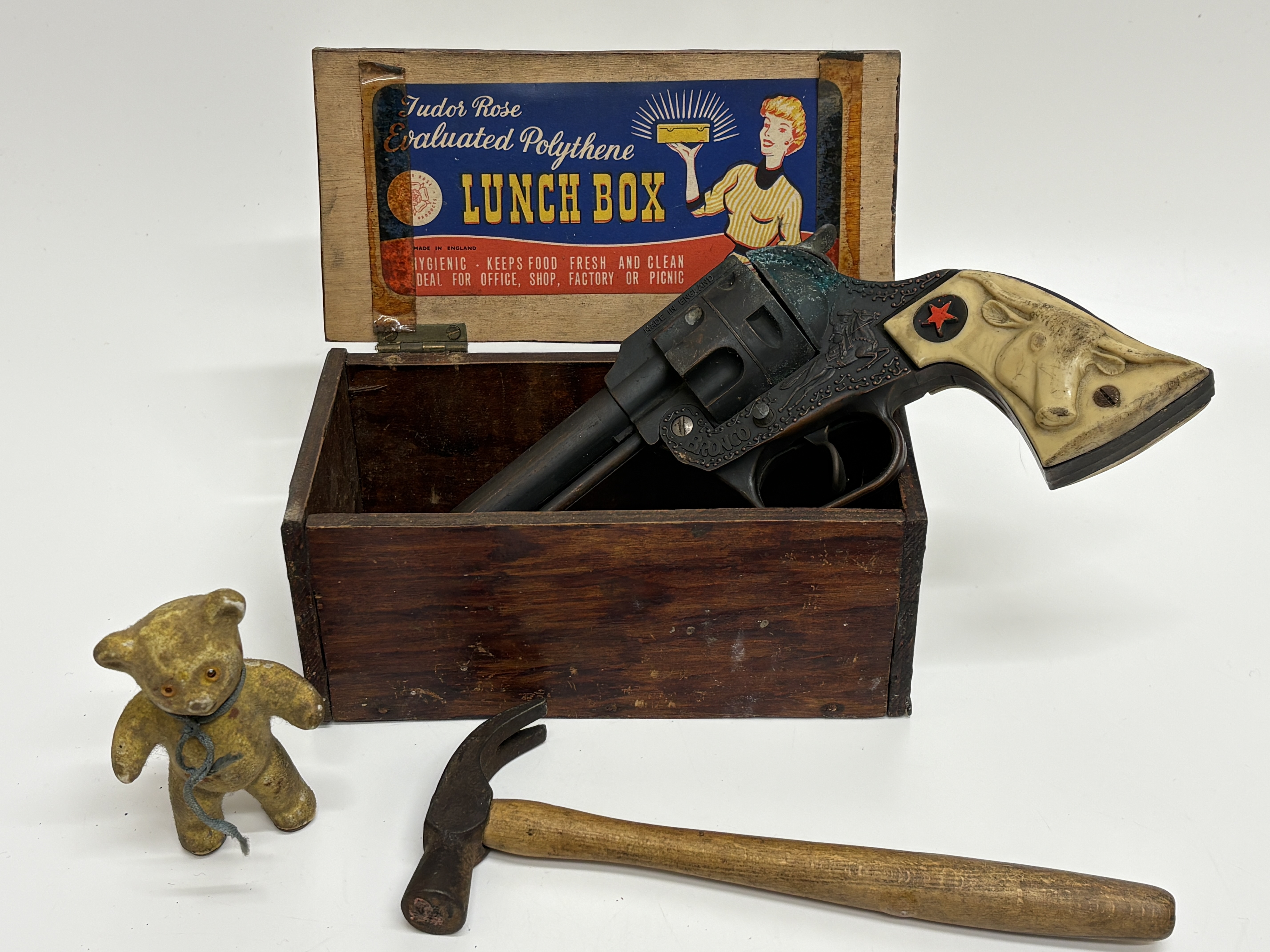 A group of vintage items featuring a Bronco brand die-cast toy cap gun. The toy revolver is marked Made in England and displays ornate Western-style scrollwork with a cowboy-on-horseback relief. The cream-coloured grip features a moulded steer’s head and an inset red star. Accompanying the pistol is a hinged wooden storage box containing a vintage Tudor Rose Evaluated Polythene Lunch Box paper label on the interior lid. The lot also includes a small flocked teddy bear figure with glass eyes and a Made in Germany stamp on the sole of its foot, along with a small utility claw hammer featuring a wooden handle and forged steel head.
