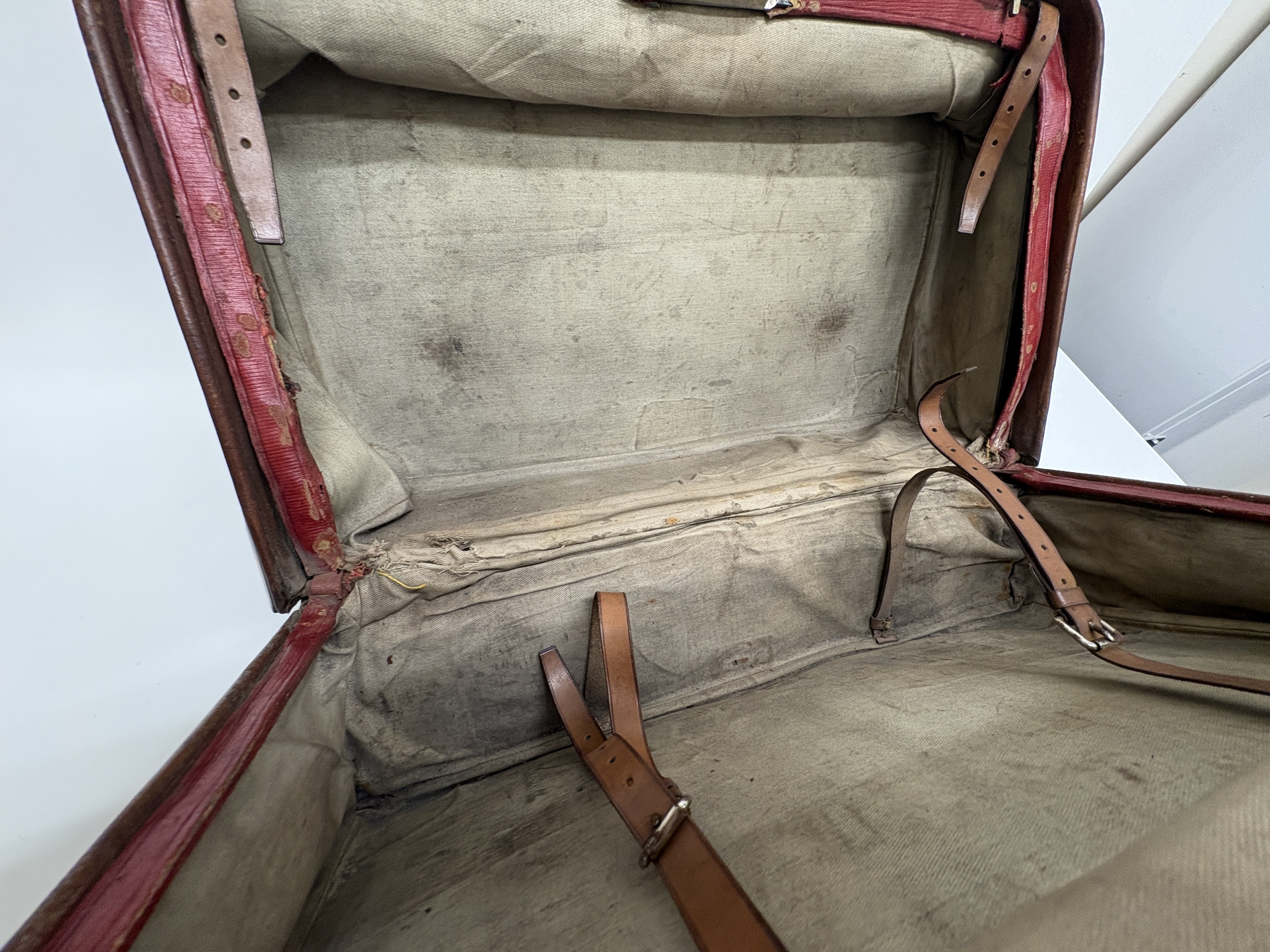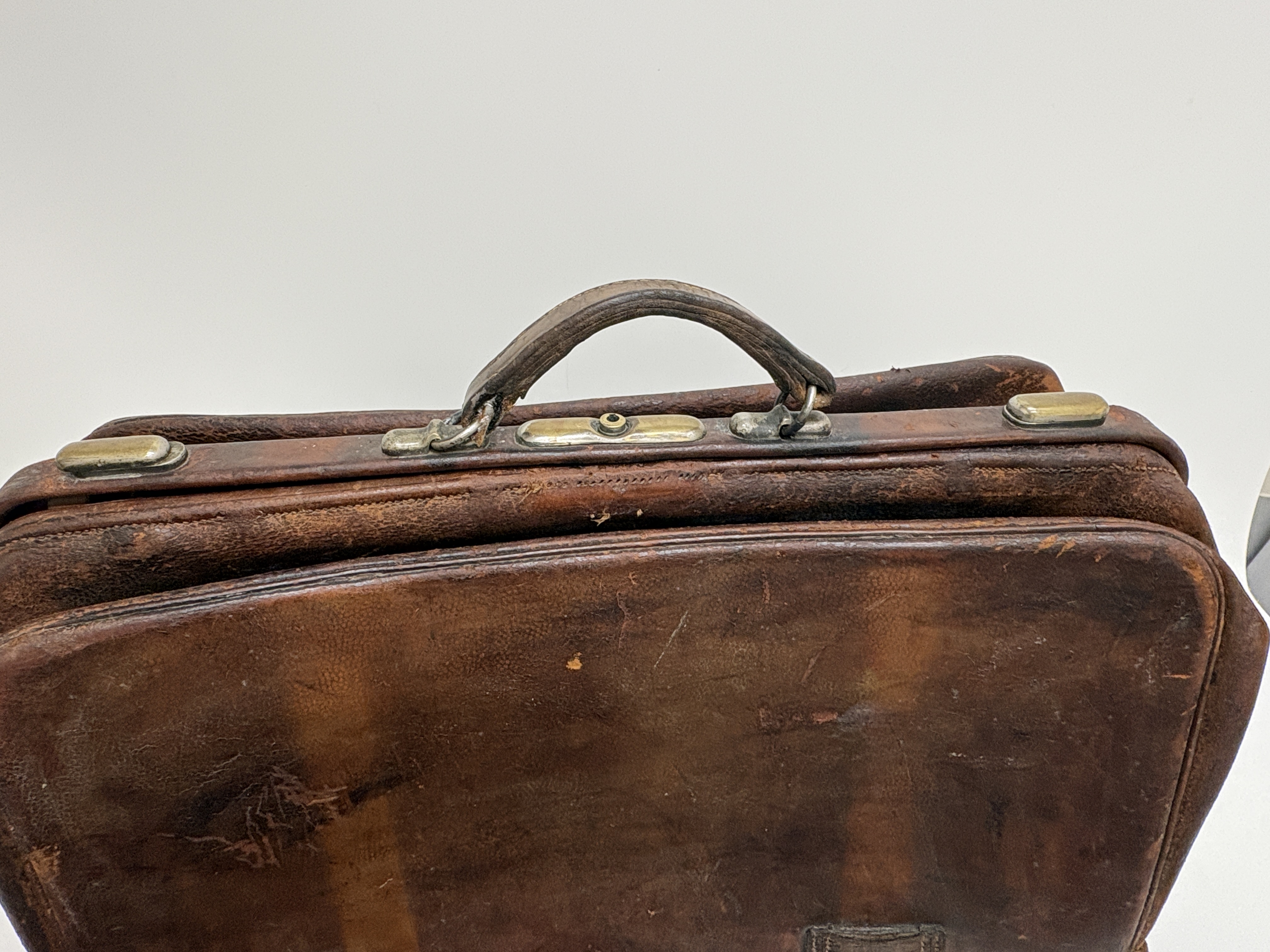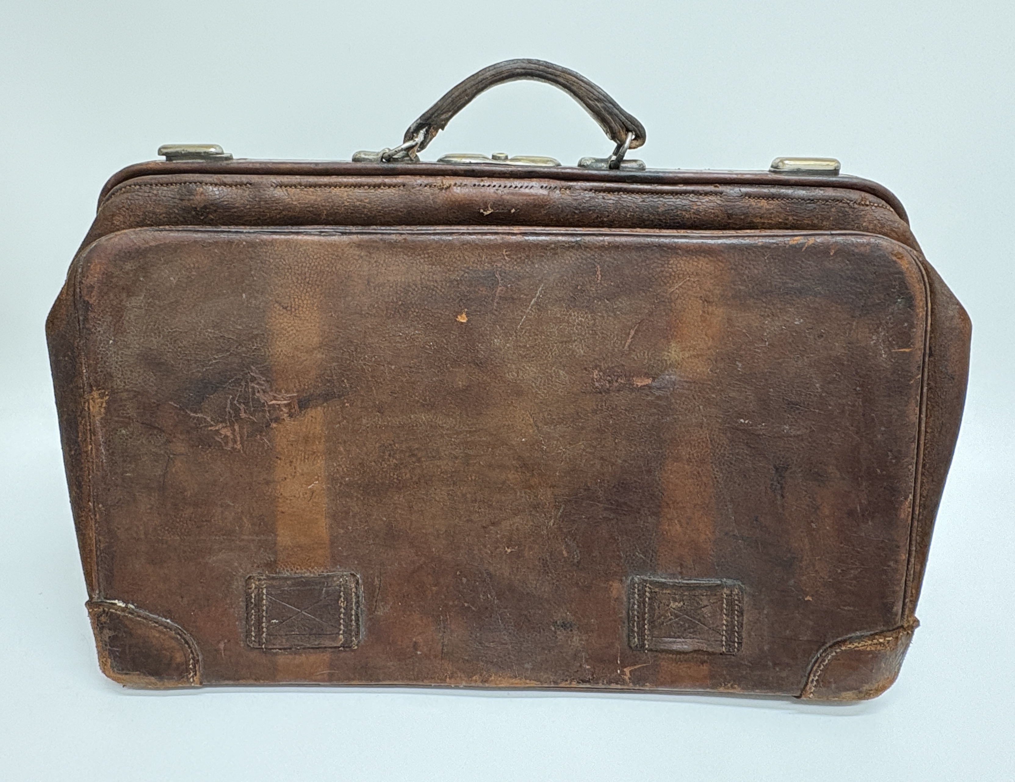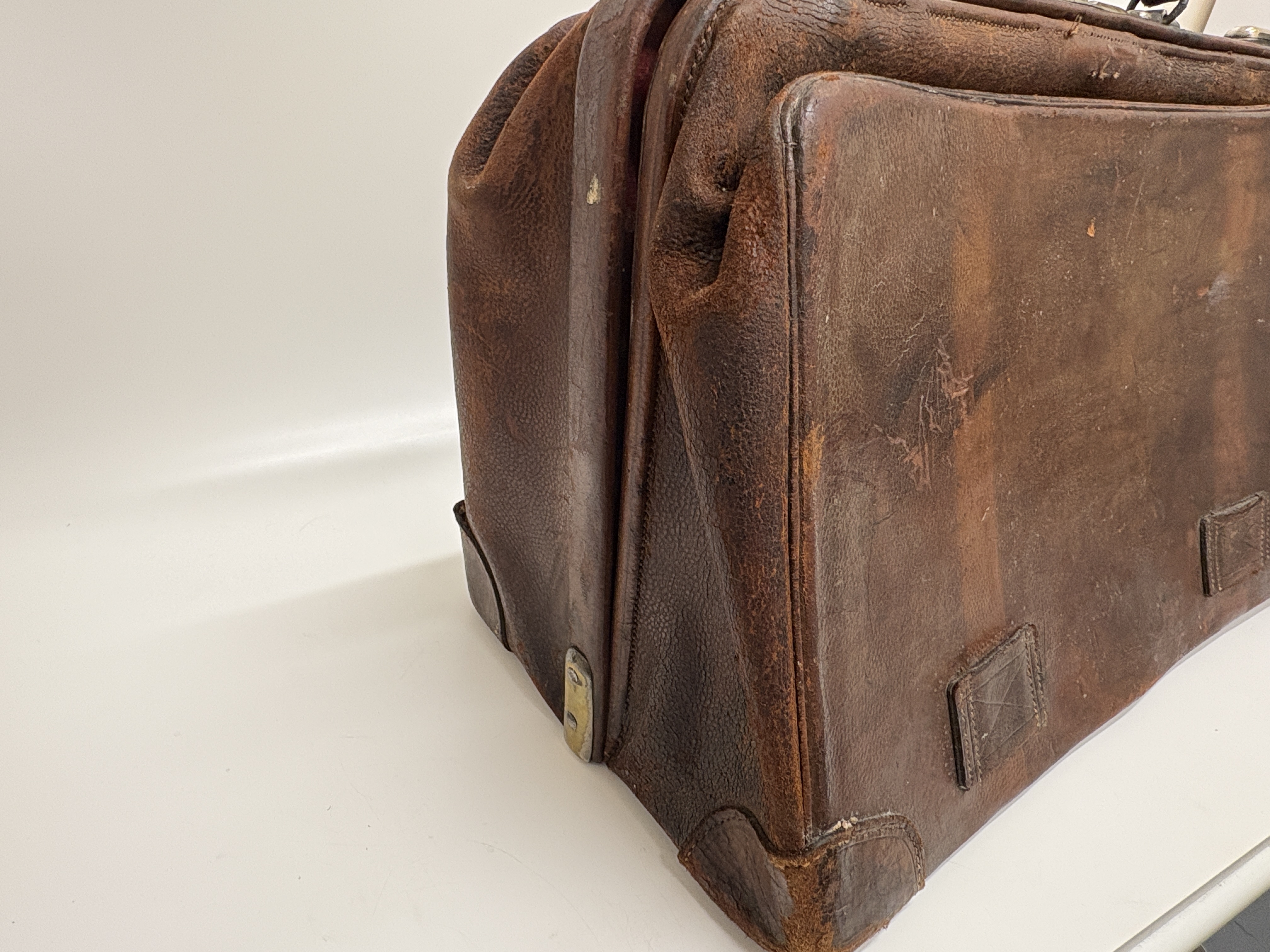 This vintage Gladstone-style doctor’s bag is constructed from textured brown leather with a top-opening metal frame. The exterior features a single leather-wrapped top handle secured by metal hardware, alongside reinforced leather corners and three metal slide latches. The interior is lined with a light-coloured fabric and contains two sets of adjustable leather retaining straps with metal buckles. The bag is designed with a wide-opening mouth characteristic of the Gladstone style.