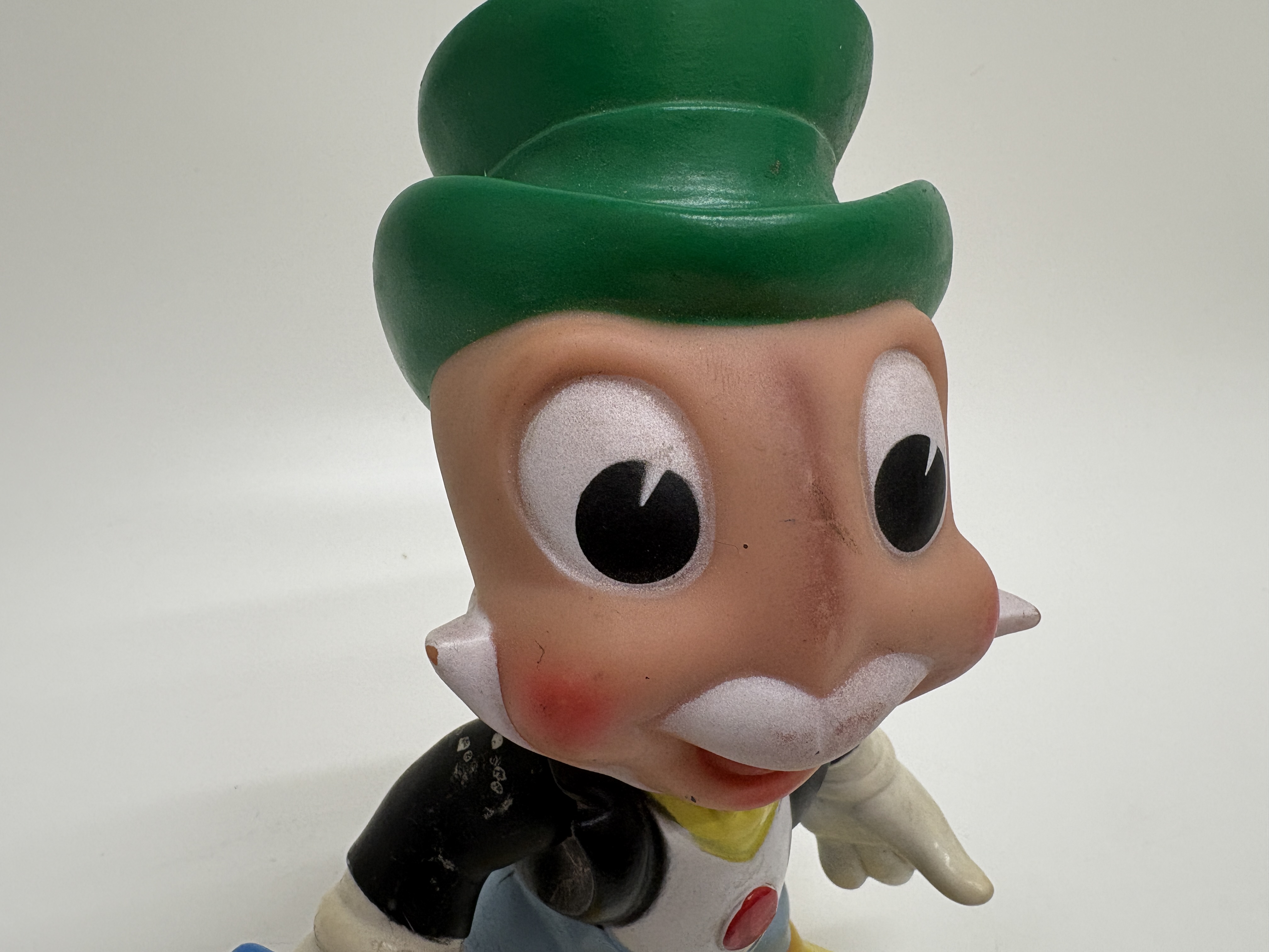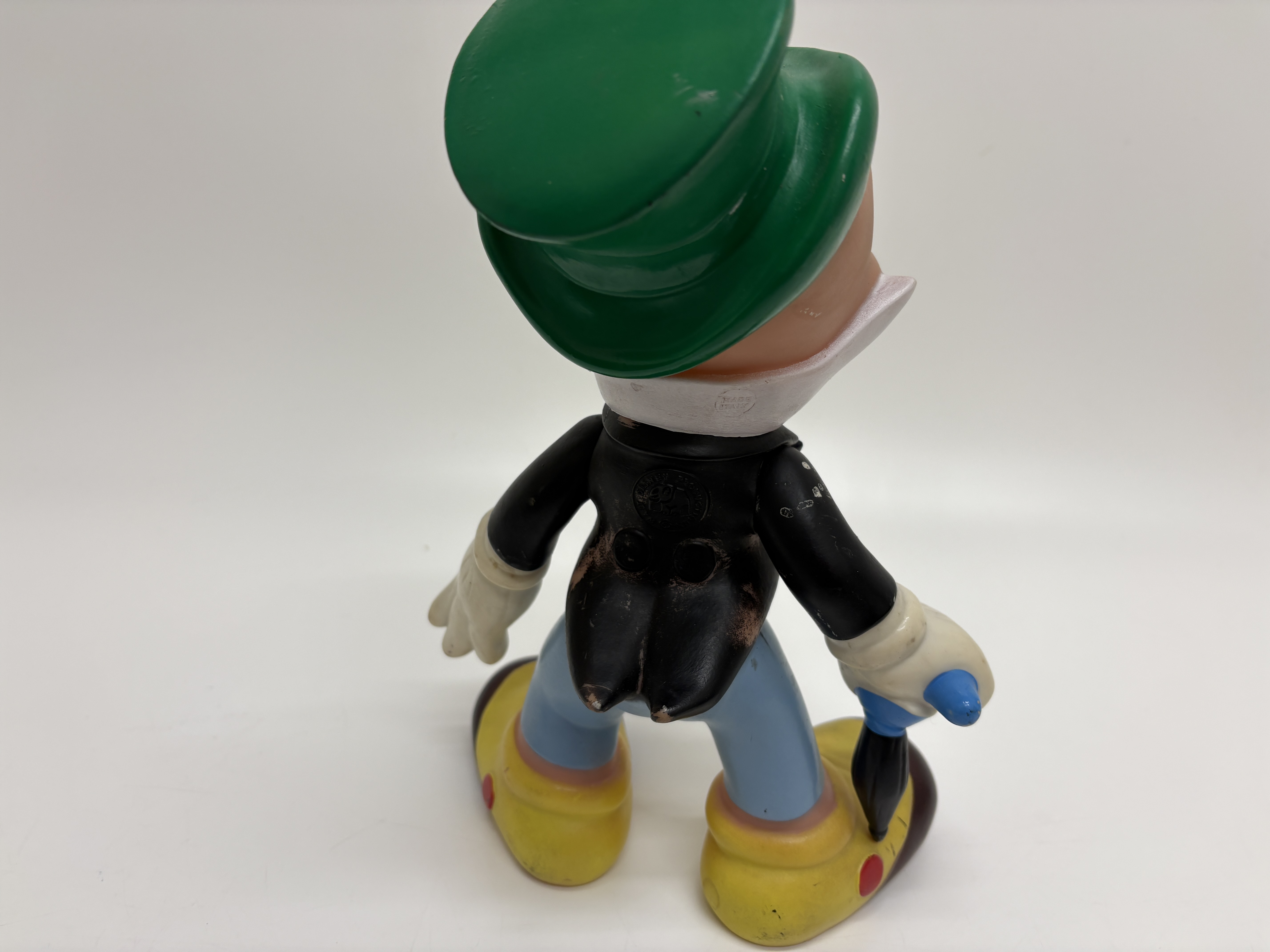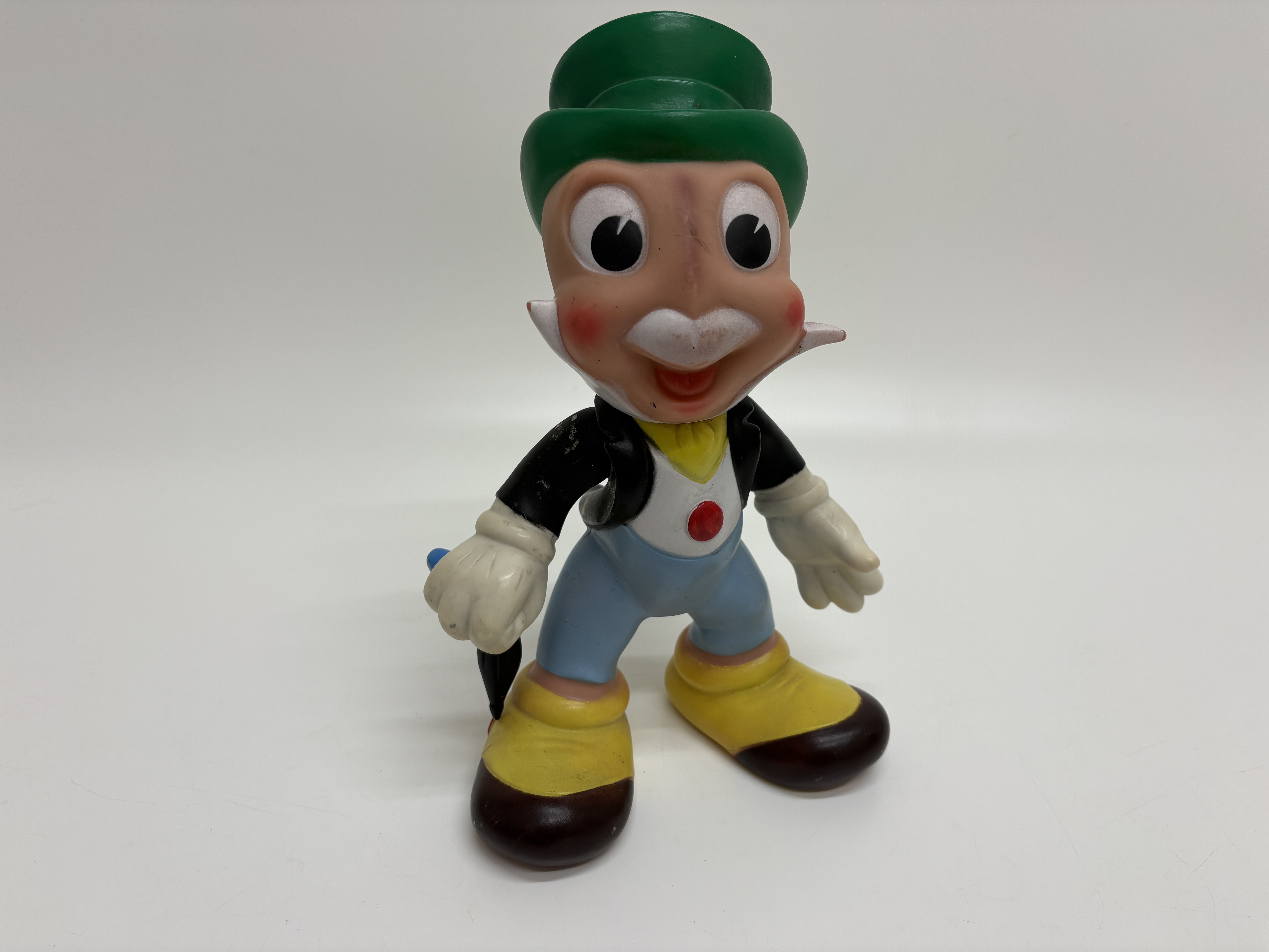 A vintage Walt Disney Ledra Jiminy Cricket moulded rubber squeak toy, manufactured in Italy circa 1960. The figure is constructed from soft vinyl or rubber and depicts the character from the film Pinocchio in his signature attire, featuring a green top hat, black tailcoat, blue trousers, and yellow and brown shoes, while holding a blue umbrella. The reverse of the jacket features an embossed circular manufacturer mark for Walt Disney Productions surrounding a central elephant icon, the trademark for Ledraplastic. A further Trade Mark stamp is visible on the reverse of the white collar.