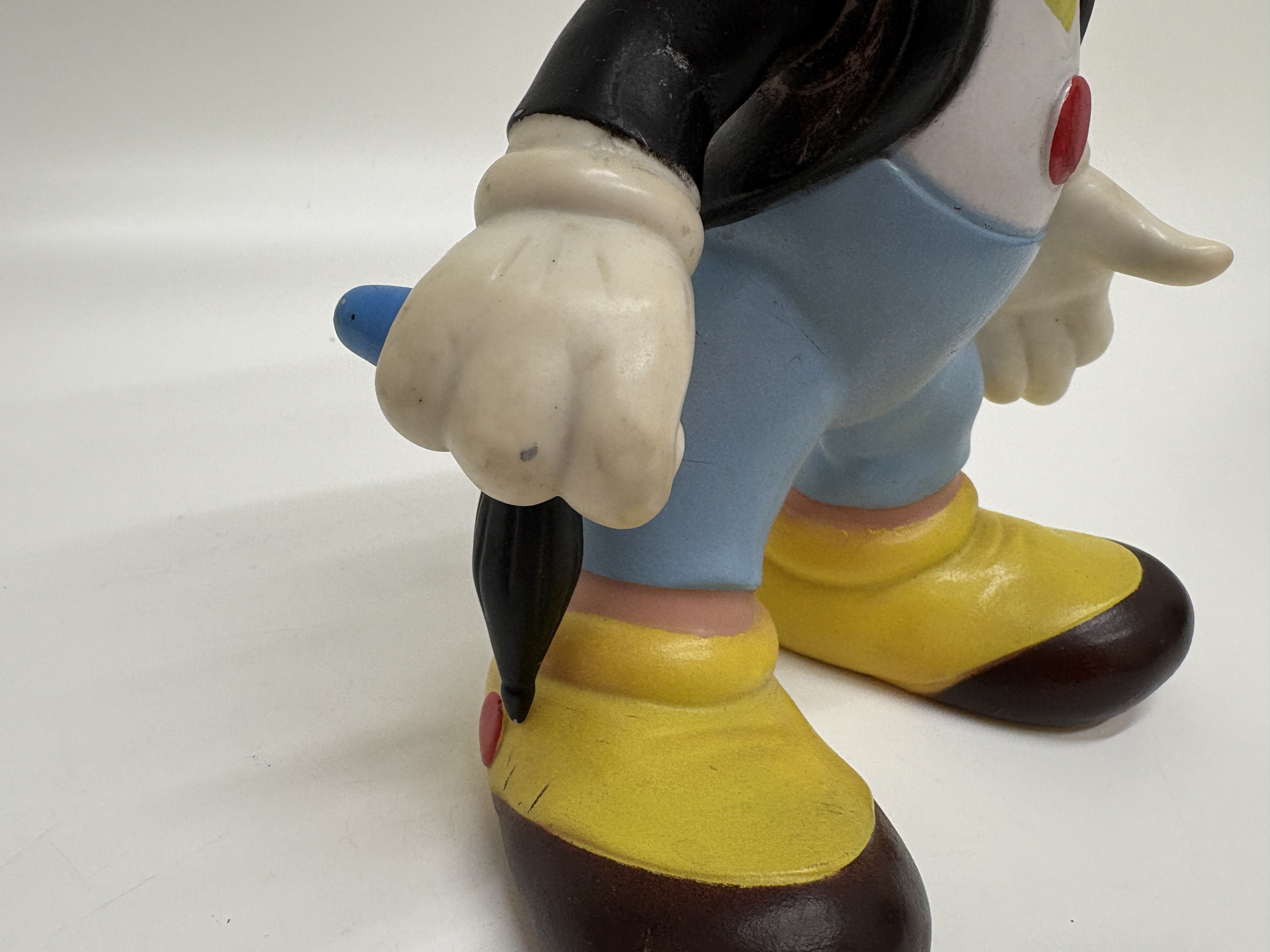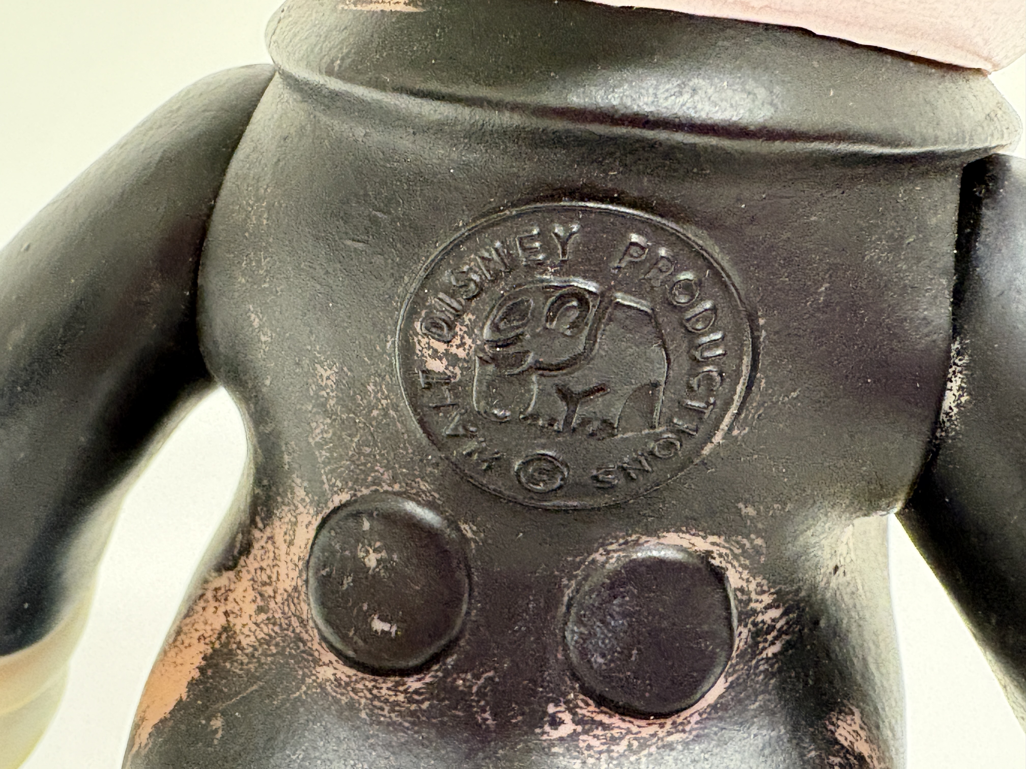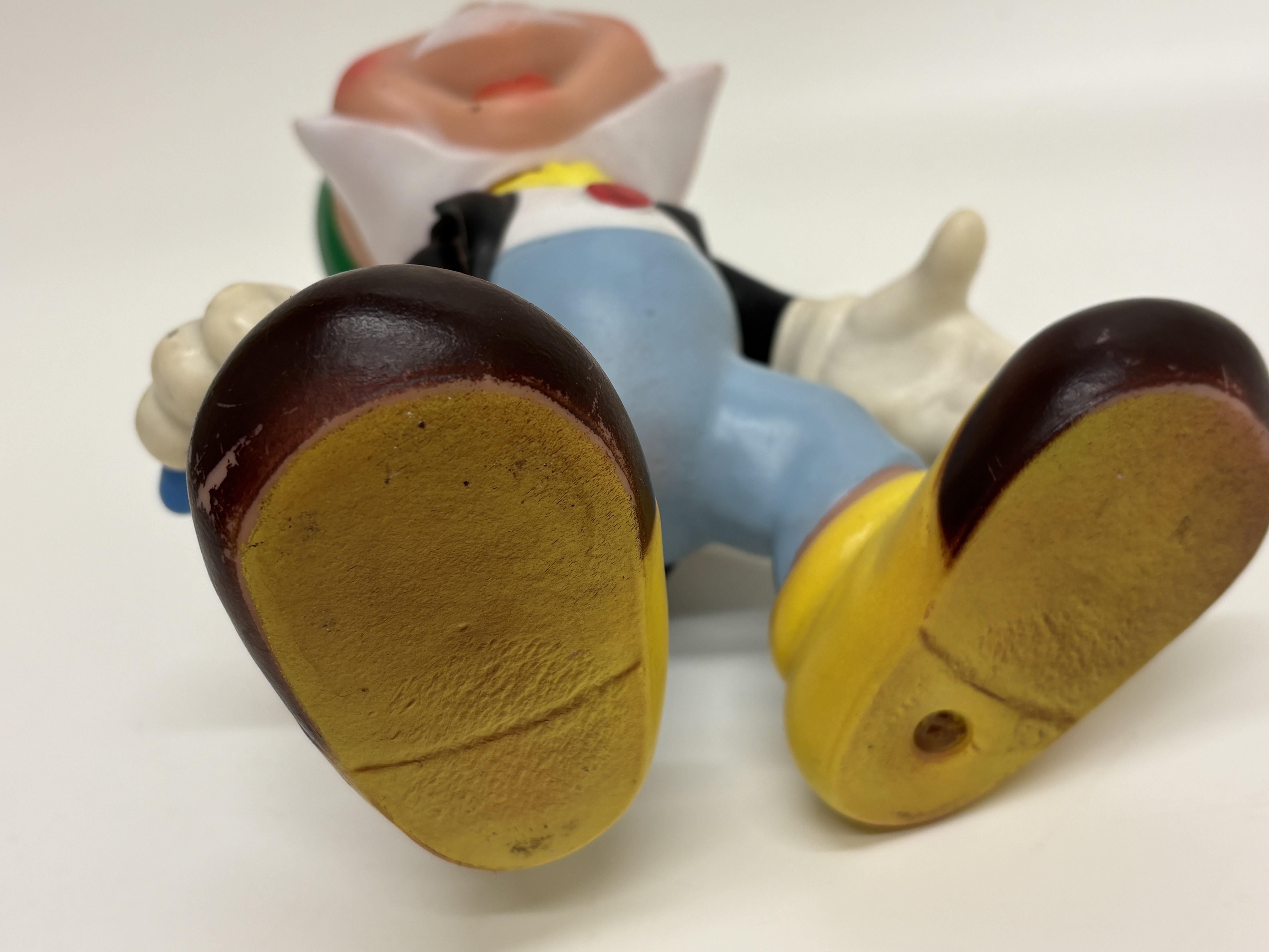 A vintage Walt Disney Ledra Jiminy Cricket moulded rubber squeak toy, manufactured in Italy circa 1960. The figure is constructed from soft vinyl or rubber and depicts the character from the film Pinocchio in his signature attire, featuring a green top hat, black tailcoat, blue trousers, and yellow and brown shoes, while holding a blue umbrella. The reverse of the jacket features an embossed circular manufacturer mark for Walt Disney Productions surrounding a central elephant icon, the trademark for Ledraplastic. A further Trade Mark stamp is visible on the reverse of the white collar.