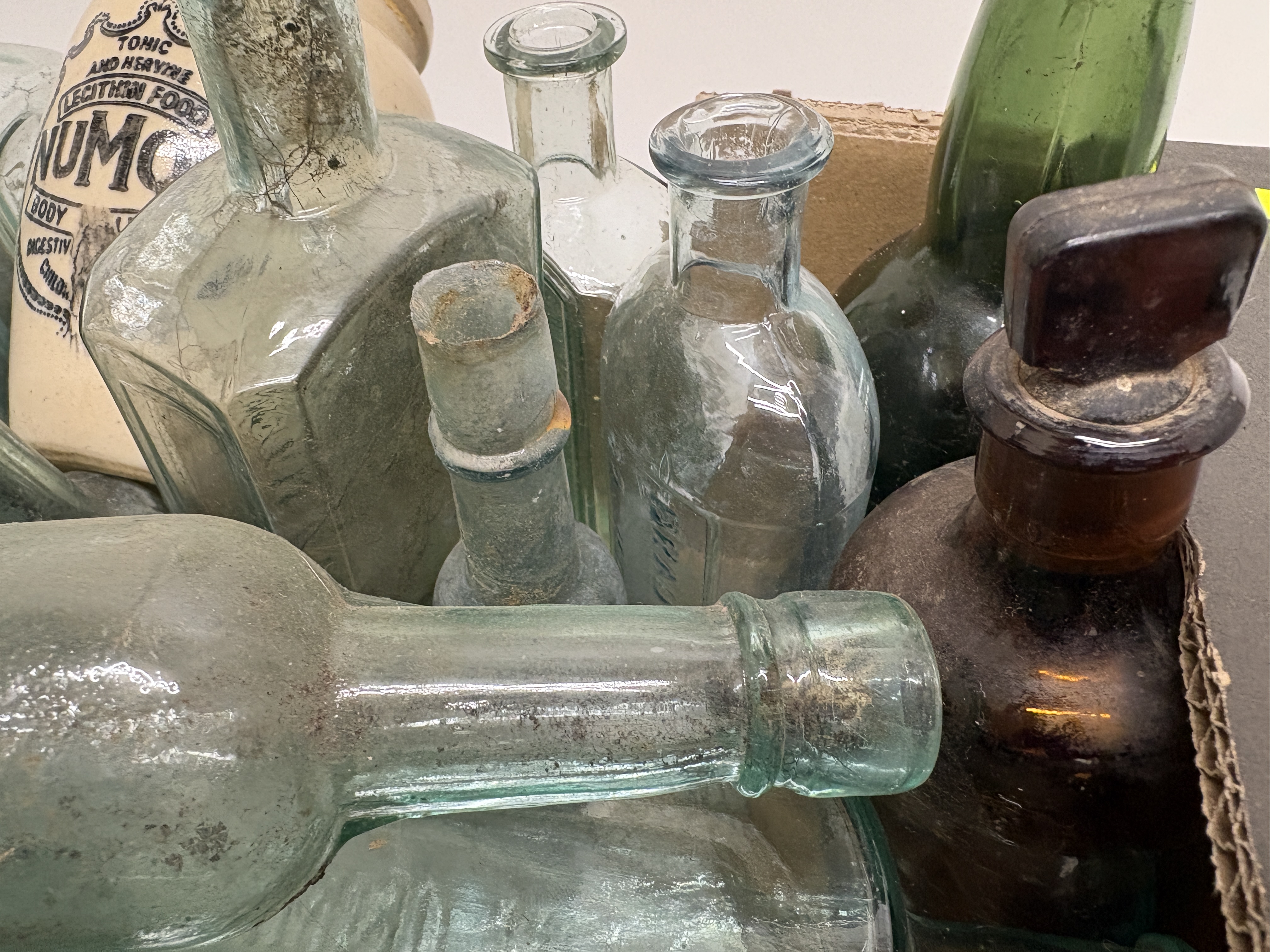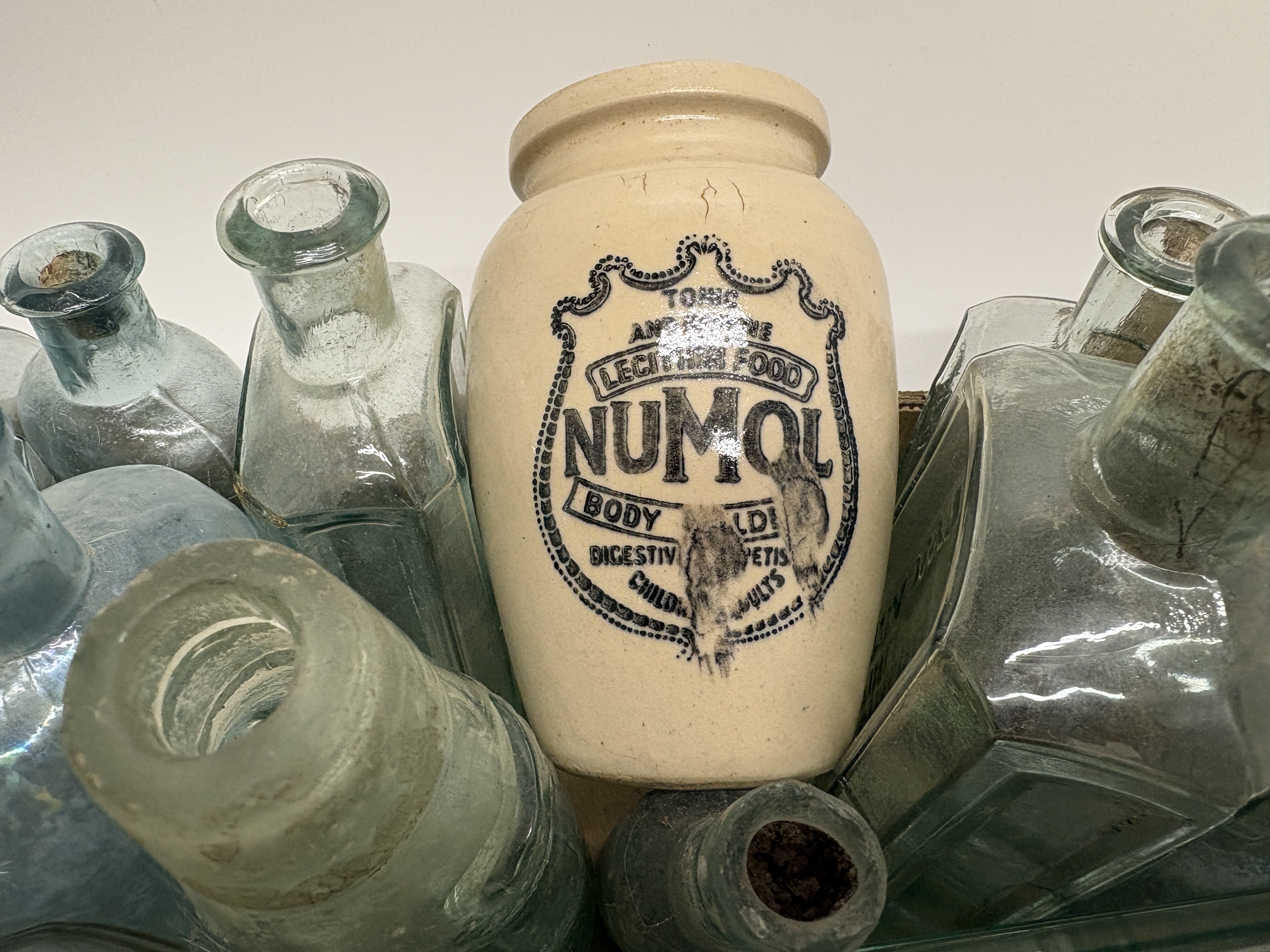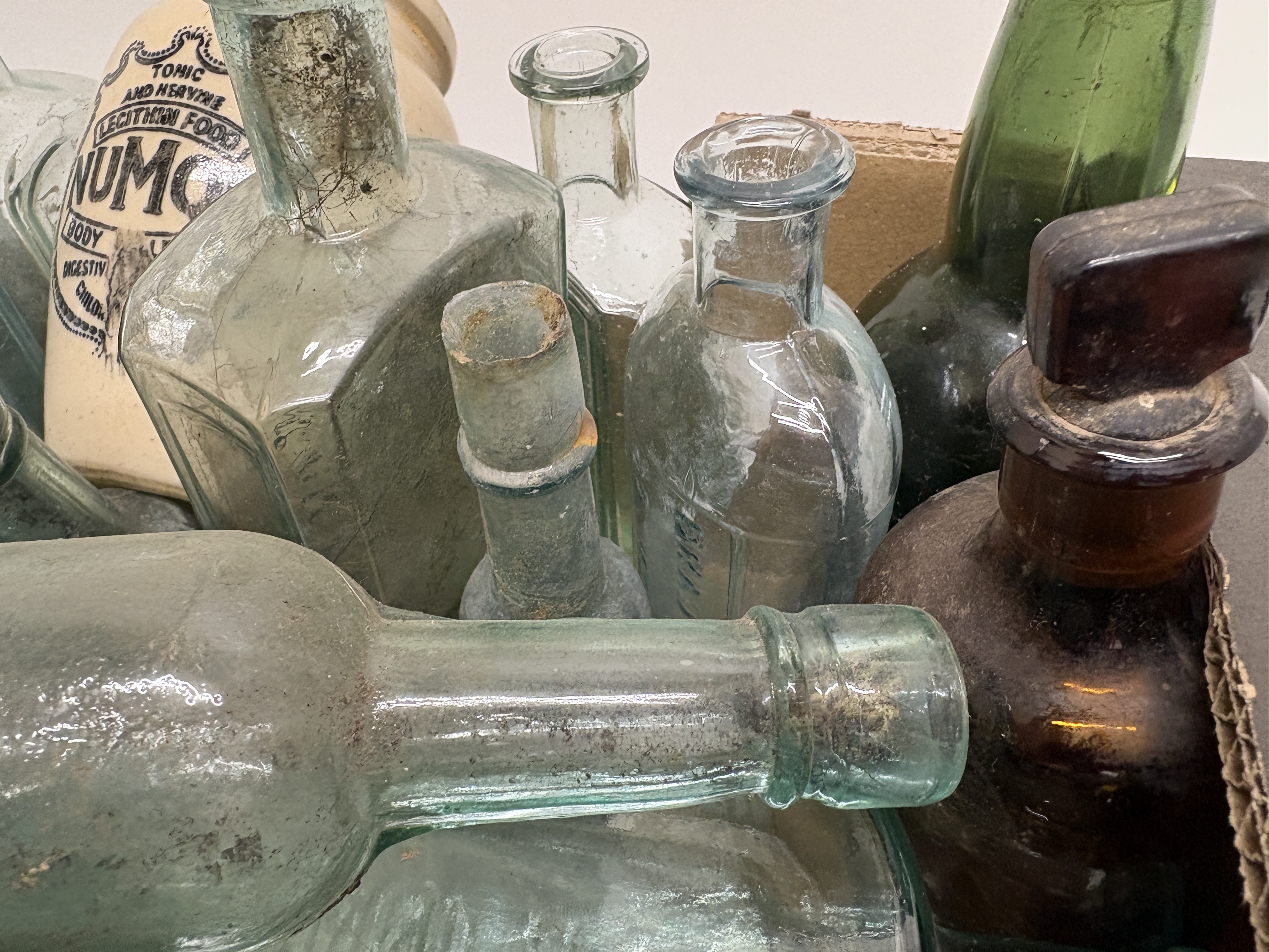 This extensive collection comprises a variety of antique and vintage vessels, featuring aqua, clear, amber, and green glass alongside cream-coloured stoneware. A primary highlight is a cylindrical stoneware jar with black transfer-printed advertising for Numol, a Tonic and Nerve Lecithin Food produced in Newcastle-upon-Tyne, marketed as a body builder and digestive appetiser for children and adults. The glass assortment includes rectangular apothecary bottles with applied lips, vertically ribbed poison or chemist bottles, and round beverage containers, one of which is embossed with Brewery. Several examples feature ground glass stoppers and hand-finished necks, indicative of late 19th to early 20th-century manufacturing techniques. The collection showcases a range of historical packaging from the Victorian and Edwardian periods. No ruler or scale is present in the images.