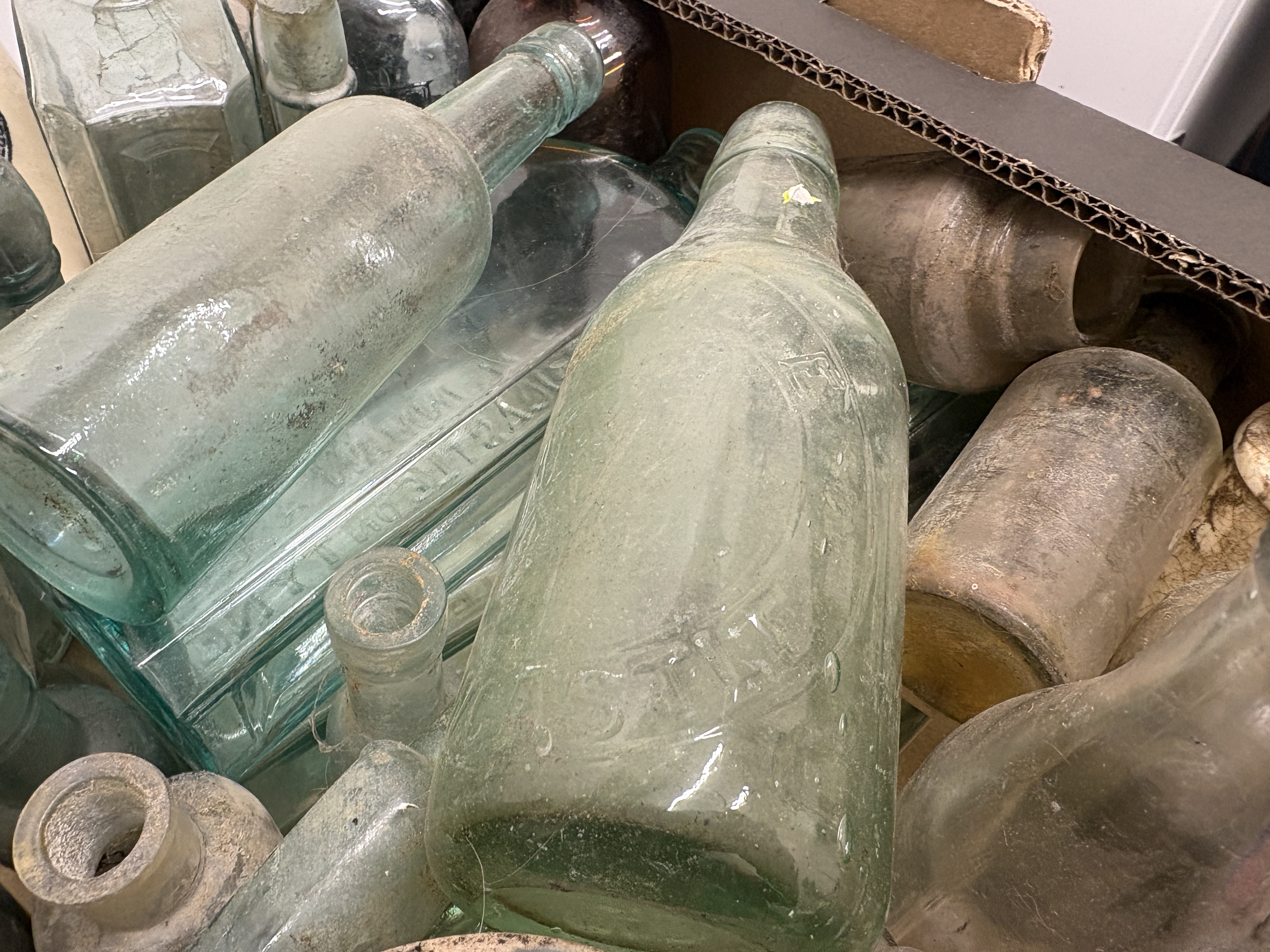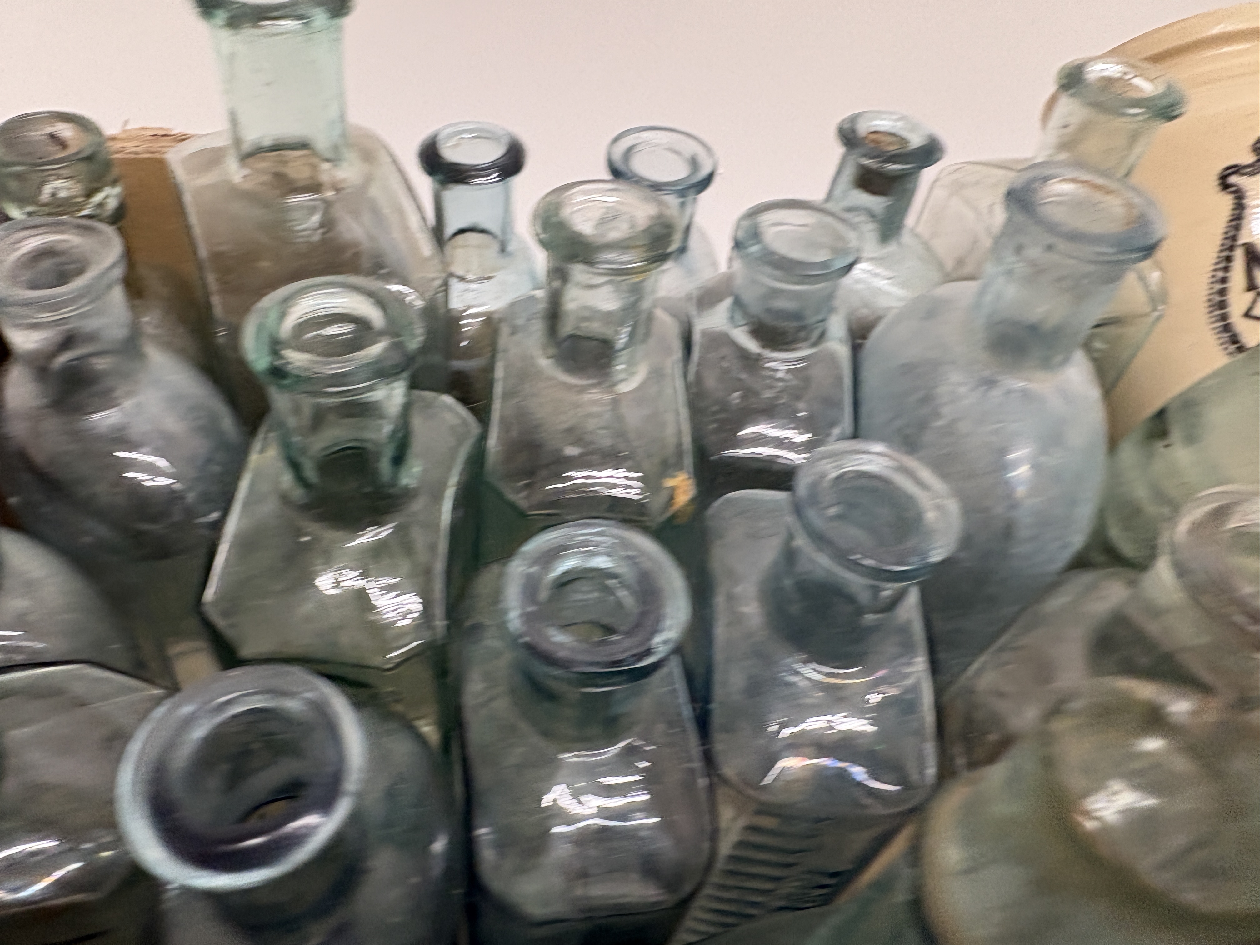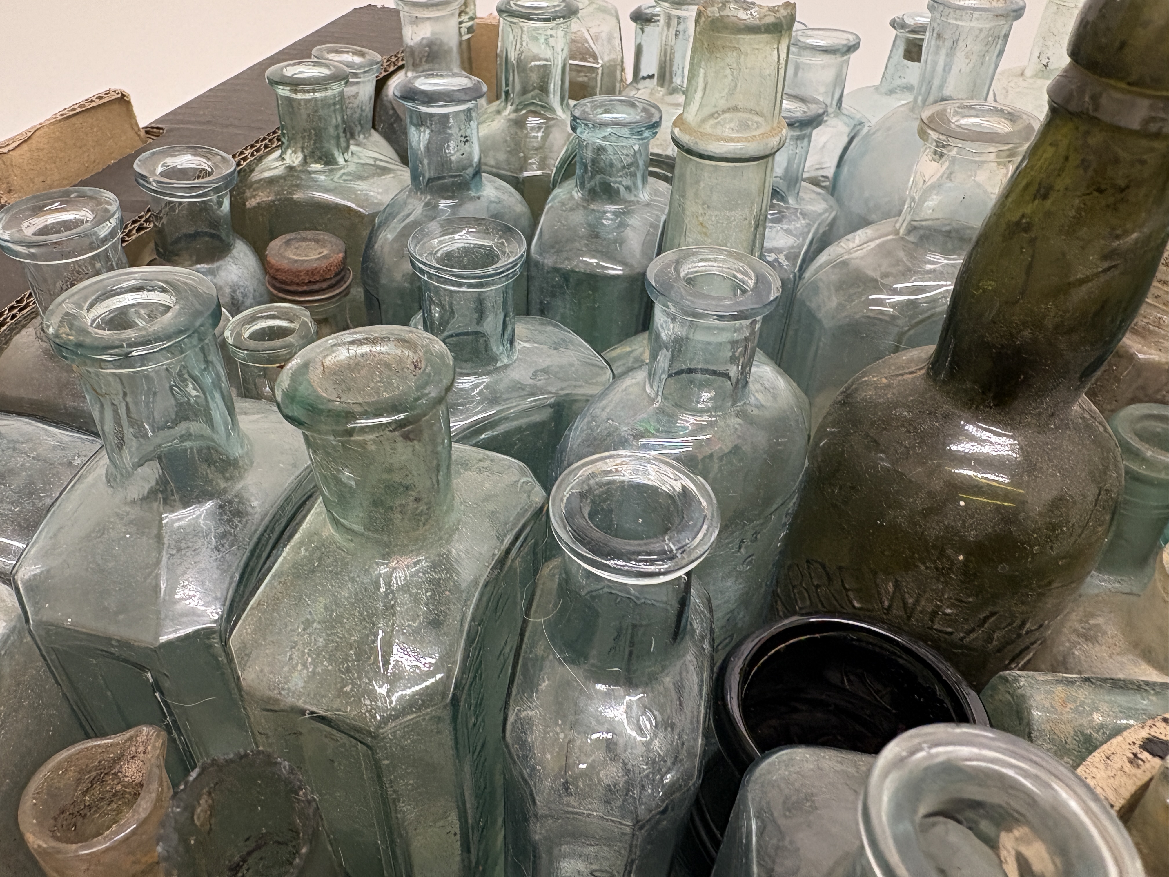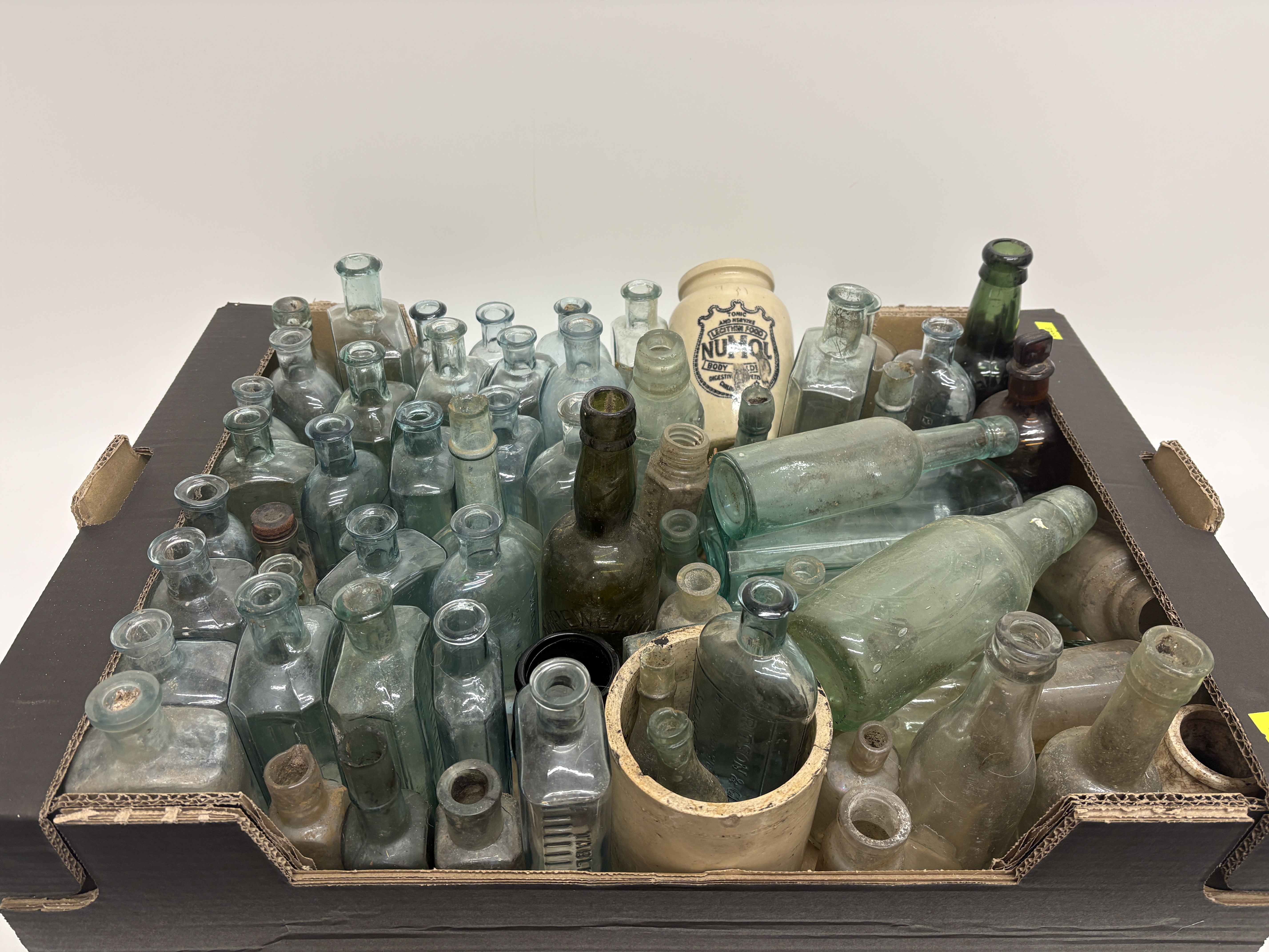This extensive collection comprises a variety of antique and vintage vessels, featuring aqua, clear, amber, and green glass alongside cream-coloured stoneware. A primary highlight is a cylindrical stoneware jar with black transfer-printed advertising for Numol, a Tonic and Nerve Lecithin Food produced in Newcastle-upon-Tyne, marketed as a body builder and digestive appetiser for children and adults. The glass assortment includes rectangular apothecary bottles with applied lips, vertically ribbed poison or chemist bottles, and round beverage containers, one of which is embossed with Brewery. Several examples feature ground glass stoppers and hand-finished necks, indicative of late 19th to early 20th-century manufacturing techniques. The collection showcases a range of historical packaging from the Victorian and Edwardian periods. No ruler or scale is present in the images.