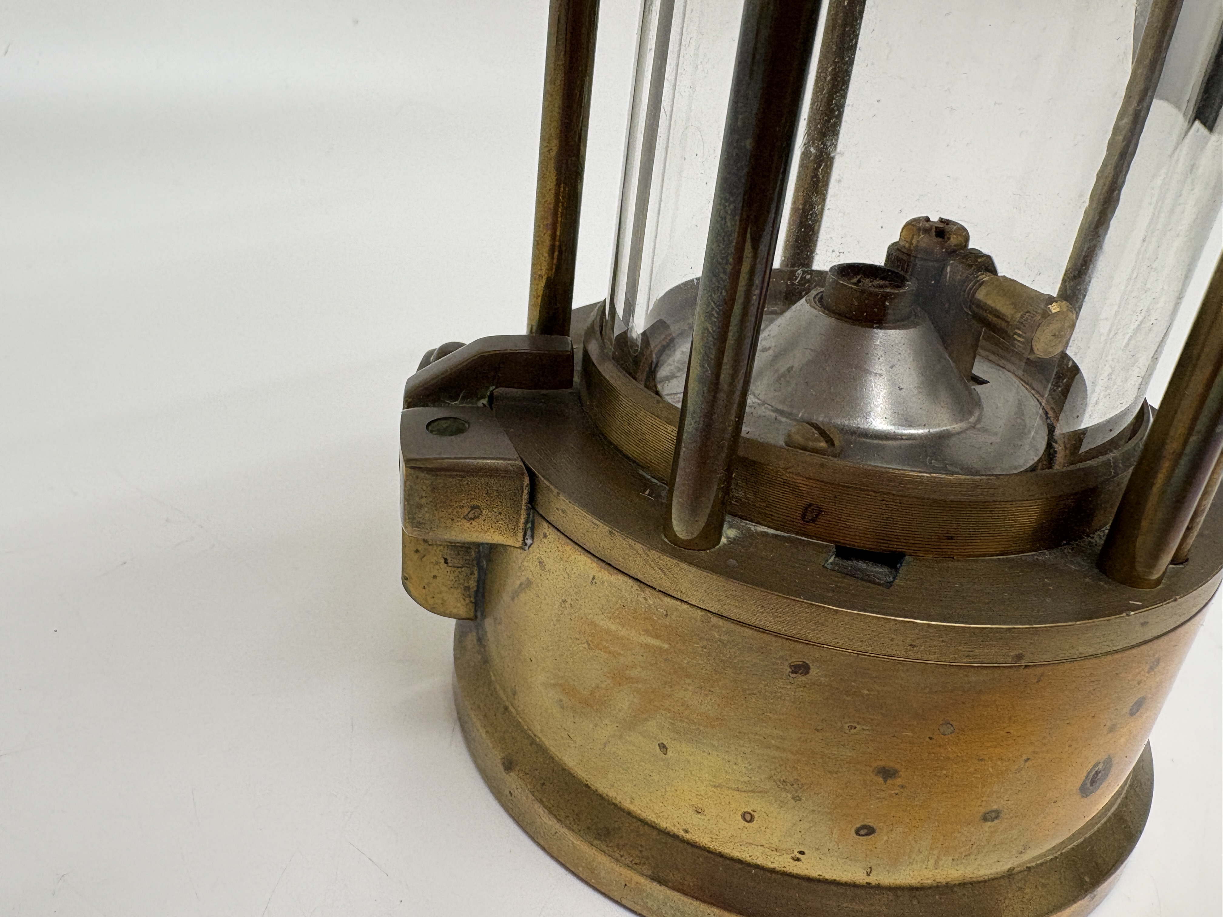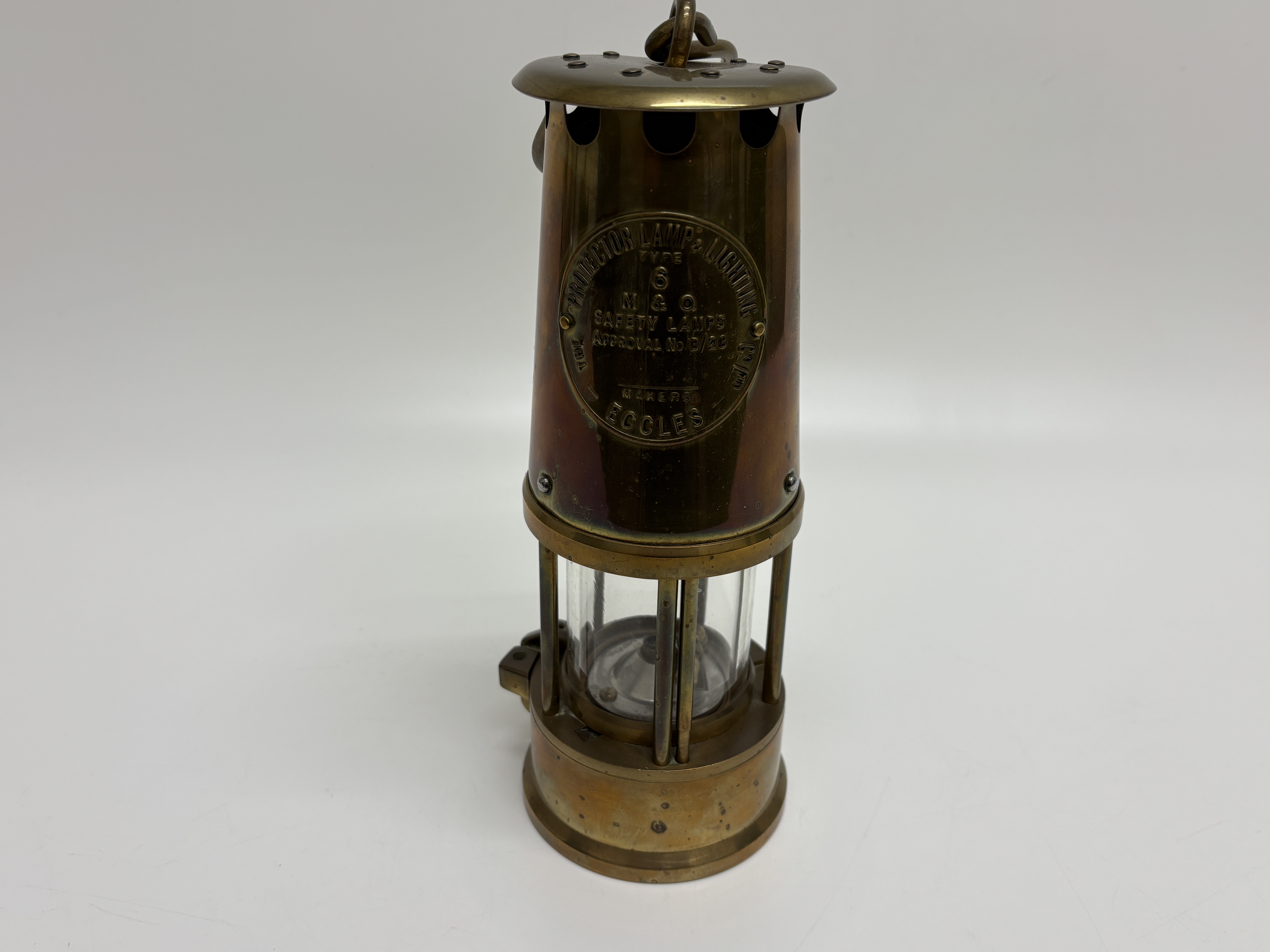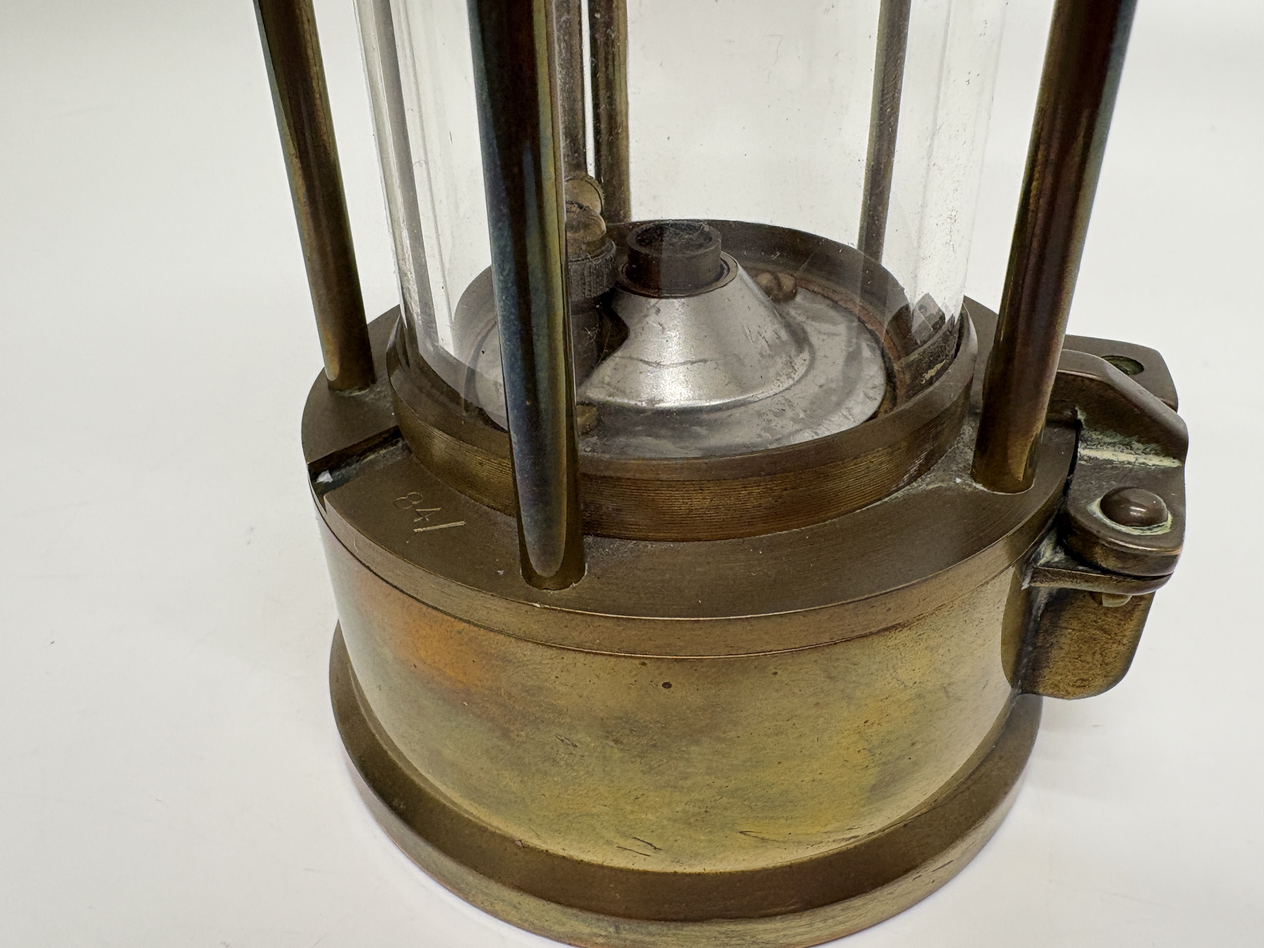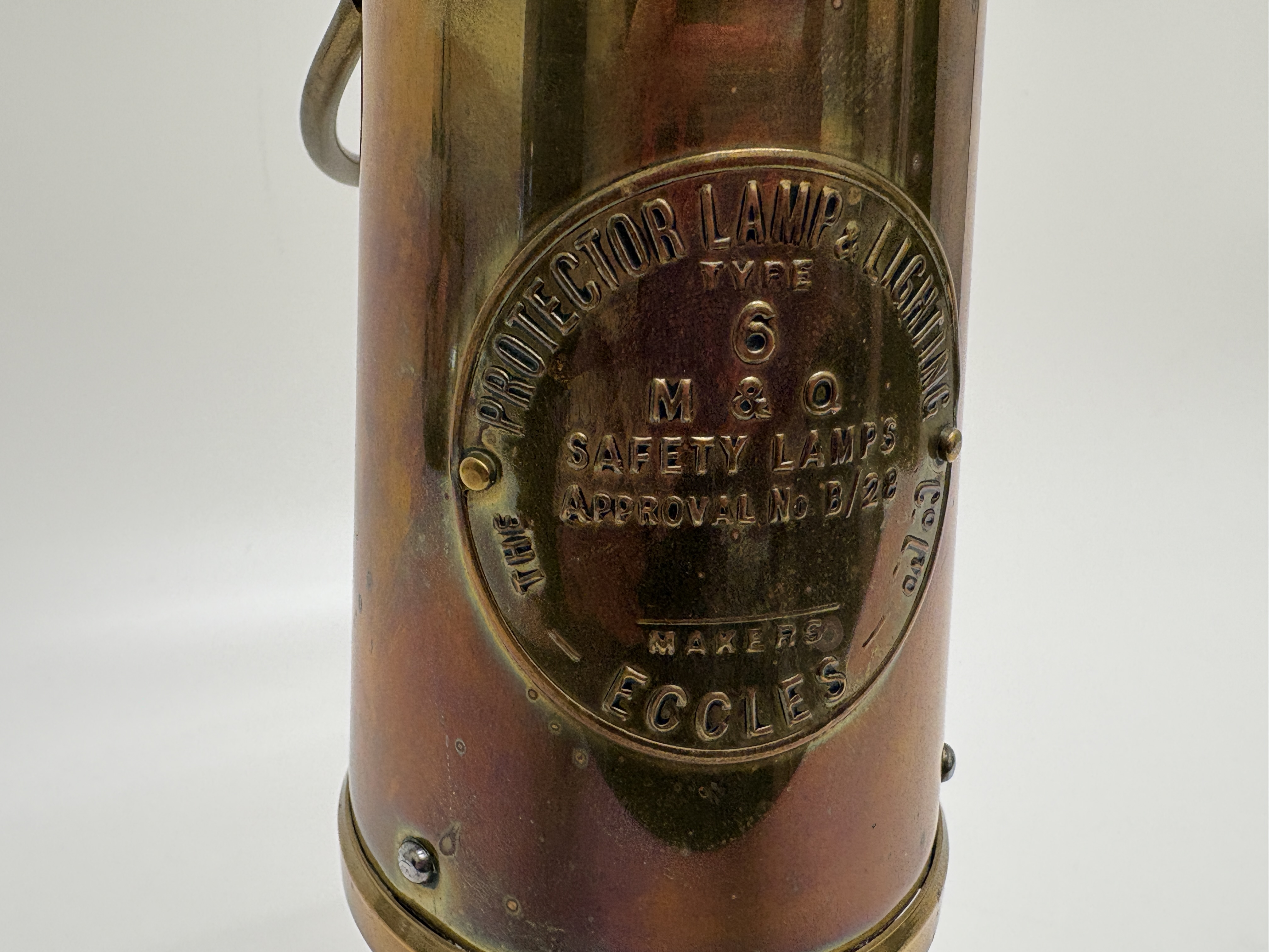 A Type 6 miner’s safety lamp manufactured by The Protector Lamp & Lighting Co. Ltd, Eccles. The lamp is constructed primarily of brass with a cylindrical glass chimney and internal burner components. The upper brass bonnet features an embossed manufacturer’s plaque identifying it as a Type 6 M & Q Safety Lamps Approval No B/28. A stamped identification number 847 is visible on the upper rim of the base. The design includes a top hanging loop and a side locking mechanism.