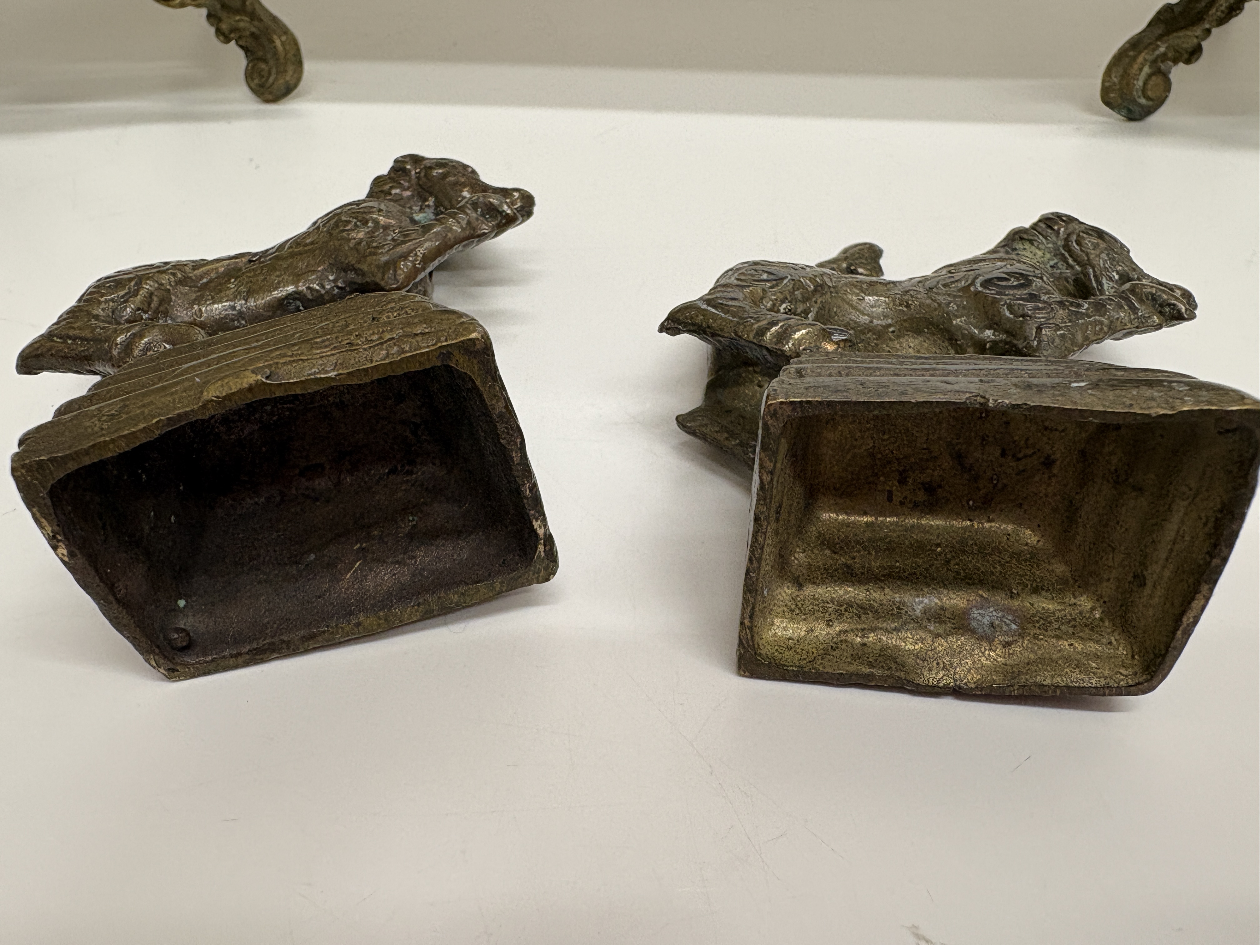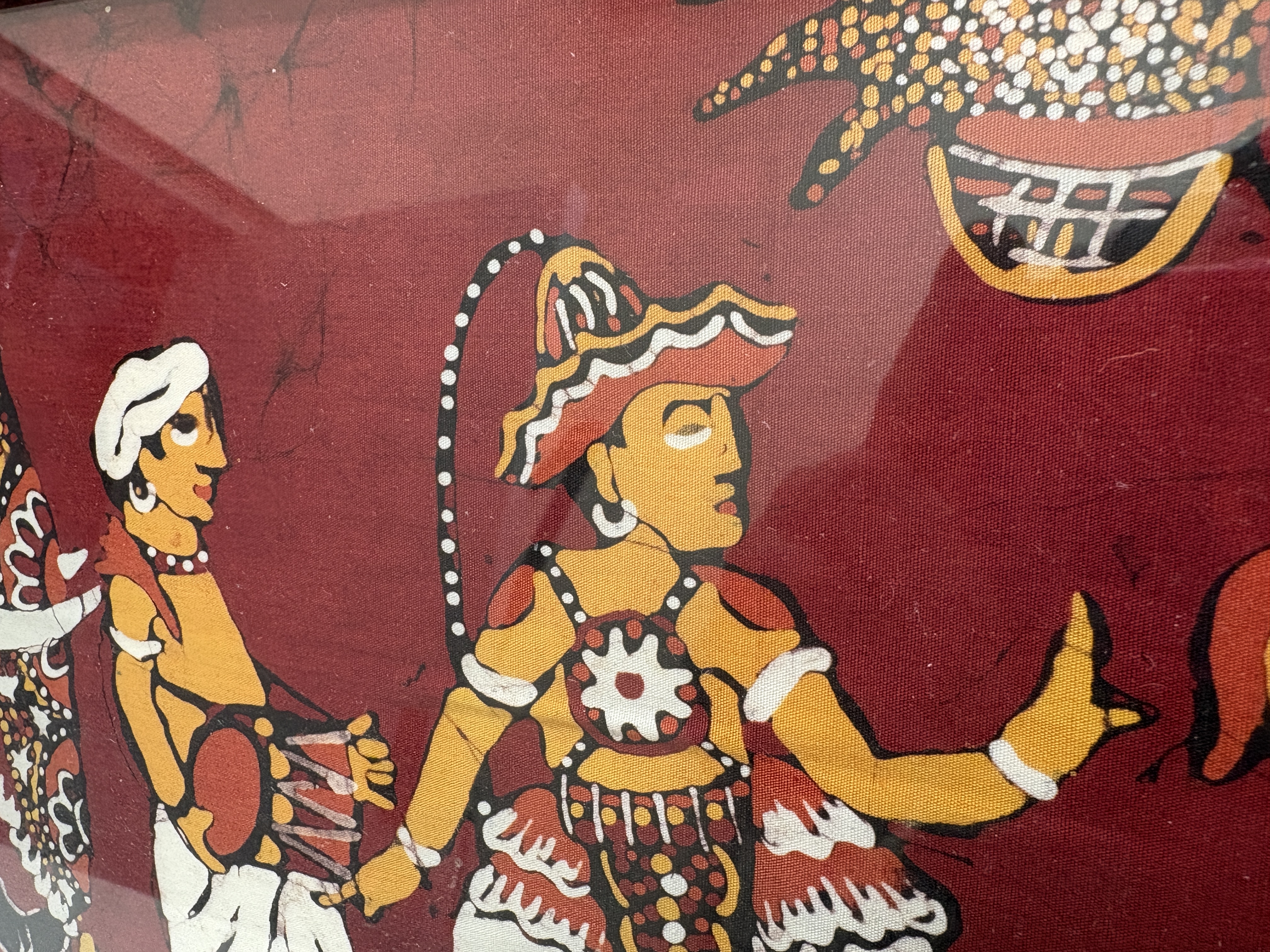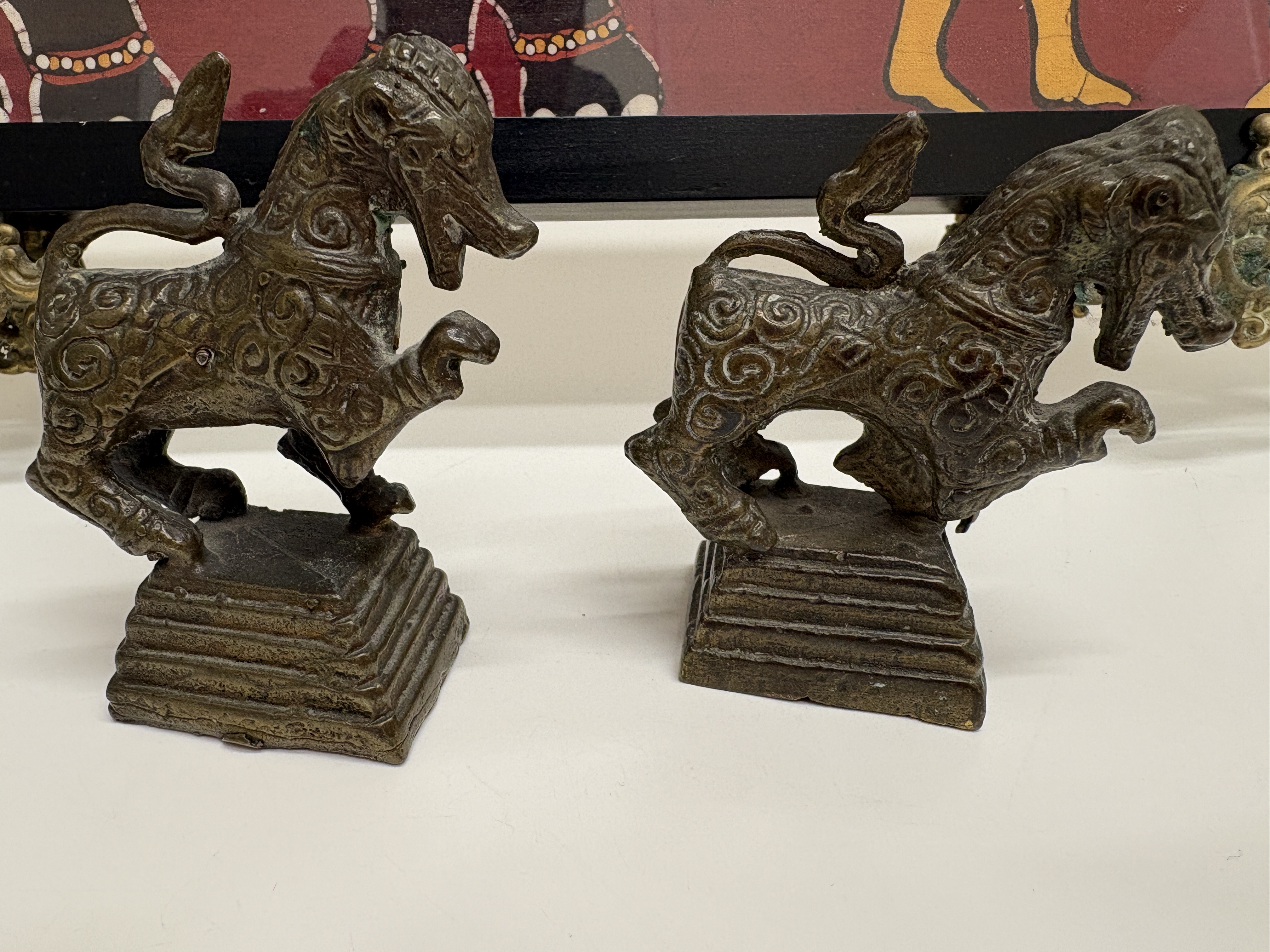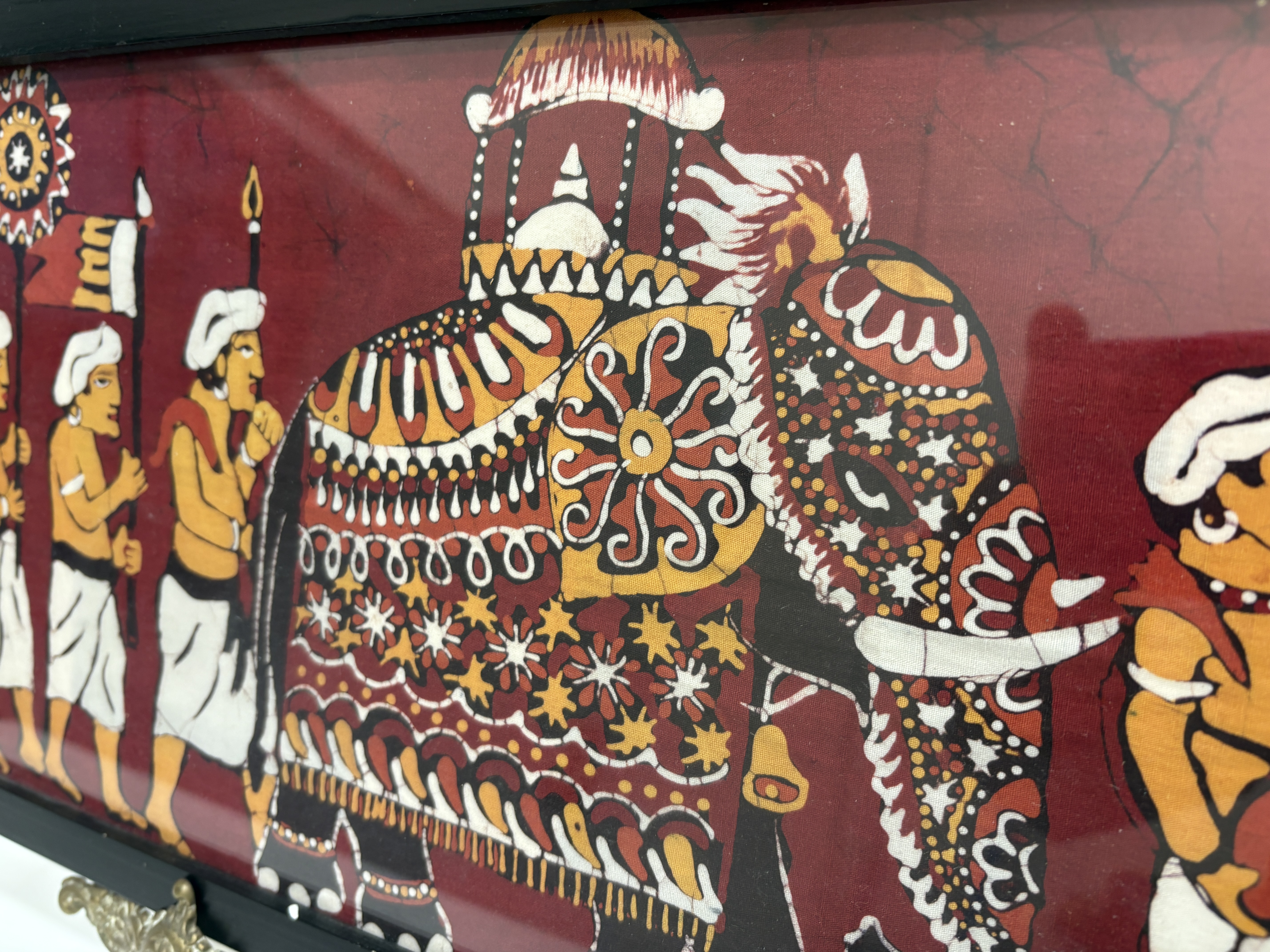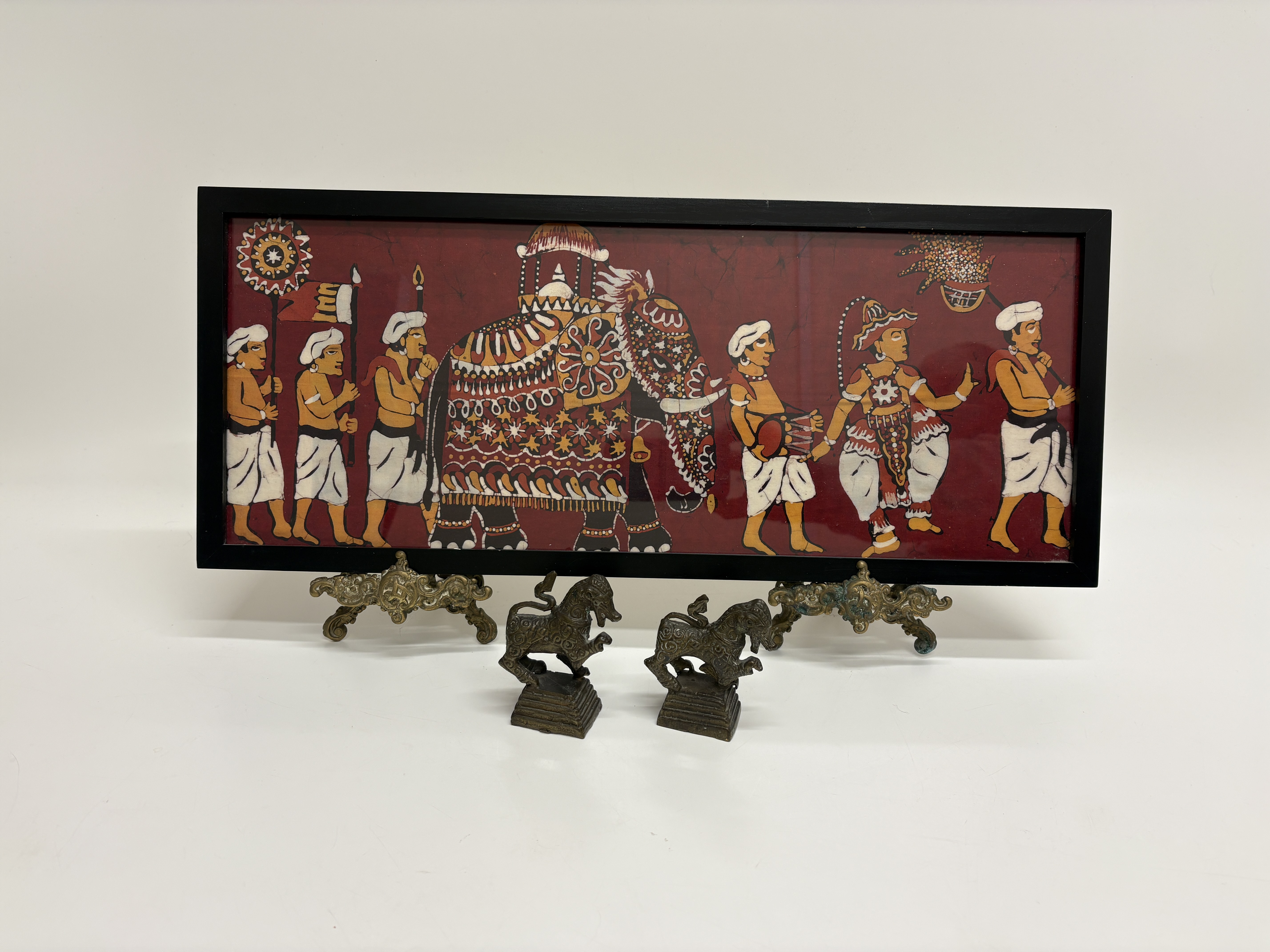 A framed batik textile artwork depicting a traditional South Asian ceremonial procession. The scene features an ornately caparisoned elephant flanked by human figures in stylised attire, including musicians and attendants. The composition is executed on a deep red background with intricate white and yellow patterns, showing the distinctive crackle effect characteristic of the batik wax-resist dyeing process. The textile is housed within a rectangular black-finished frame. Accompanying the artwork is an assortment of cast metal items, including figurines of lions or mythological singhas in rampant poses set upon tiered rectangular bases. Also included are ornate scrolling metal display stands. The metal components feature a dark bronze-toned finish.