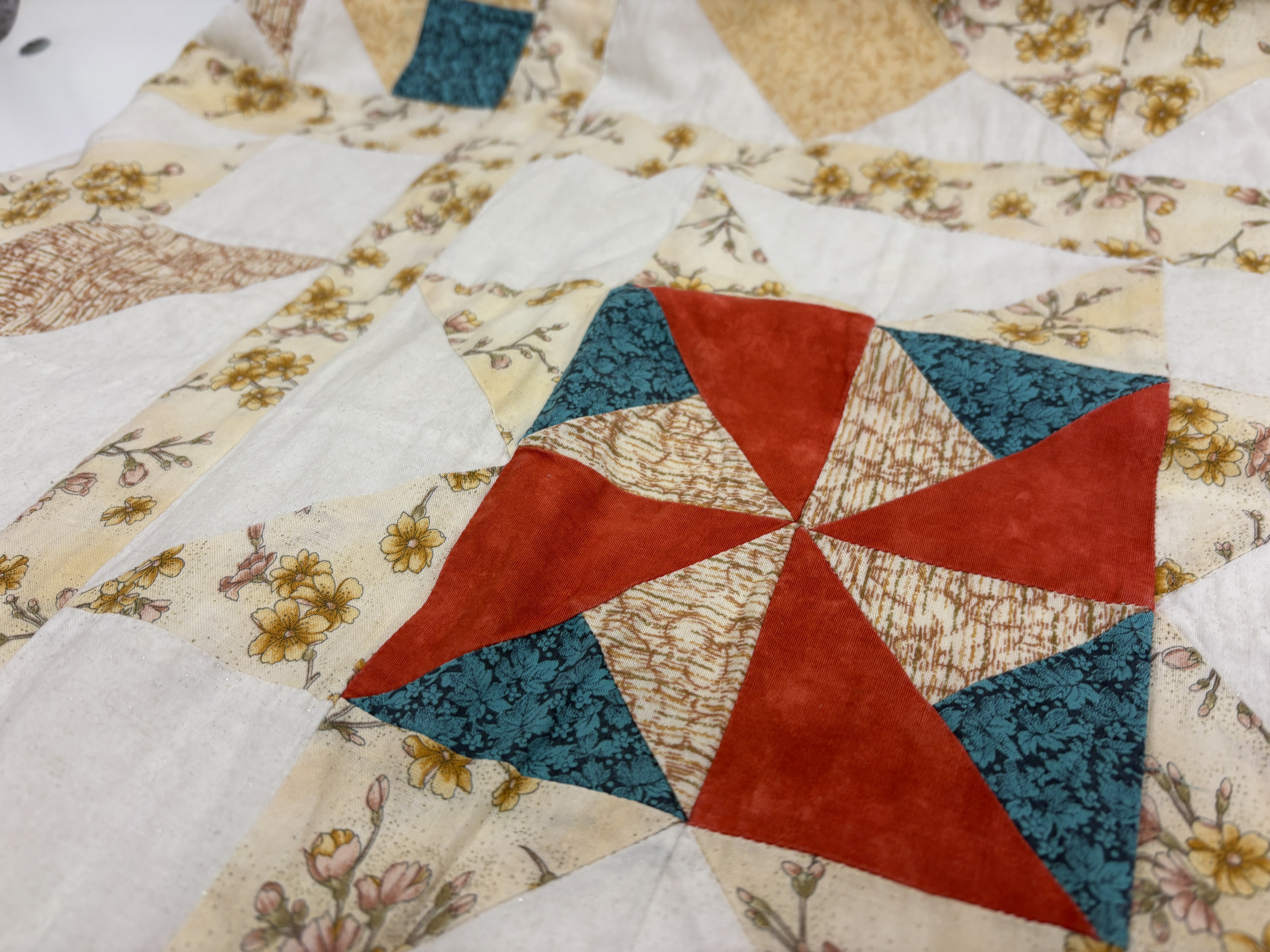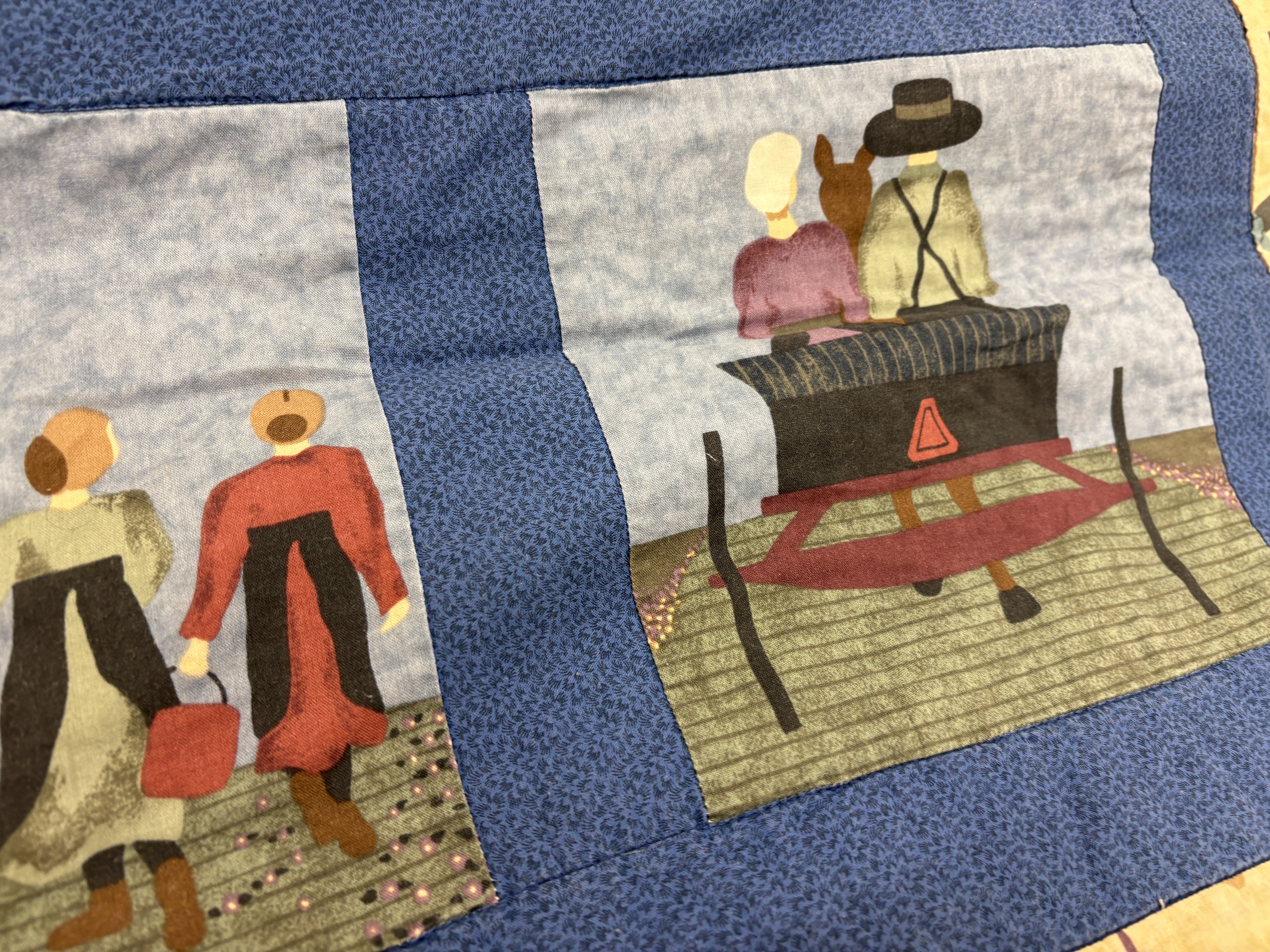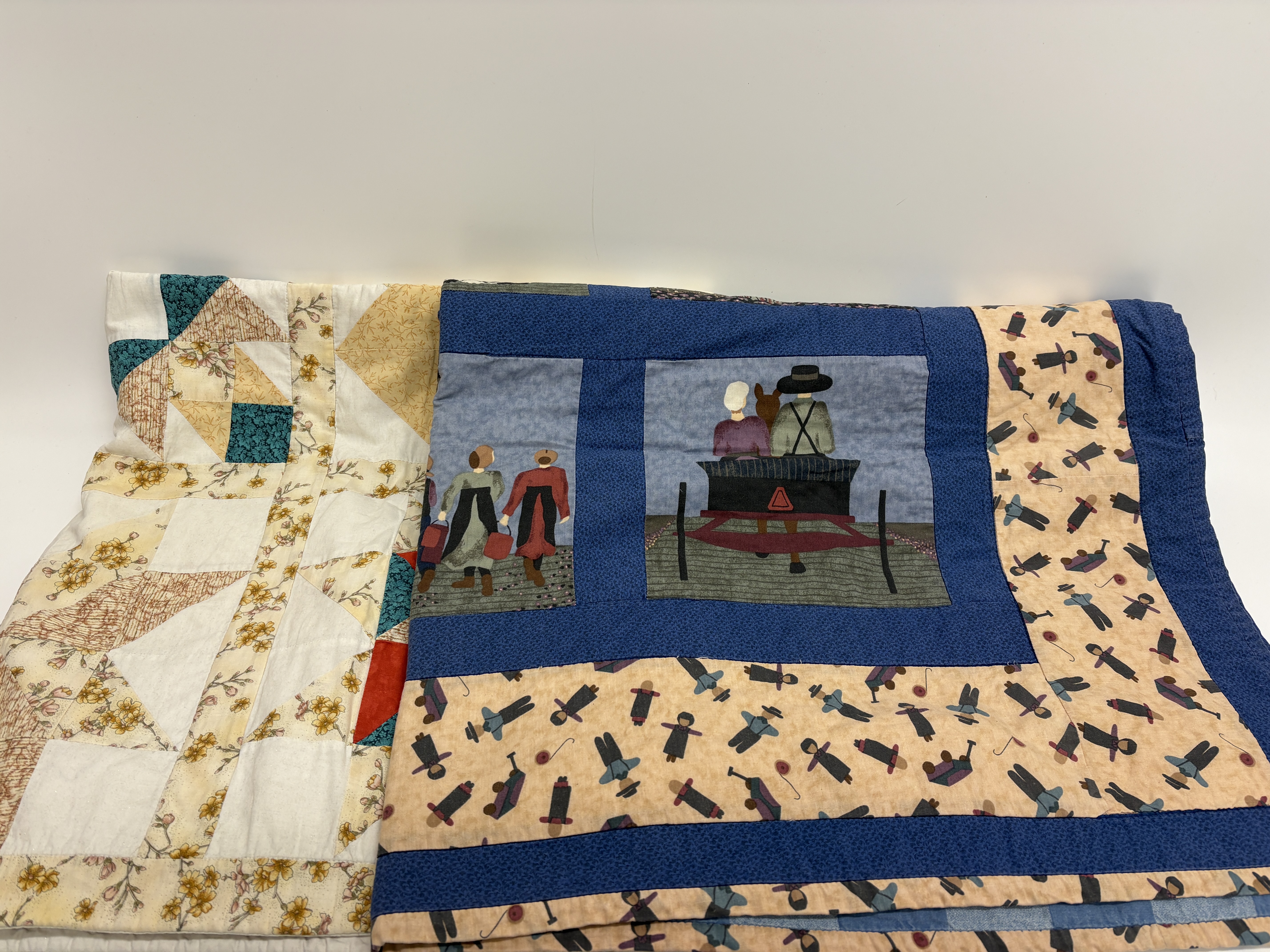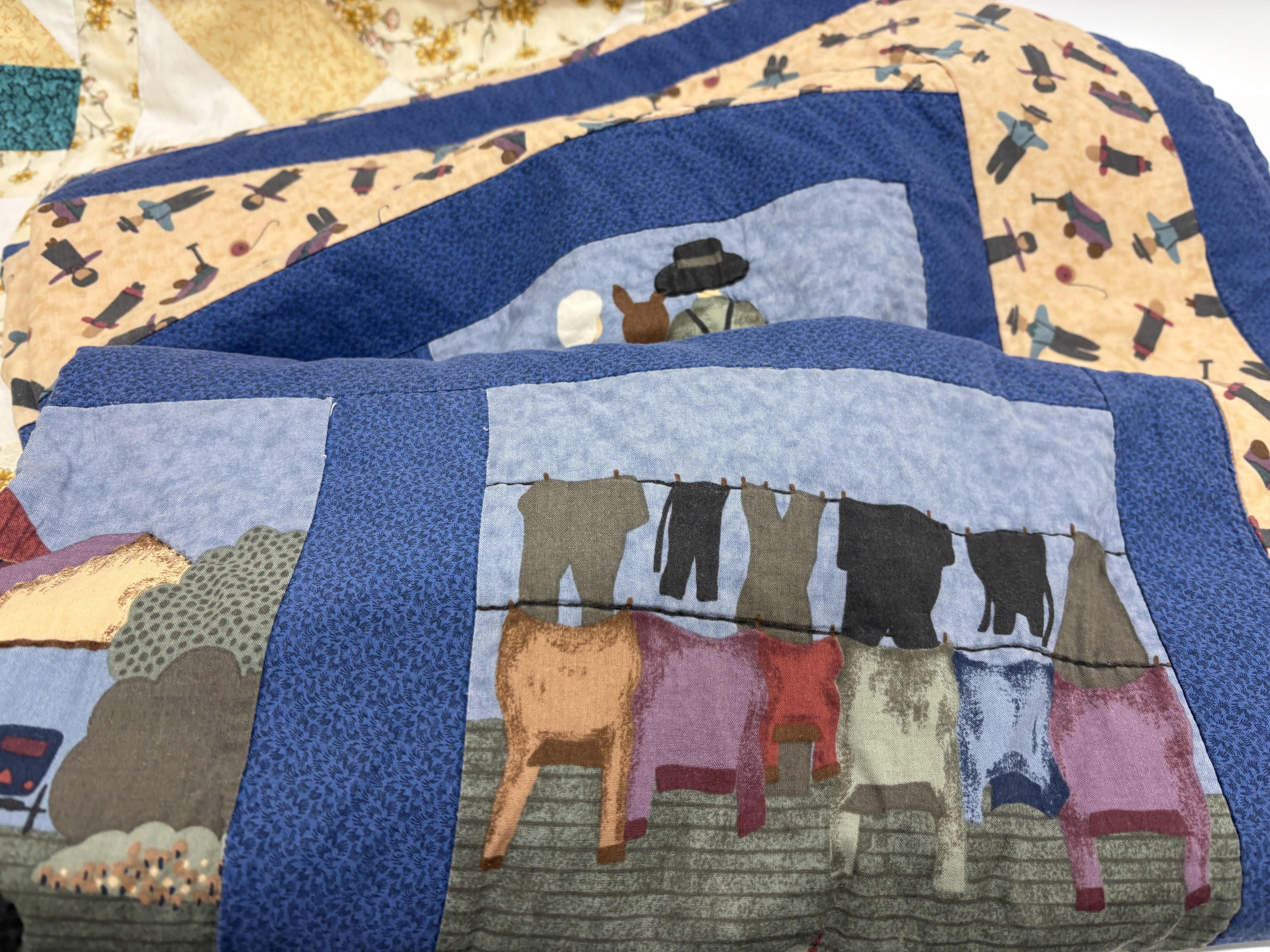 A pair of decorative quilts constructed from various cotton-blend fabrics. The first quilt features a traditional geometric patchwork design incorporating pinwheel and star motifs. The colour palette includes cream, tan, red, and teal, with a variety of floral and textured fabric patterns. The second quilt is a pictorial piece composed of blocks depicting Amish-themed scenes, including a horse-drawn buggy, figures walking with baskets, and laundry hanging on a line. This pictorial quilt is finished with a blue border and an accent fabric featuring repeating miniature human figures.