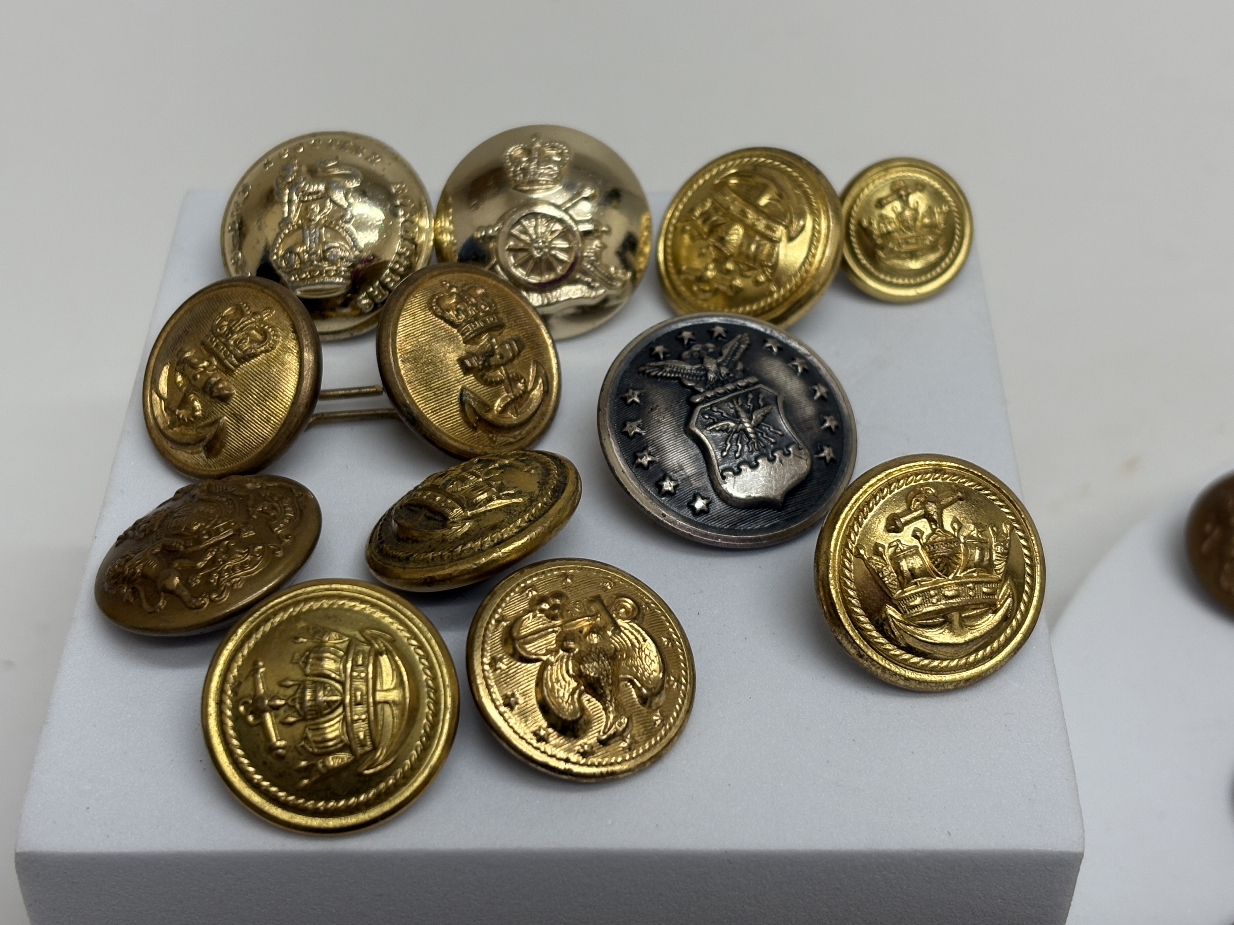 A collection of antique and vintage uniform buttons, primarily constructed of gilt brass or bronze-toned metal, with several examples in silver-toned or nickel-plated metal, and one button finished in black enamel. The collection represents various naval, military, and possibly civilian organizations, featuring prominent motifs such as British/Commonwealth crowns, anchors, ships, Royal Crests, and eagles (including US military style). Specific visible markings include a silver-toned button inscribed R.T.C. (likely Royal Tank Corps) and another bearing a U.S. Air Force-style emblem. The buttons are predominantly circular metal shank buttons, varying in size and finish.