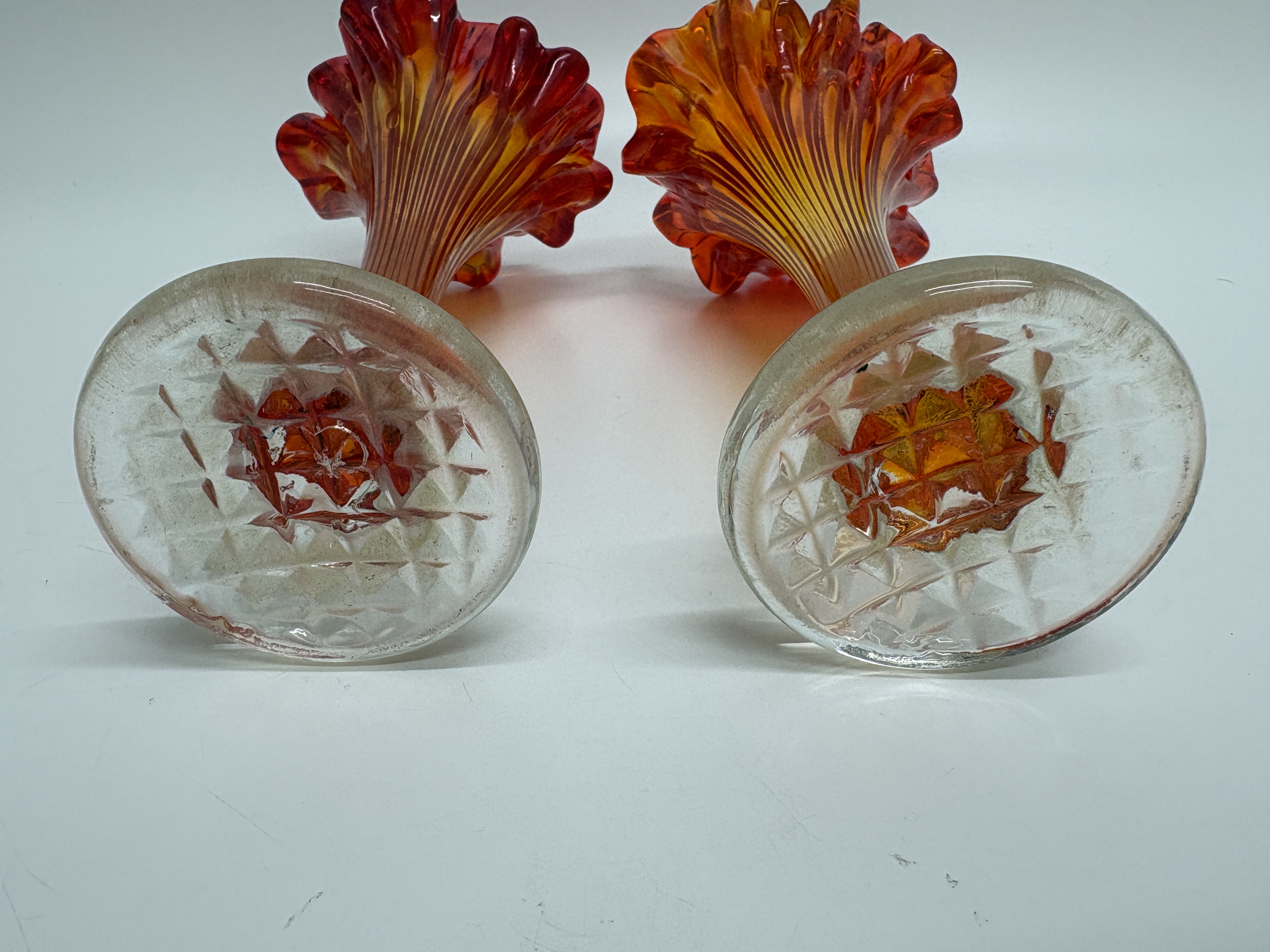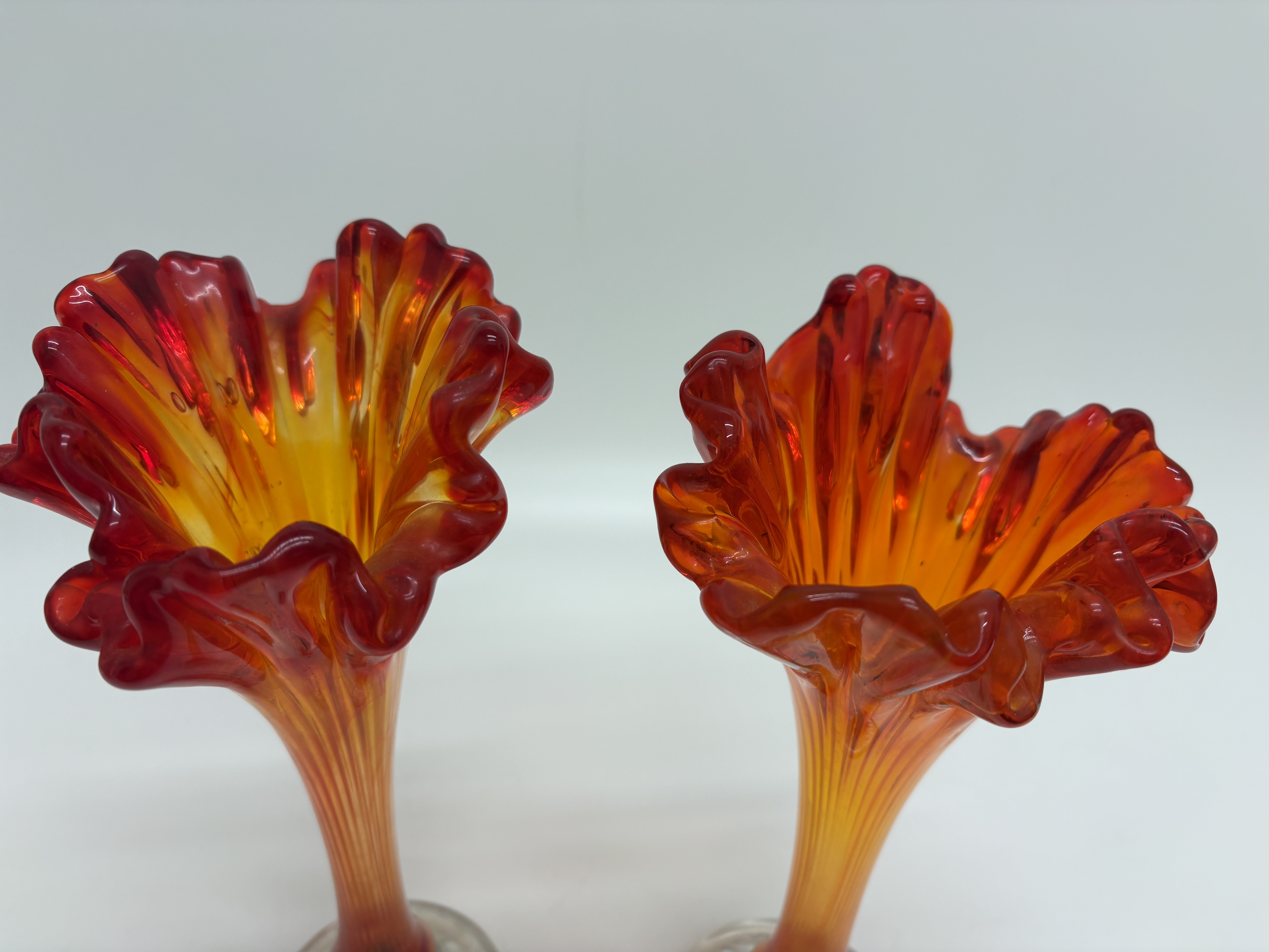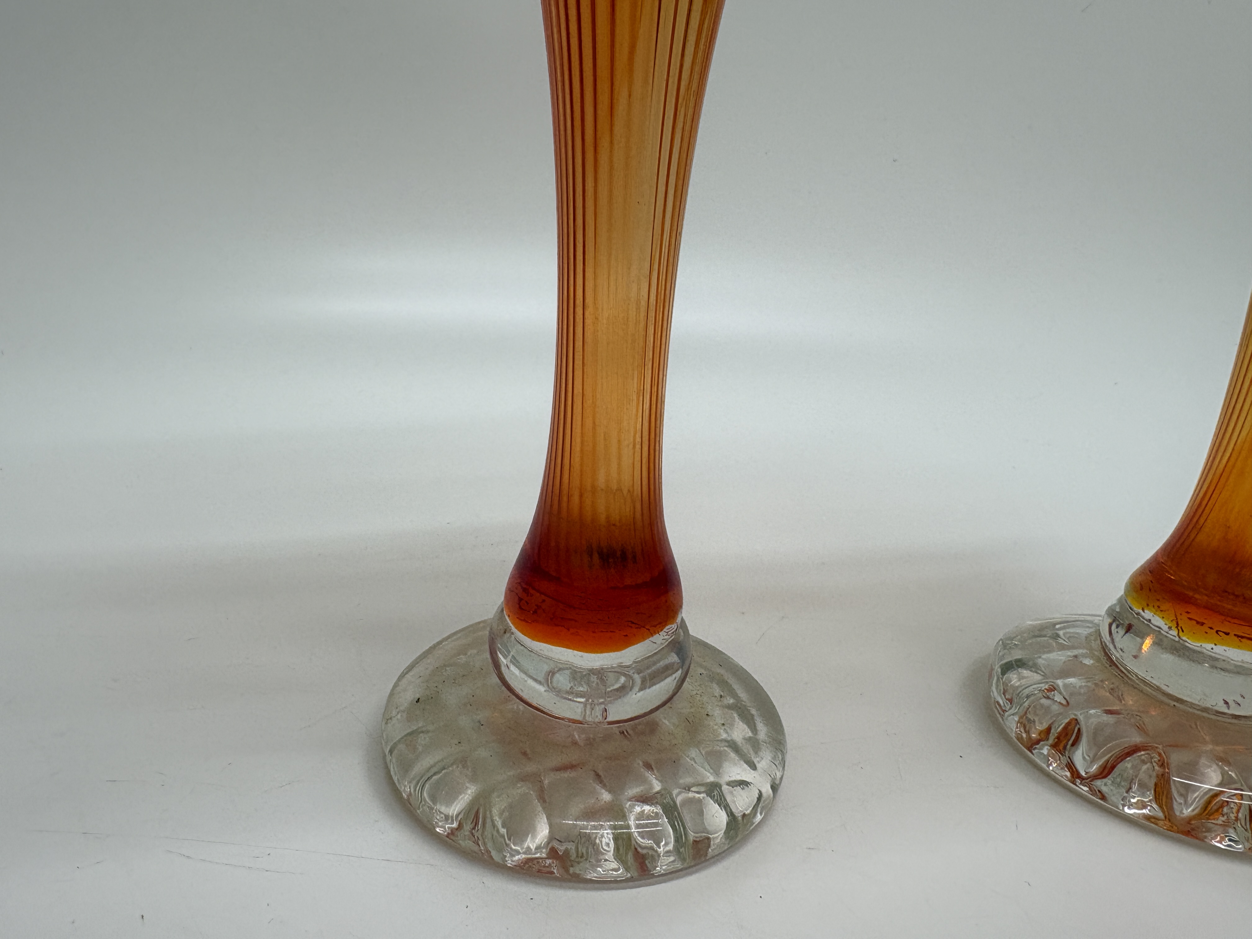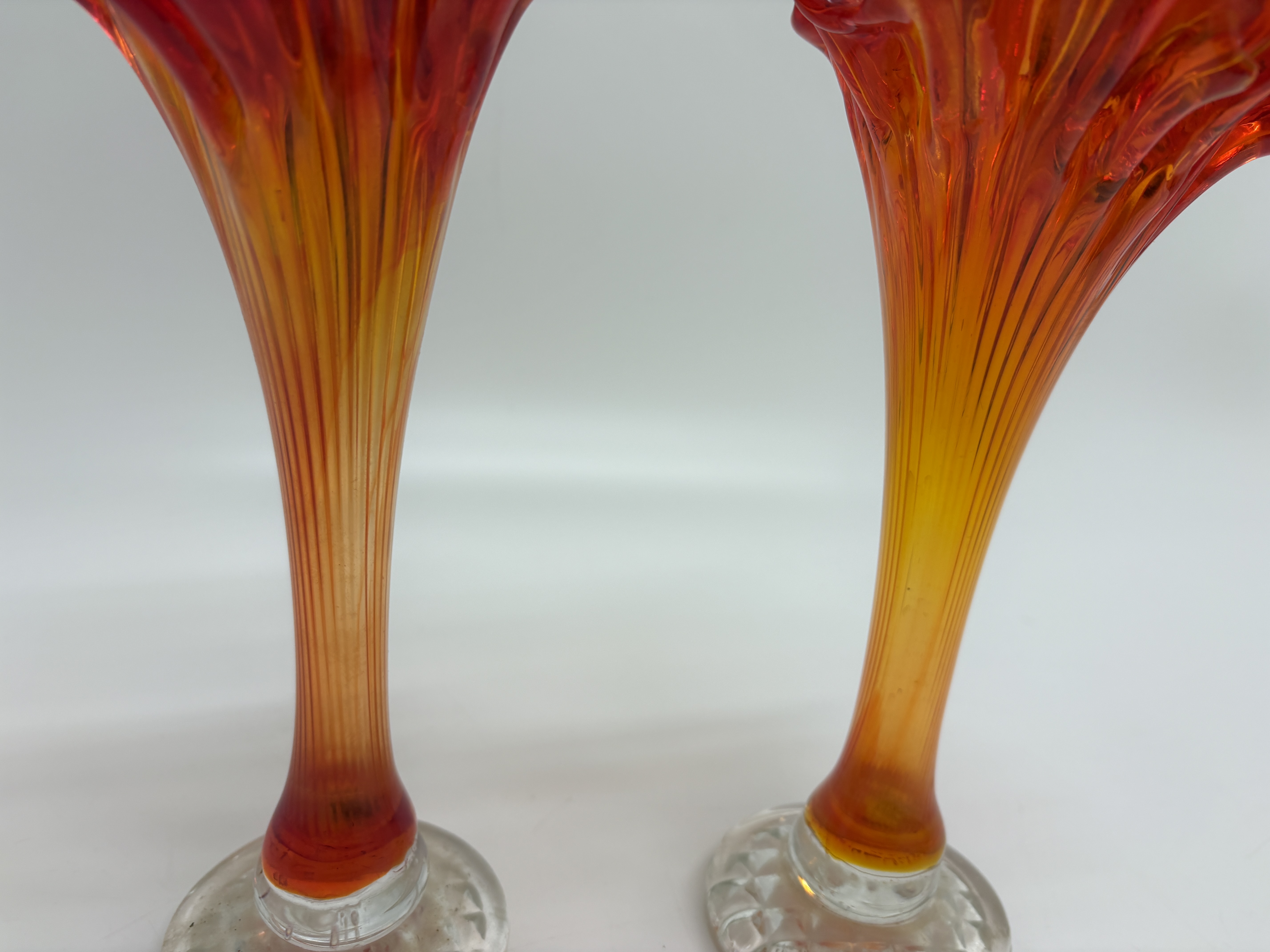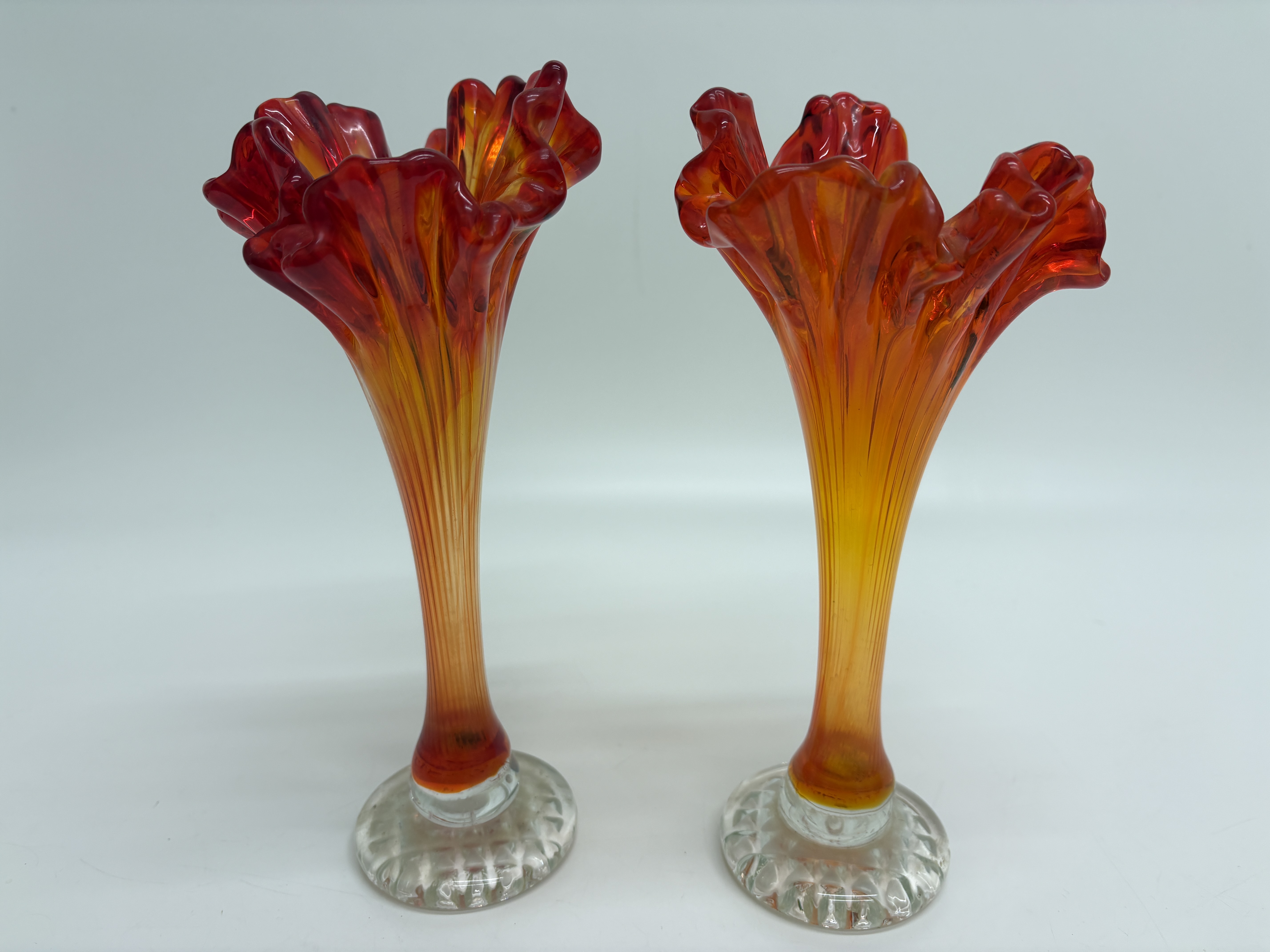 A pair of marigold carnival glass swung vases of Jack-in-the-Pulpit form, featuring ruffled and undulating rims. The glass displays a vibrant colour gradient ranging from deep red at the rims to a golden orange tone throughout the vertically ribbed, elongated stems. Each vase is set upon a clear, circular pressed-glass base with a diamond-cut pattern on the underside. No maker’s marks or signatures are visible.