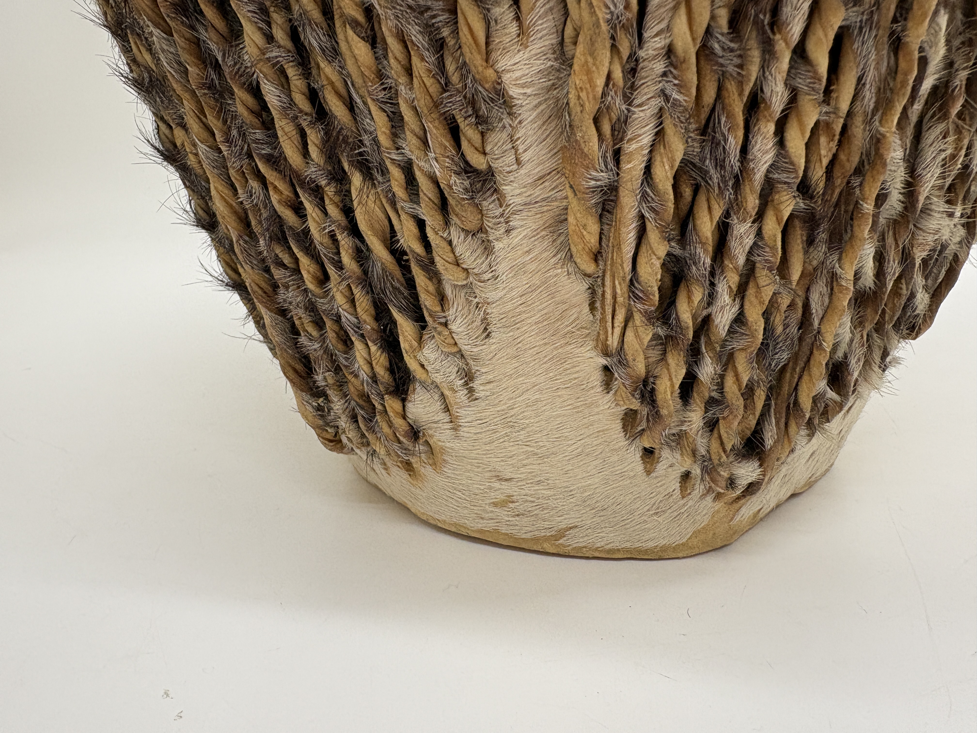 An African tribal djembe drum featuring a tapered wooden shell. The body is extensively wrapped in twisted hide or fibre cordage, providing both structural tension and a textured decorative finish. The drumhead and sections of the base are covered in animal hide that retains its natural hair, displaying a mottled brown and cream pattern. The item is constructed using traditional hand-assembly techniques. No markings or inscriptions are present.