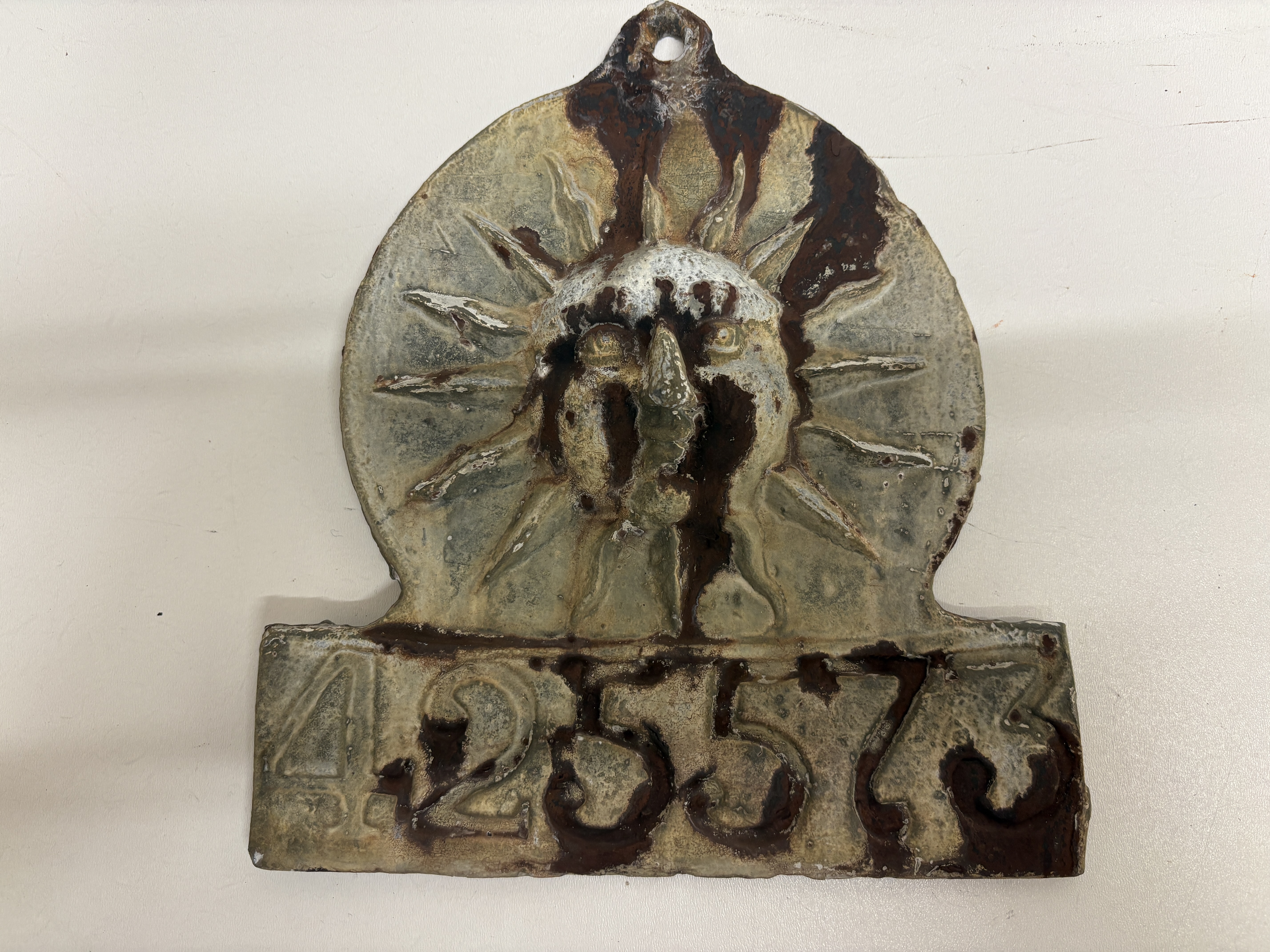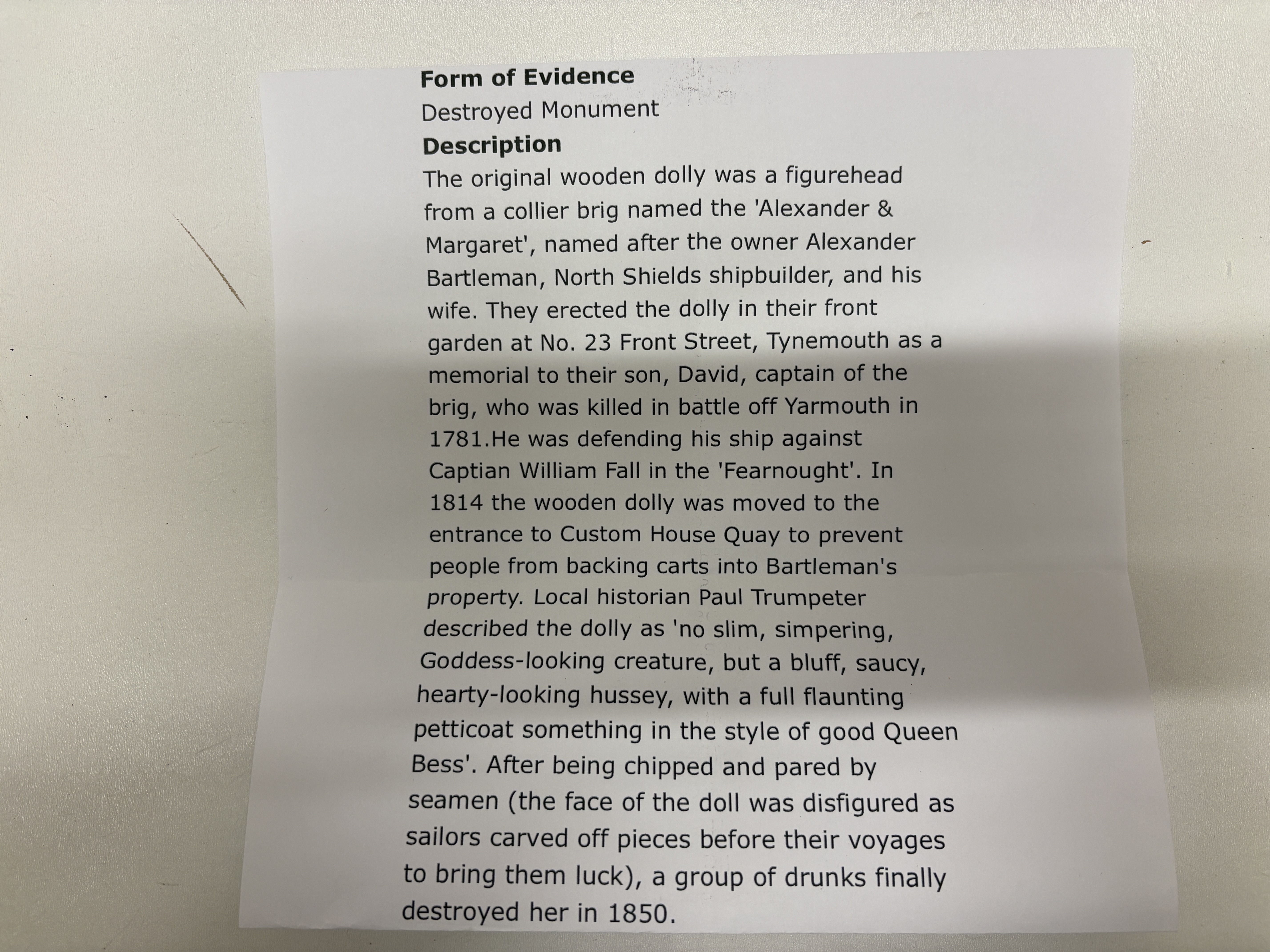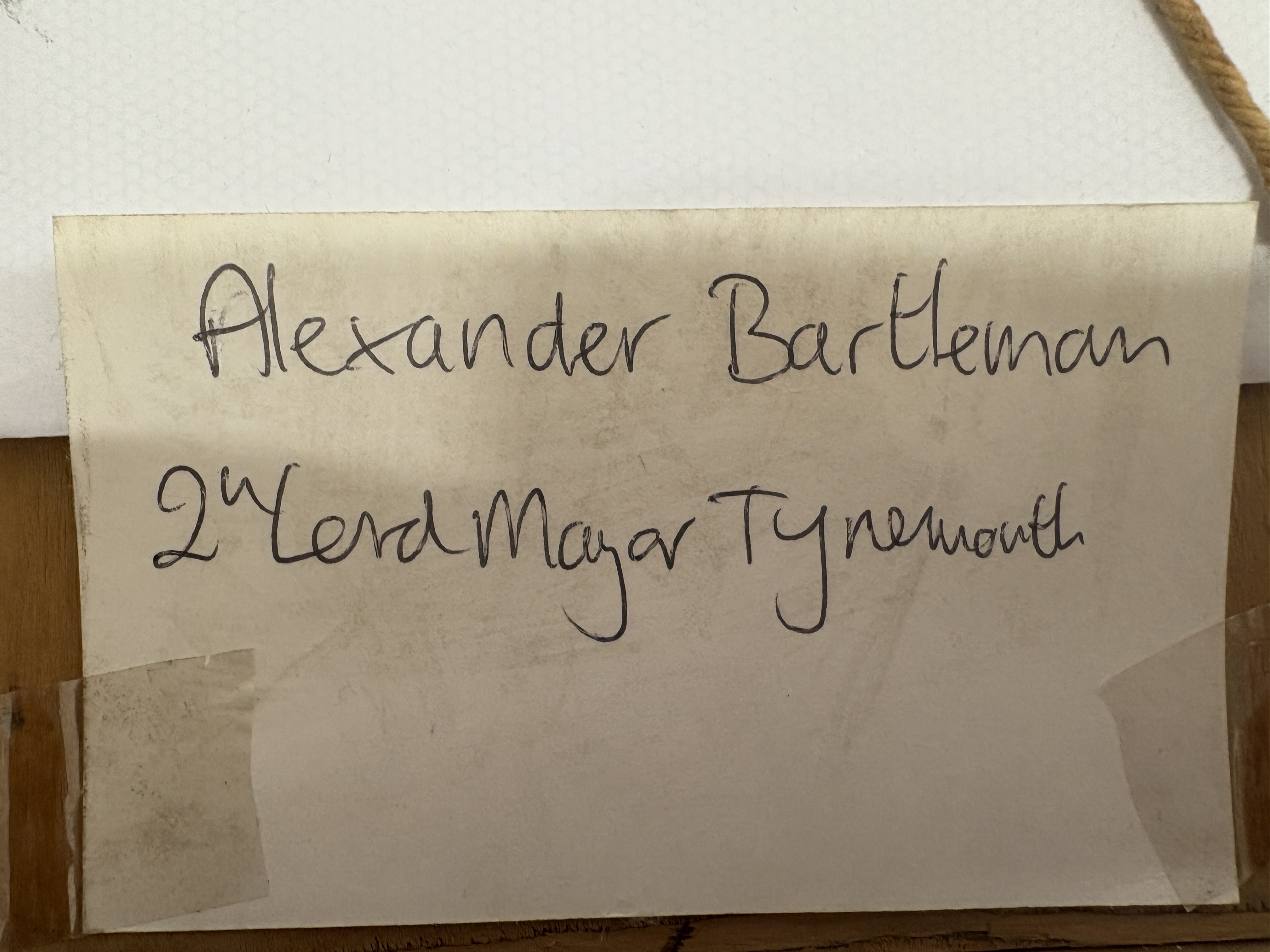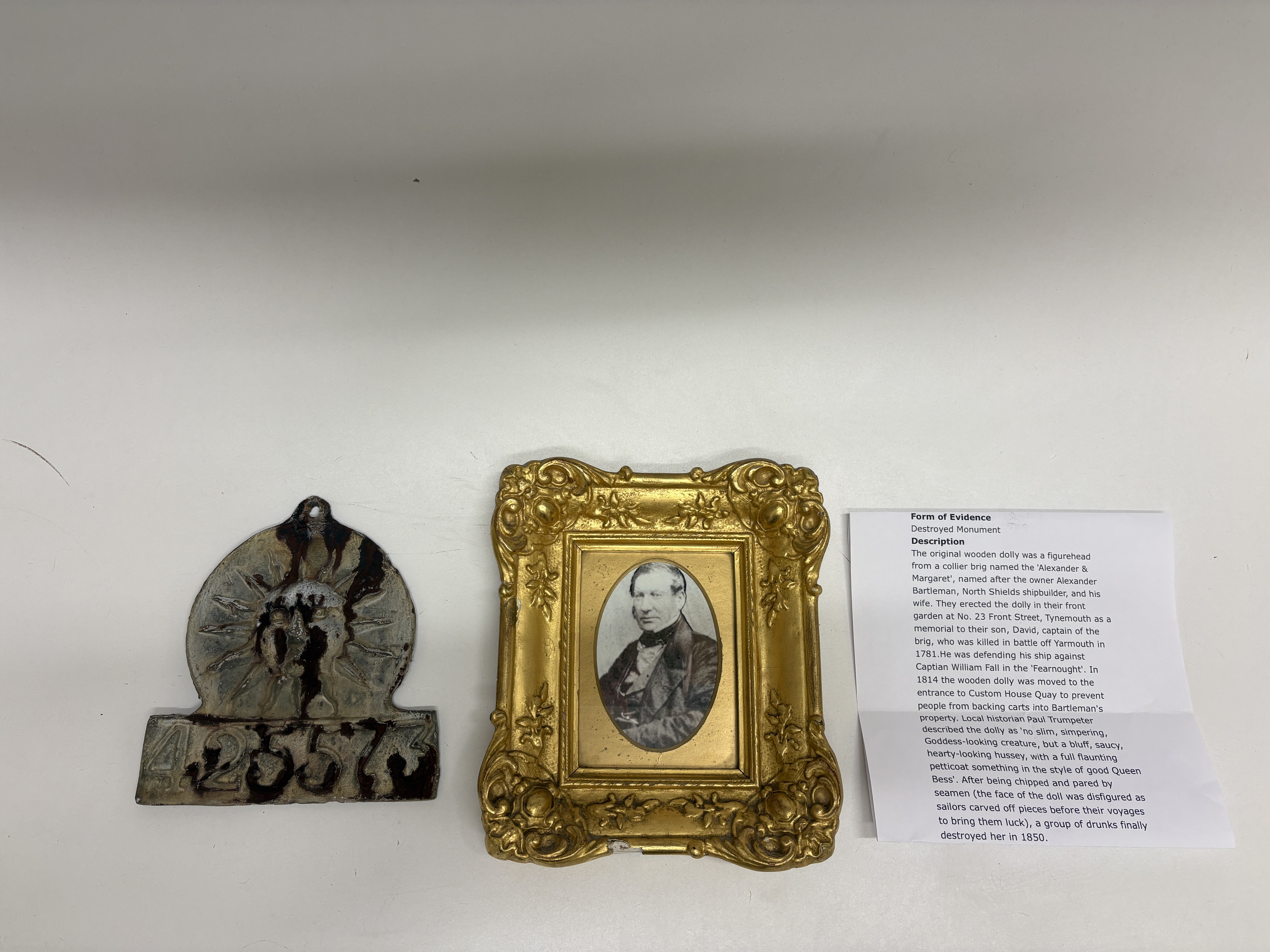 The cast metal insurance psunburst or face design above the raised numerals 42557. The plaque is likely a historical marker or fire mark and includes a single mounting hole at the top. The framed item is a small, square, ornate gilded frame with molded decoration, housing an oval monochrome portrait photograph of a 19th-century gentleman. Based on visual comparison and research, the photograph is likely an ambrotype or similar early photographic process. Affixed to the back of the frame is a handwritten slip identifying the subject as Alexander Bartleman / 24 Lord Mayor Tynemouth. The grouping is accompanied by a modern informational sheet titled Form of Evidence, which provides historical context regarding a destroyed figurehead monument associated with Alexander Bartleman, a North Shields shipbuilder. See building for original location on Tynemouth Front Street the Olld Wine Chamber Bui;ding – on the wall in the middle of the picture