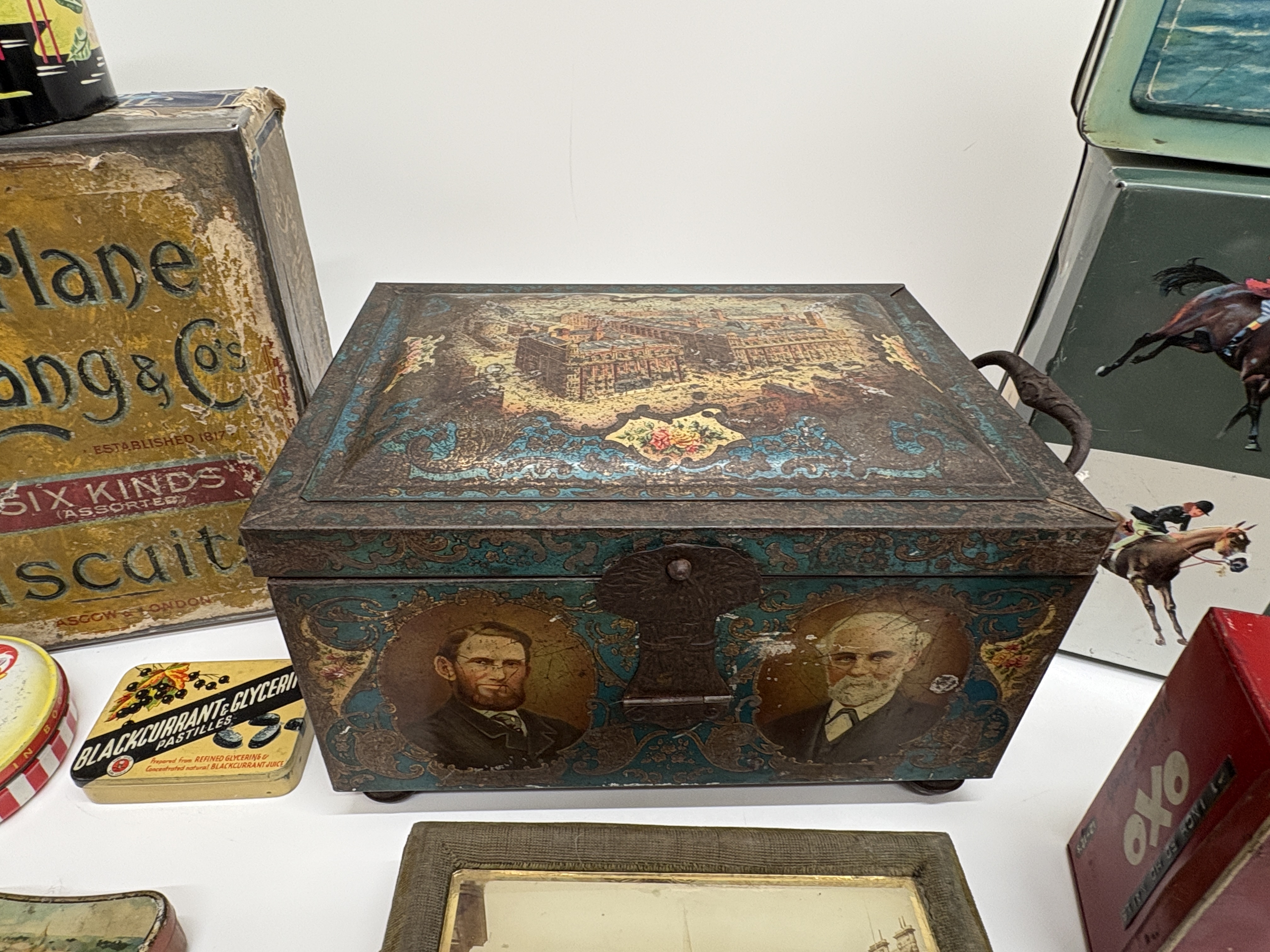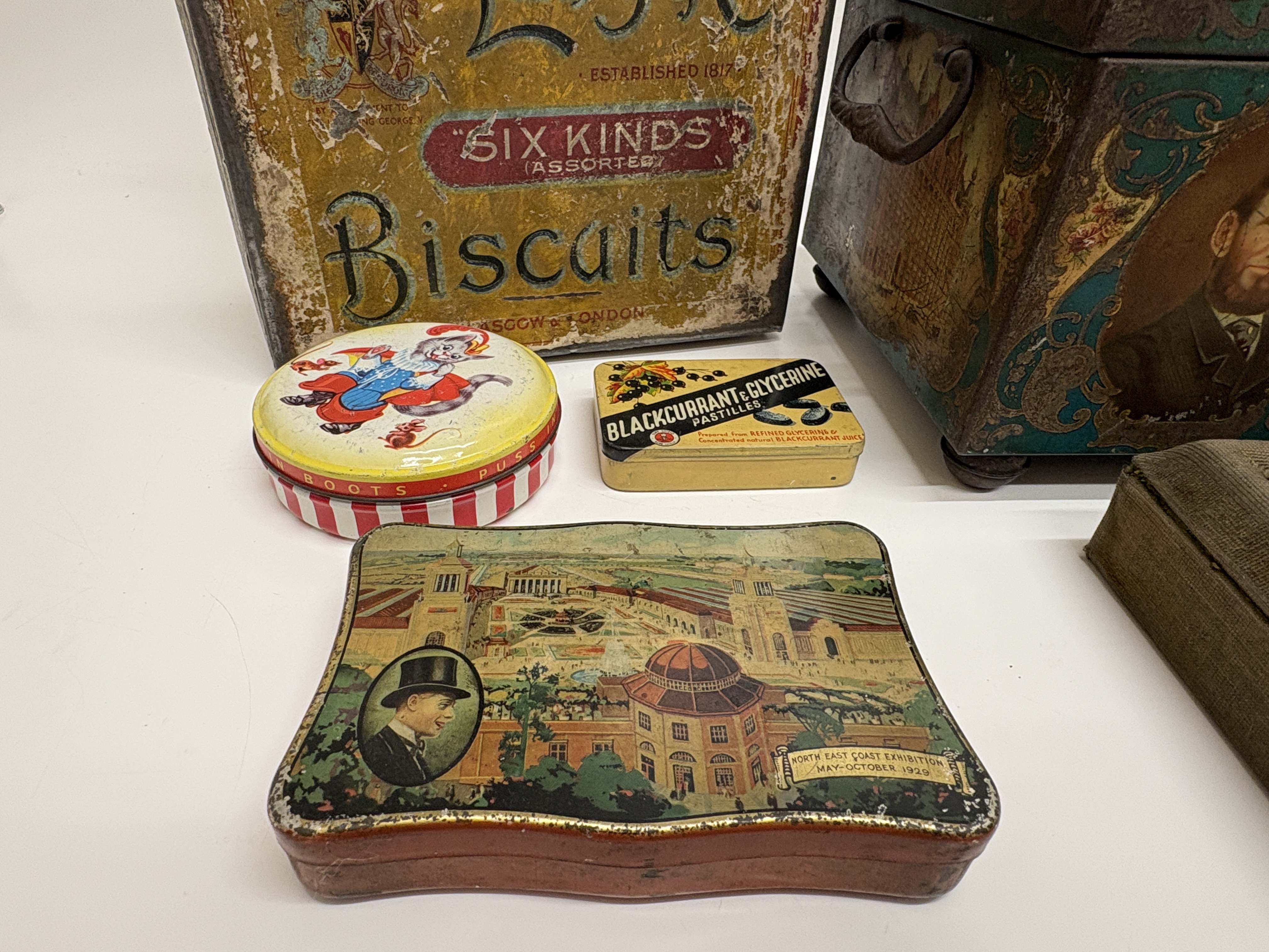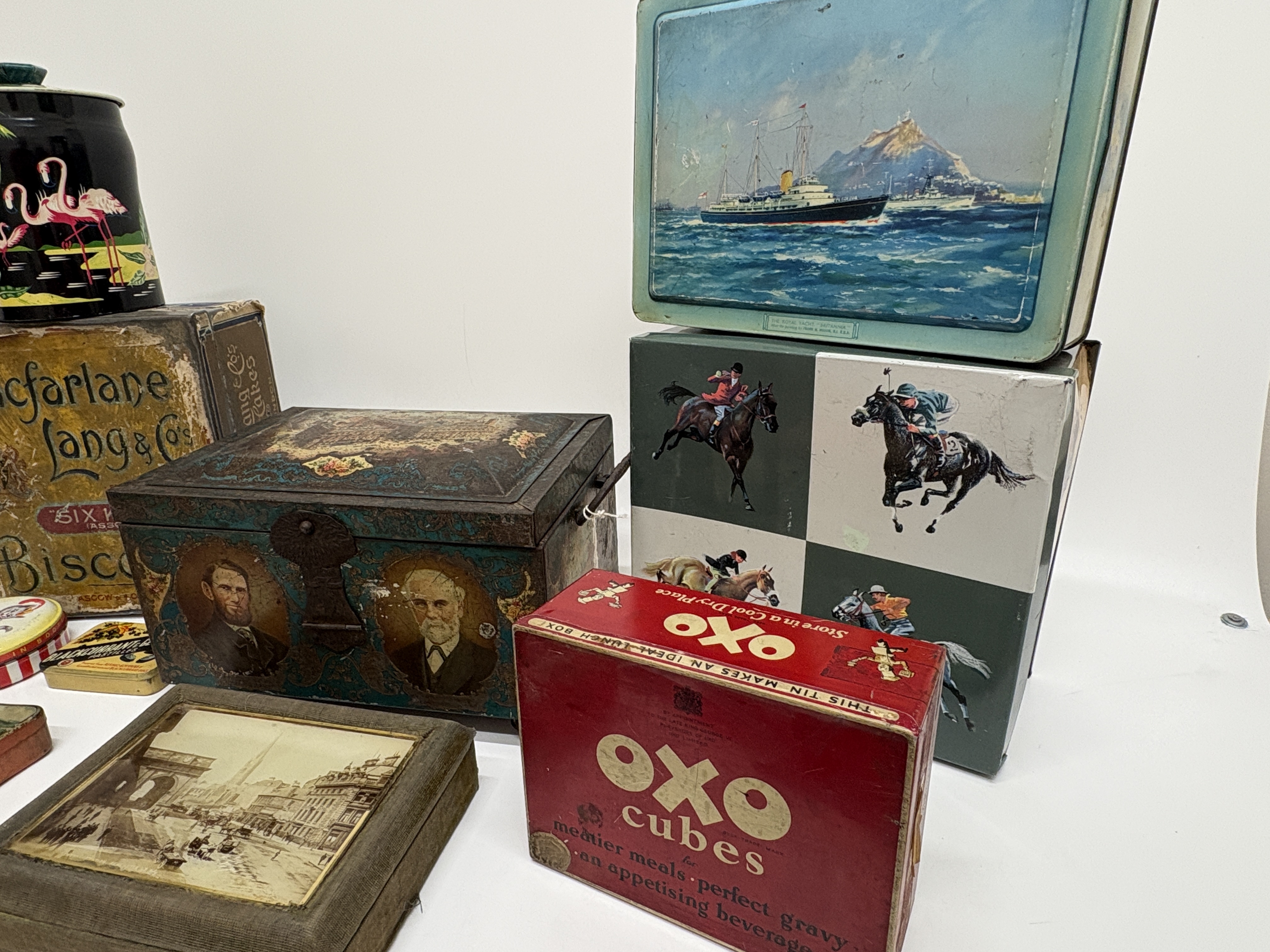 A diverse assembly of lithographed tinplate advertising and souvenir containers reflecting British commercial history. The centrepiece is an ornate, footed metal chest produced for the Co-operative Wholesale Society (CWS) to commemorate their Jubilee (1863-1913), featuring a hinged lid depicting a stately home and portraits of society founders on the front panel. Also included is a large Macfarlane Lang & Co. Biscuits tin from Glasgow & London, bearing the Royal Warrant for King George V; a red OXO Cubes kitchen tin; and a rectangular souvenir tin depicting the Royal Yacht Britannia at sea. Smaller examples comprise a 1929 North East Coast Exhibition souvenir tin, a medicinal Blackcurrant & Glycerine Pastilles tin, a Boots round tin featuring a Puss-in-Boots character, and a black cylindrical canister with a flamingo and palm tree motif. The lot is completed by a square equestrian-themed tin with horse-racing scenes and a fabric-covered presentation box inset with a glass-protected sepia photograph of Central Station, Newcastle upon Tyne.