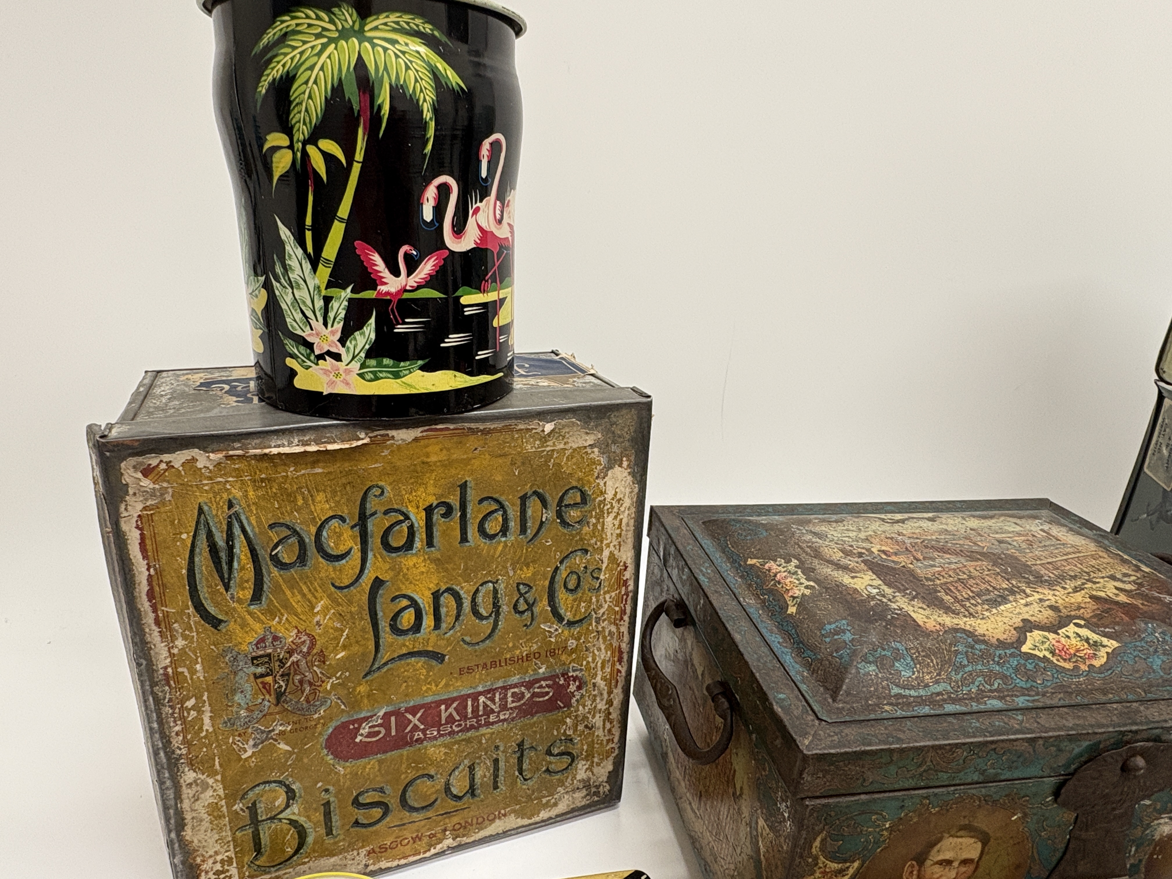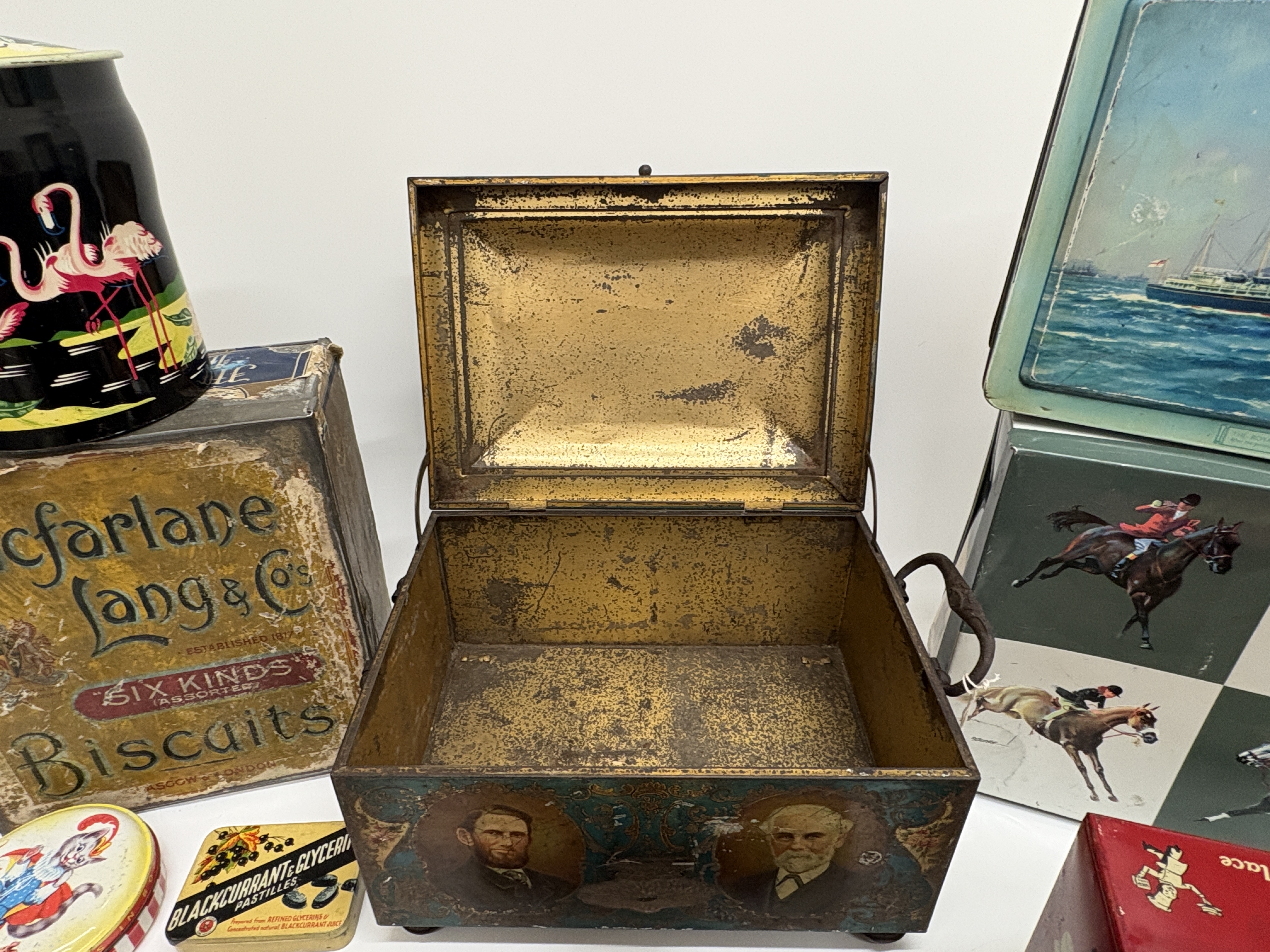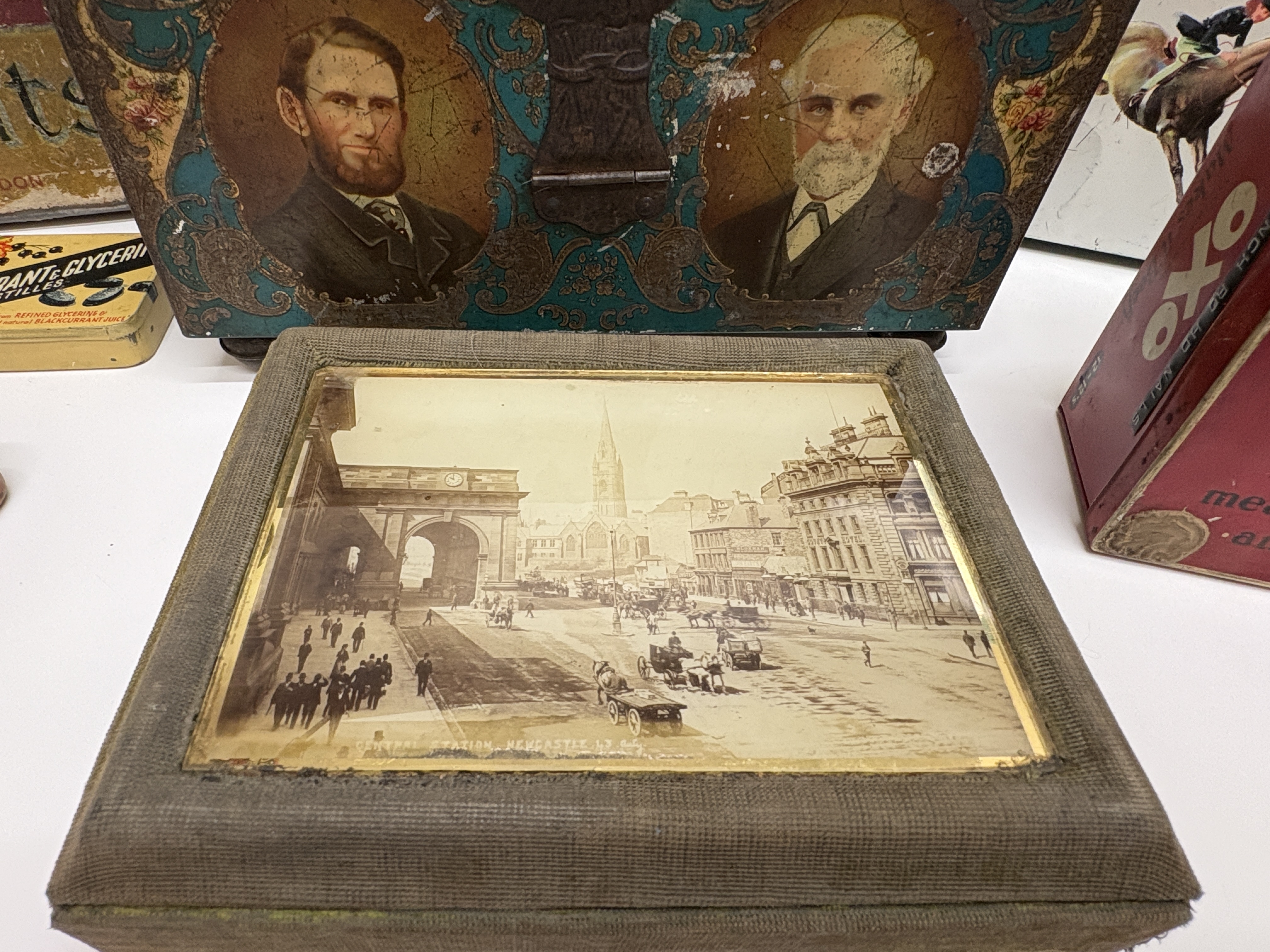 A diverse assembly of lithographed tinplate advertising and souvenir containers reflecting British commercial history. The centrepiece is an ornate, footed metal chest produced for the Co-operative Wholesale Society (CWS) to commemorate their Jubilee (1863-1913), featuring a hinged lid depicting a stately home and portraits of society founders on the front panel. Also included is a large Macfarlane Lang & Co. Biscuits tin from Glasgow & London, bearing the Royal Warrant for King George V; a red OXO Cubes kitchen tin; and a rectangular souvenir tin depicting the Royal Yacht Britannia at sea. Smaller examples comprise a 1929 North East Coast Exhibition souvenir tin, a medicinal Blackcurrant & Glycerine Pastilles tin, a Boots round tin featuring a Puss-in-Boots character, and a black cylindrical canister with a flamingo and palm tree motif. The lot is completed by a square equestrian-themed tin with horse-racing scenes and a fabric-covered presentation box inset with a glass-protected sepia photograph of Central Station, Newcastle upon Tyne.