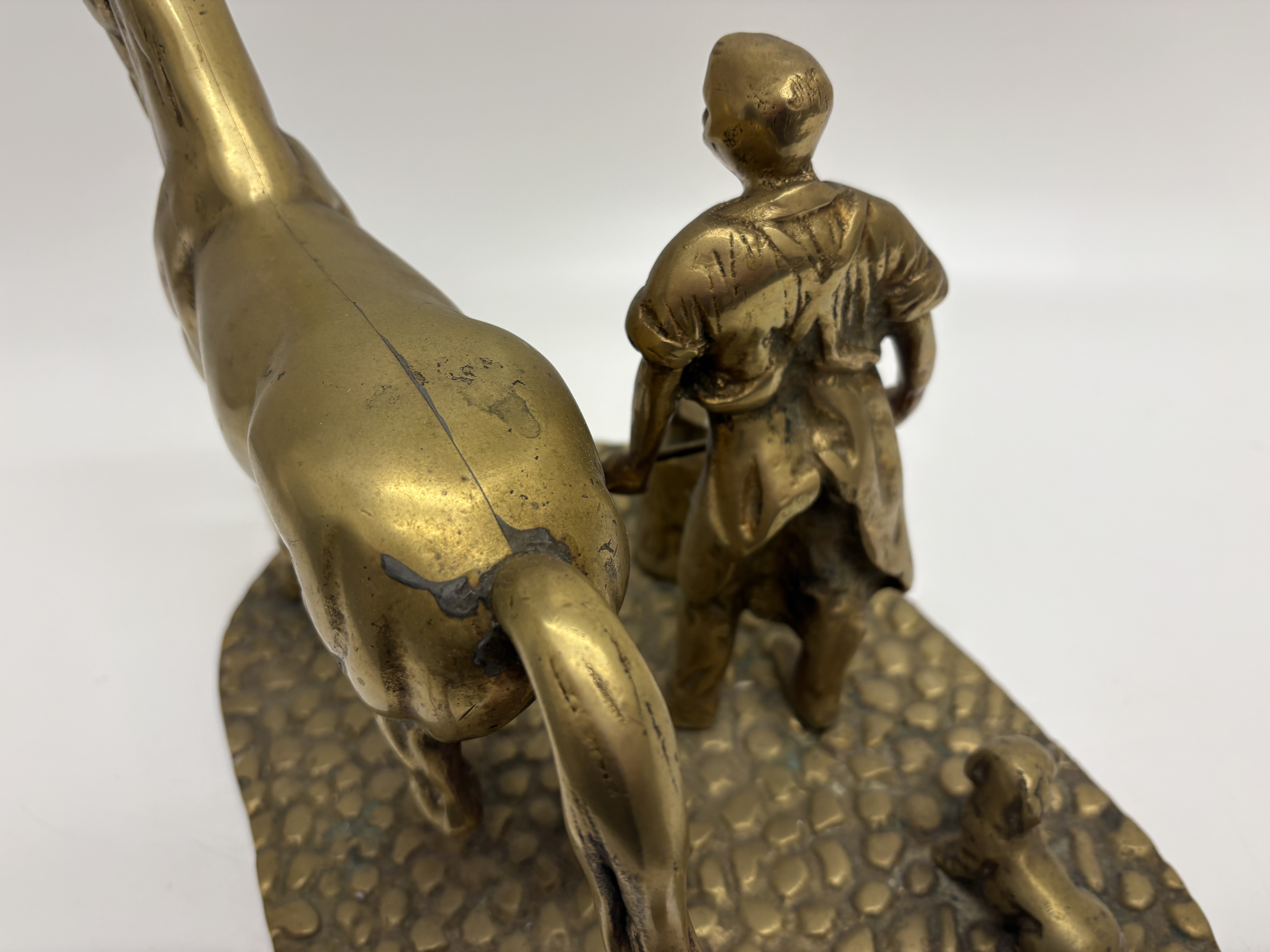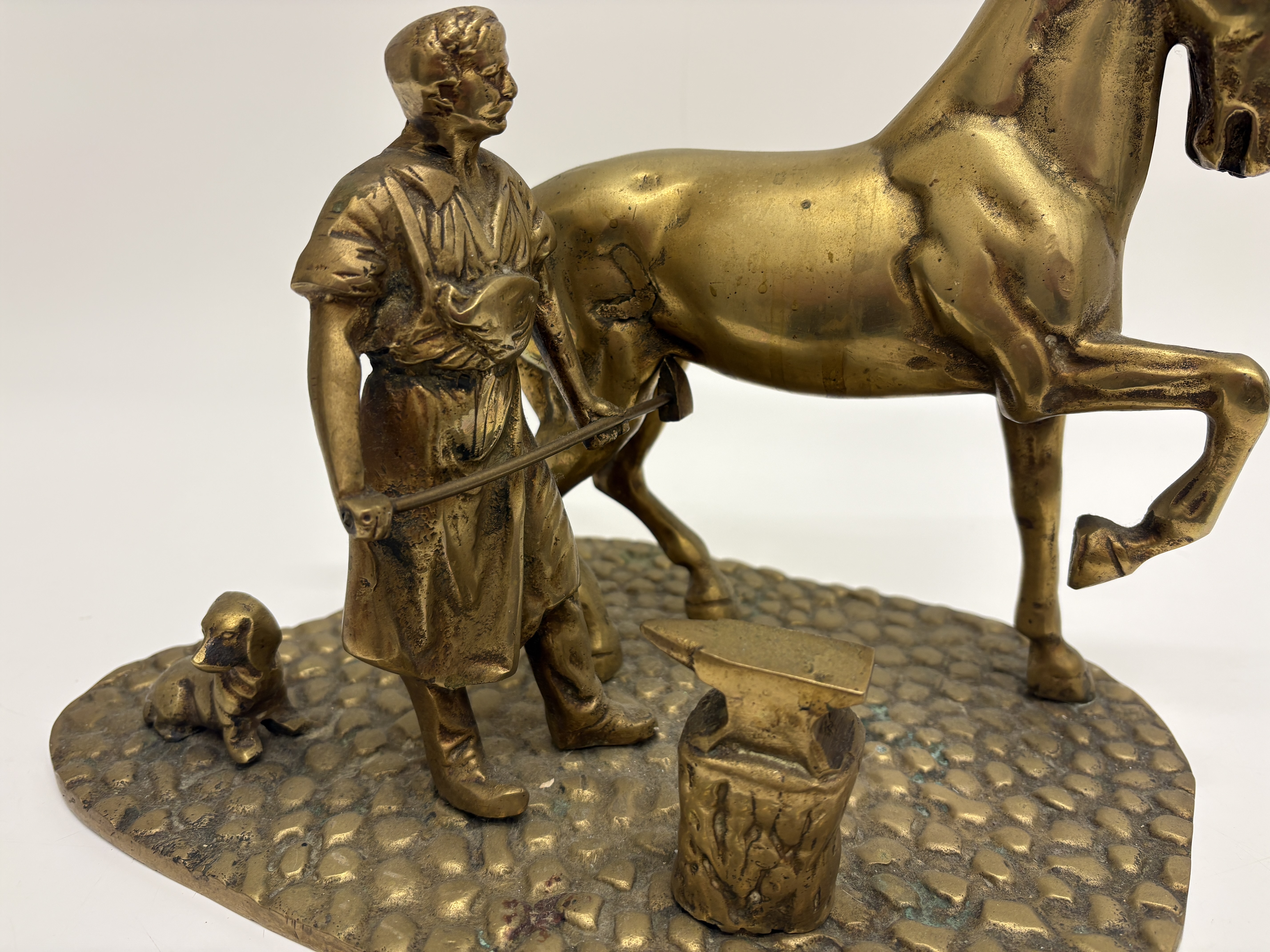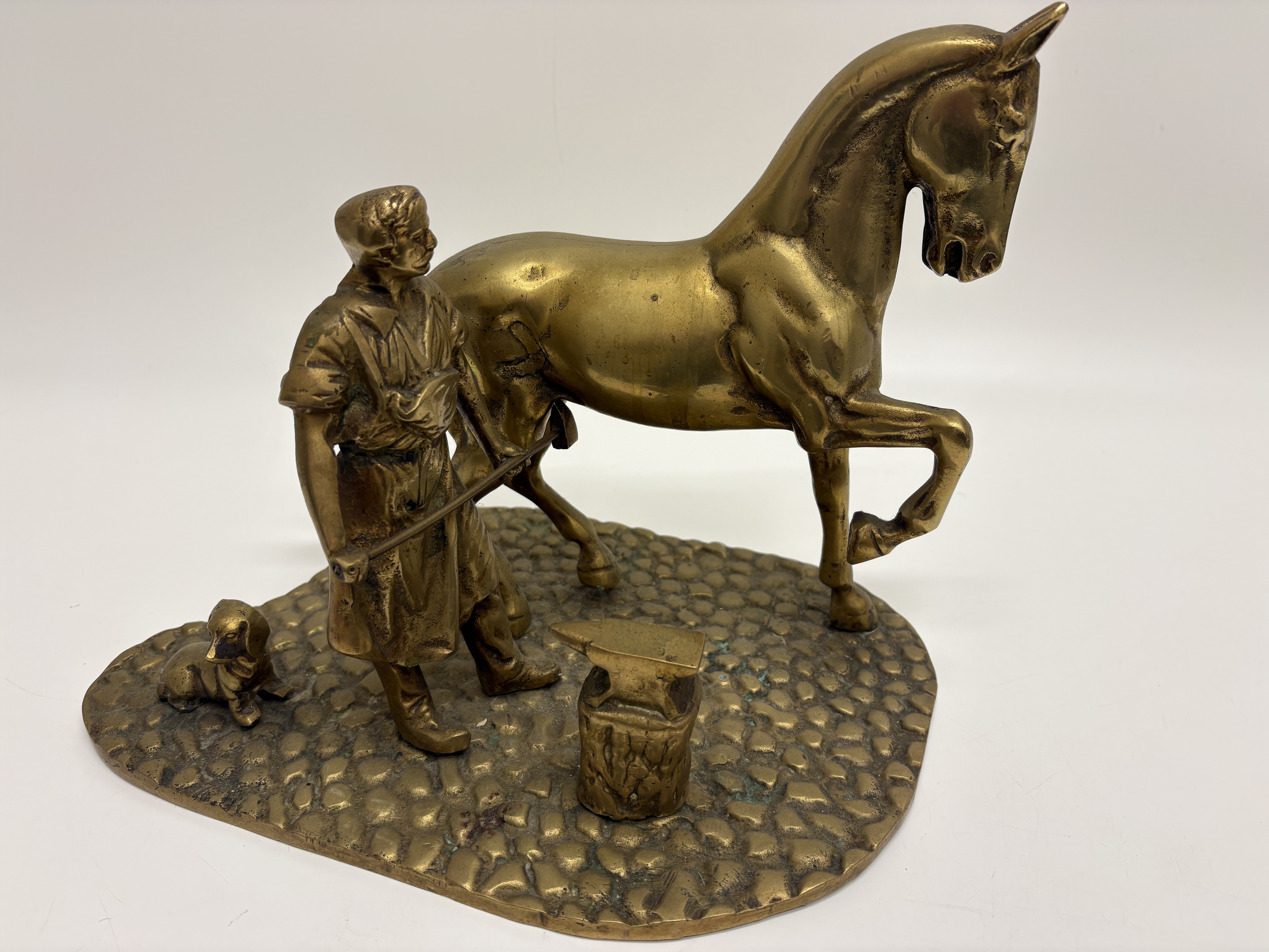 A cast brass sculptural group depicting a traditional farrier scene. The composition features a blacksmith in a workshop apron holding a tool to a horse’s raised hind leg, accompanied by a small dog and an anvil mounted on a stump. The figures are set upon a textured, kidney-shaped base designed to resemble a cobblestone floor. The underside reveals the components are secured to the base with five flathead screws. No maker’s marks or signatures are present.