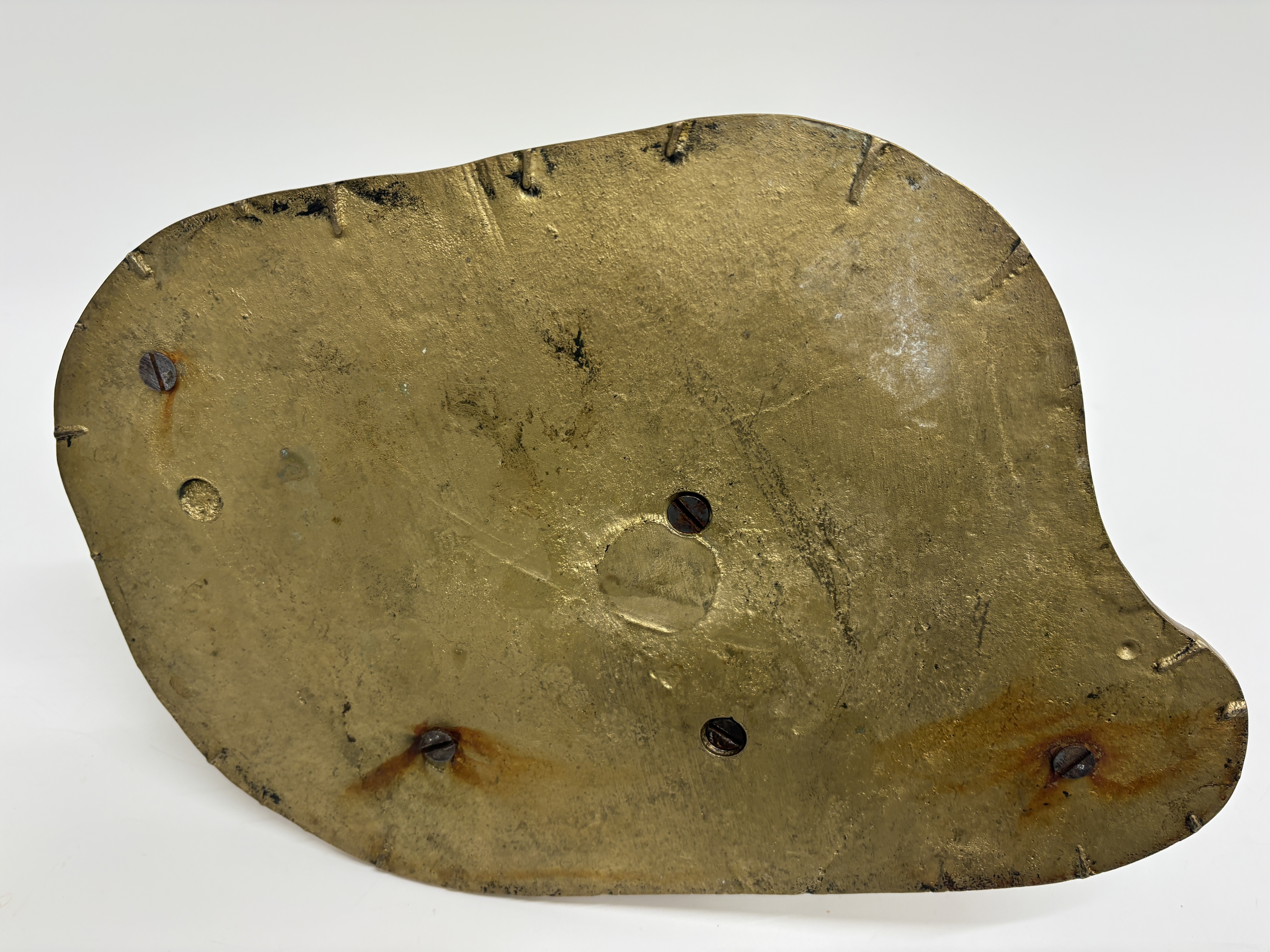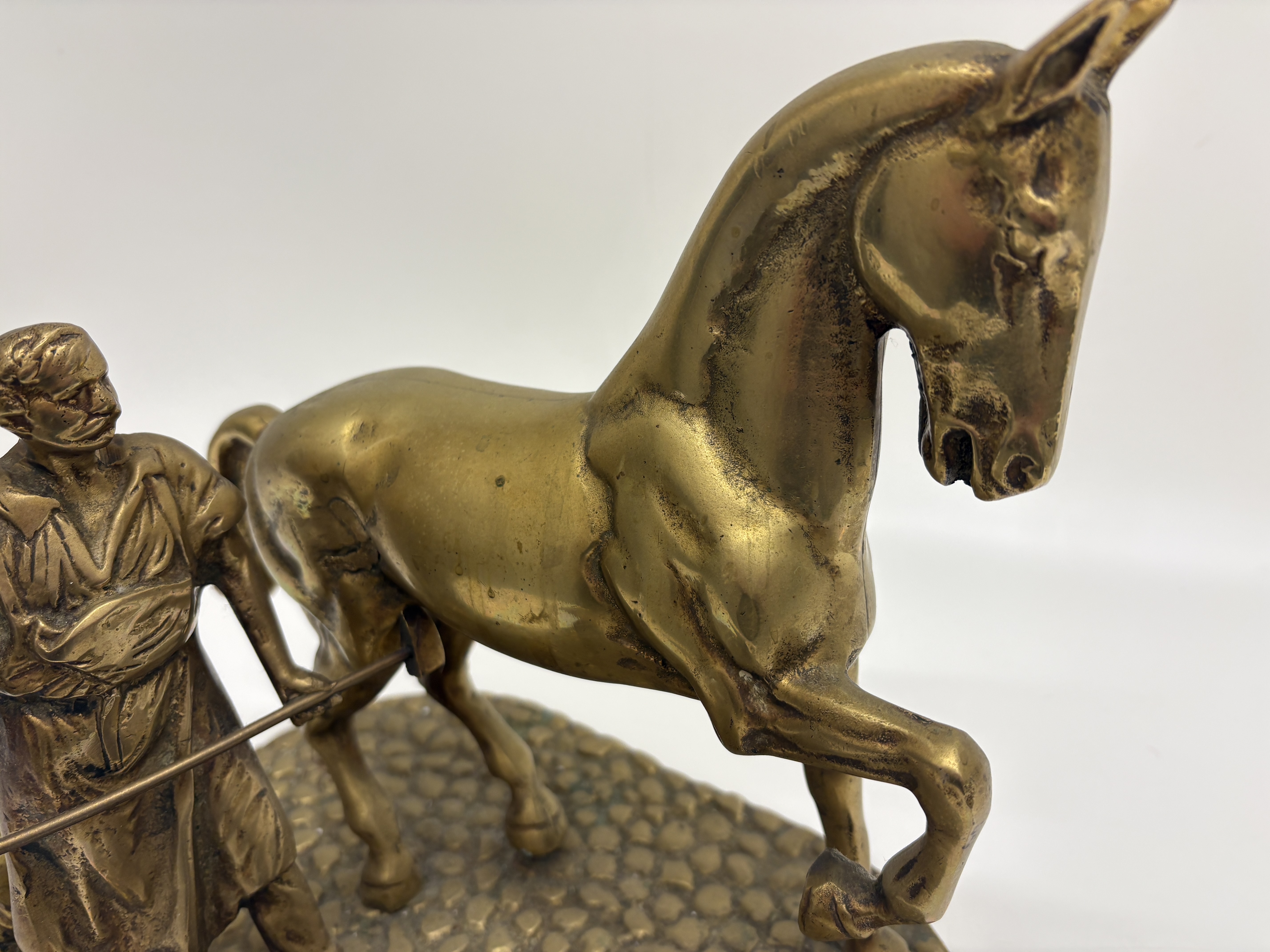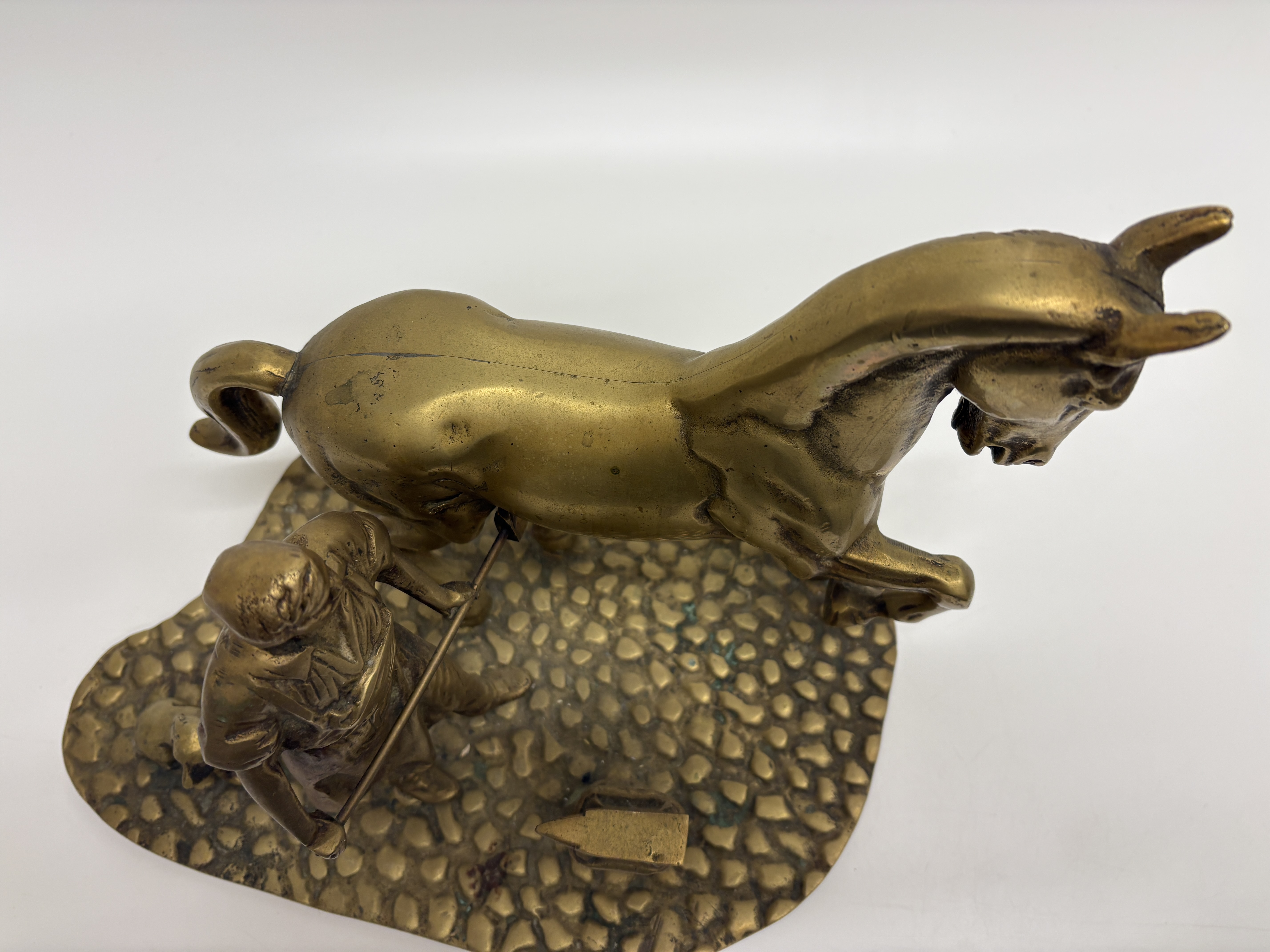 A cast brass sculptural group depicting a traditional farrier scene. The composition features a blacksmith in a workshop apron holding a tool to a horse’s raised hind leg, accompanied by a small dog and an anvil mounted on a stump. The figures are set upon a textured, kidney-shaped base designed to resemble a cobblestone floor. The underside reveals the components are secured to the base with five flathead screws. No maker’s marks or signatures are present.