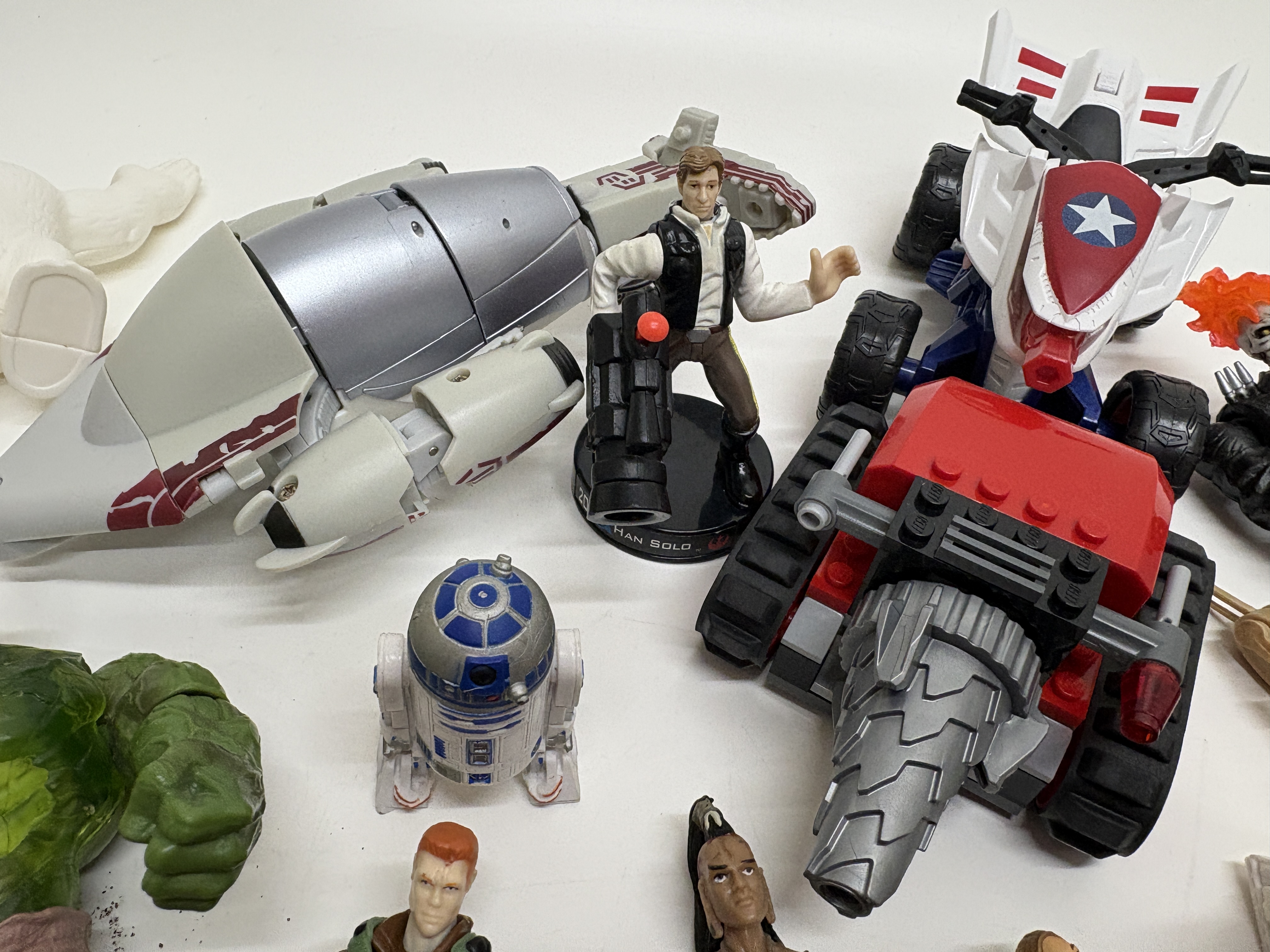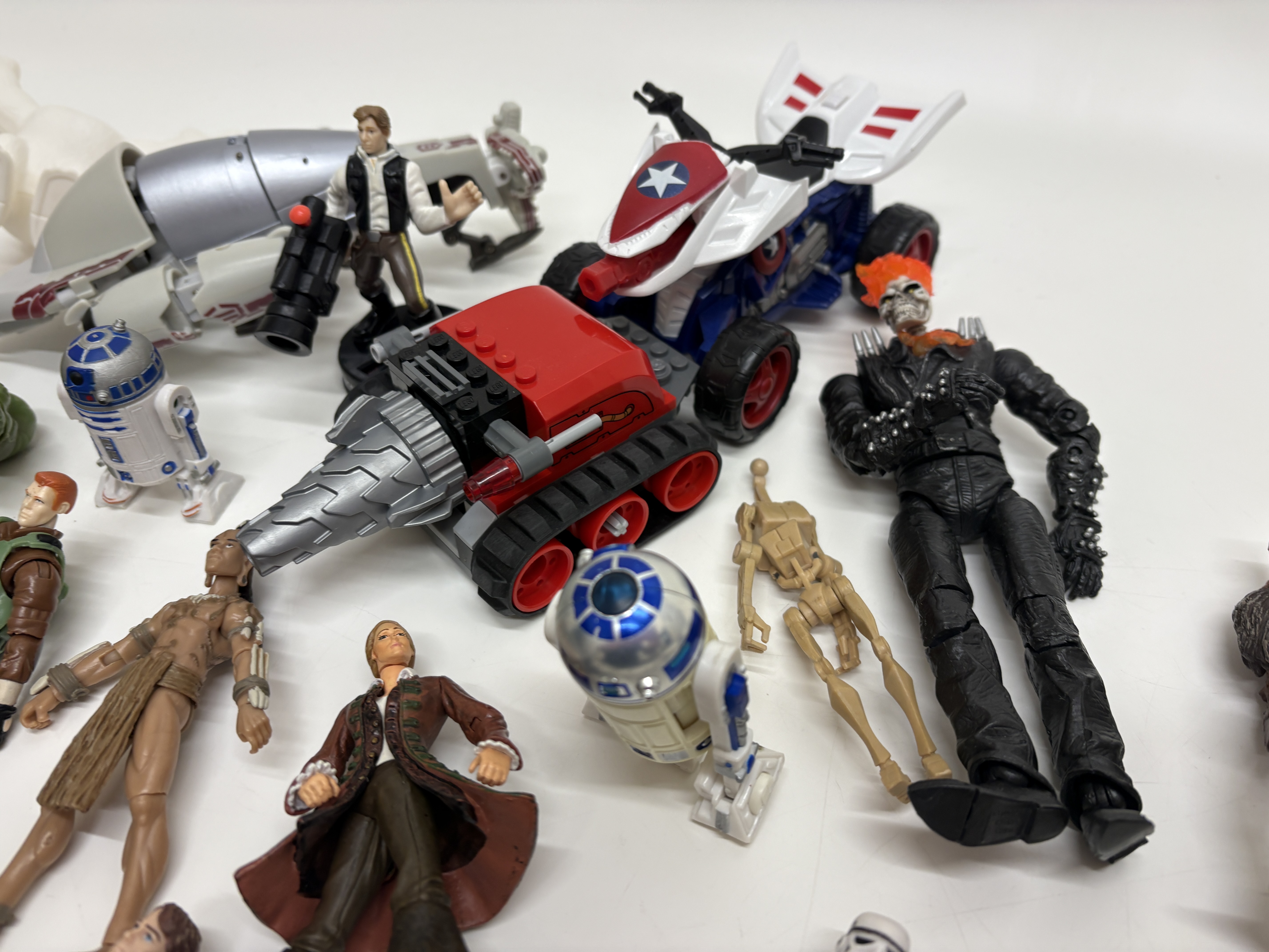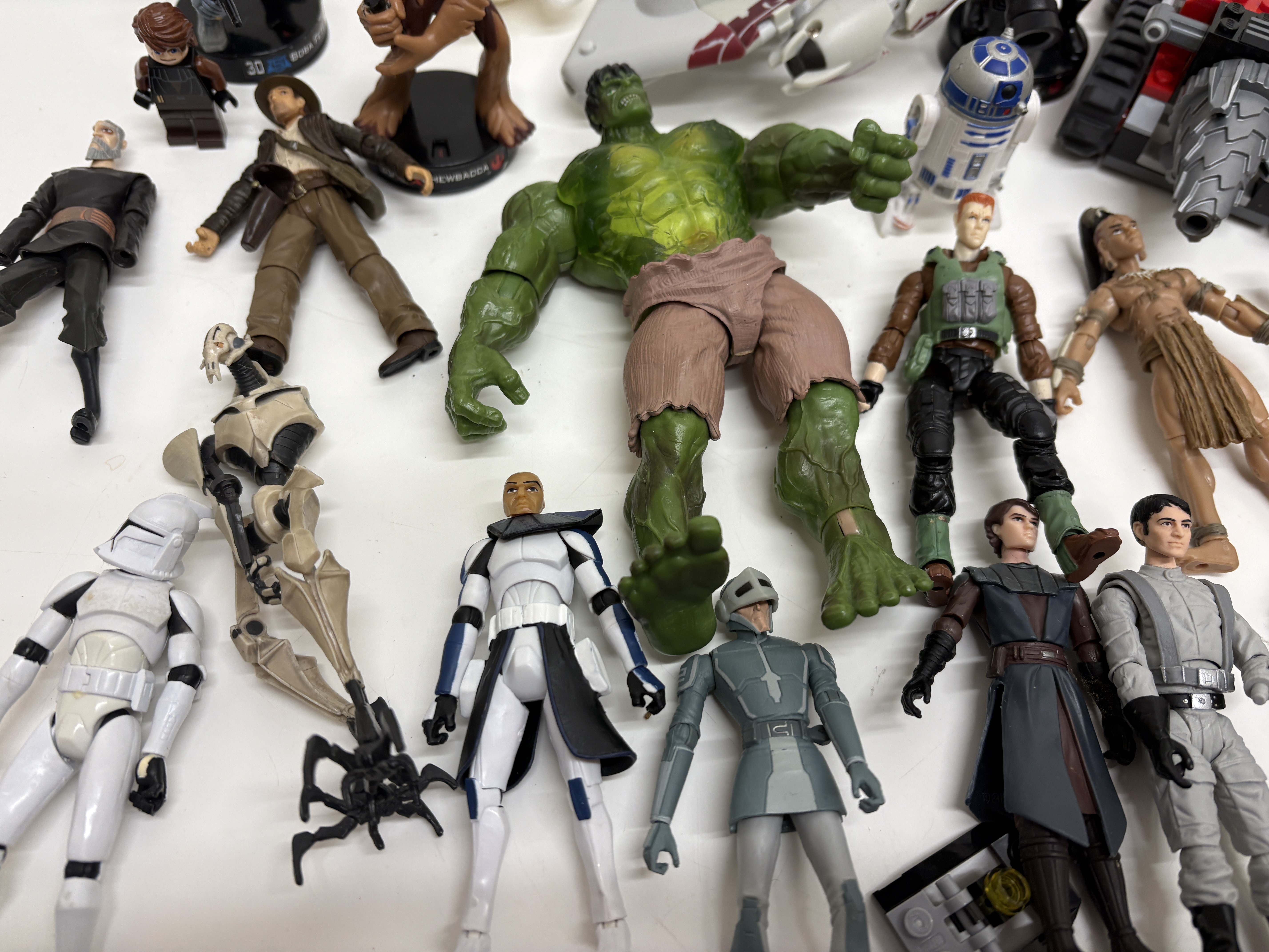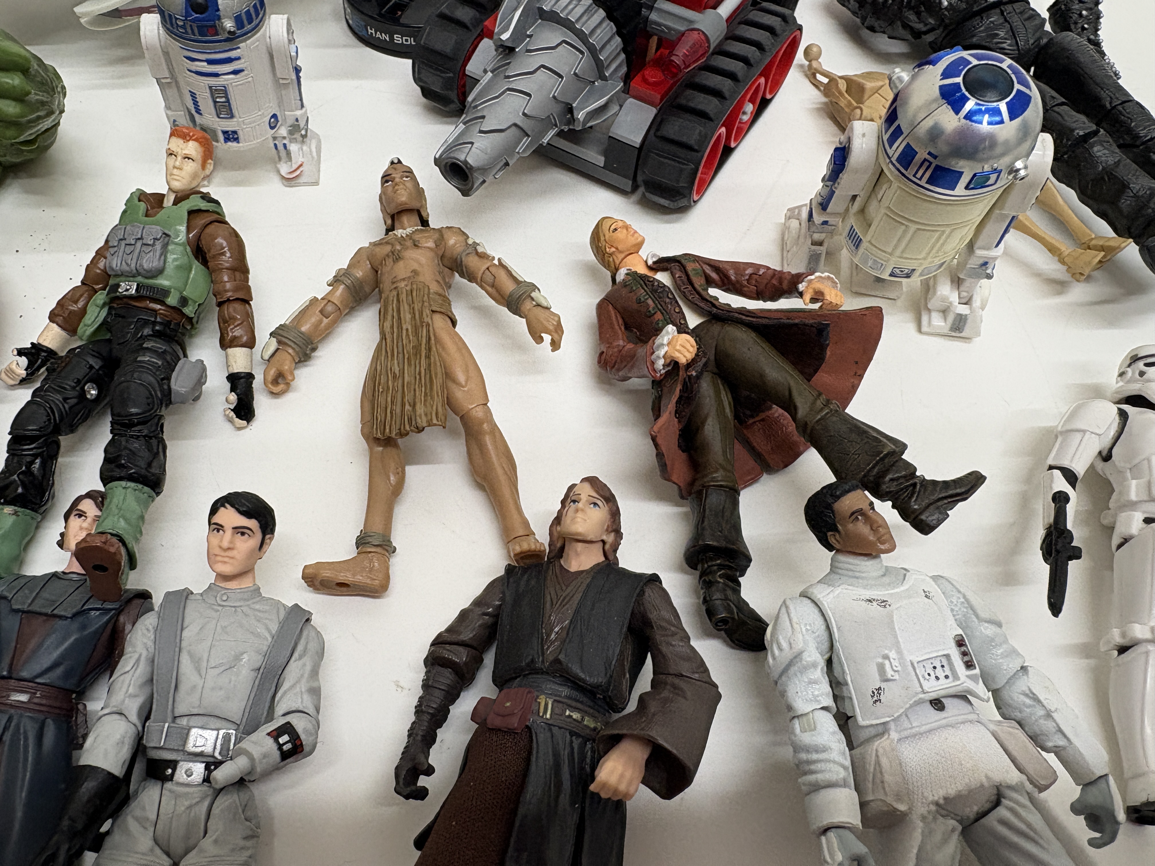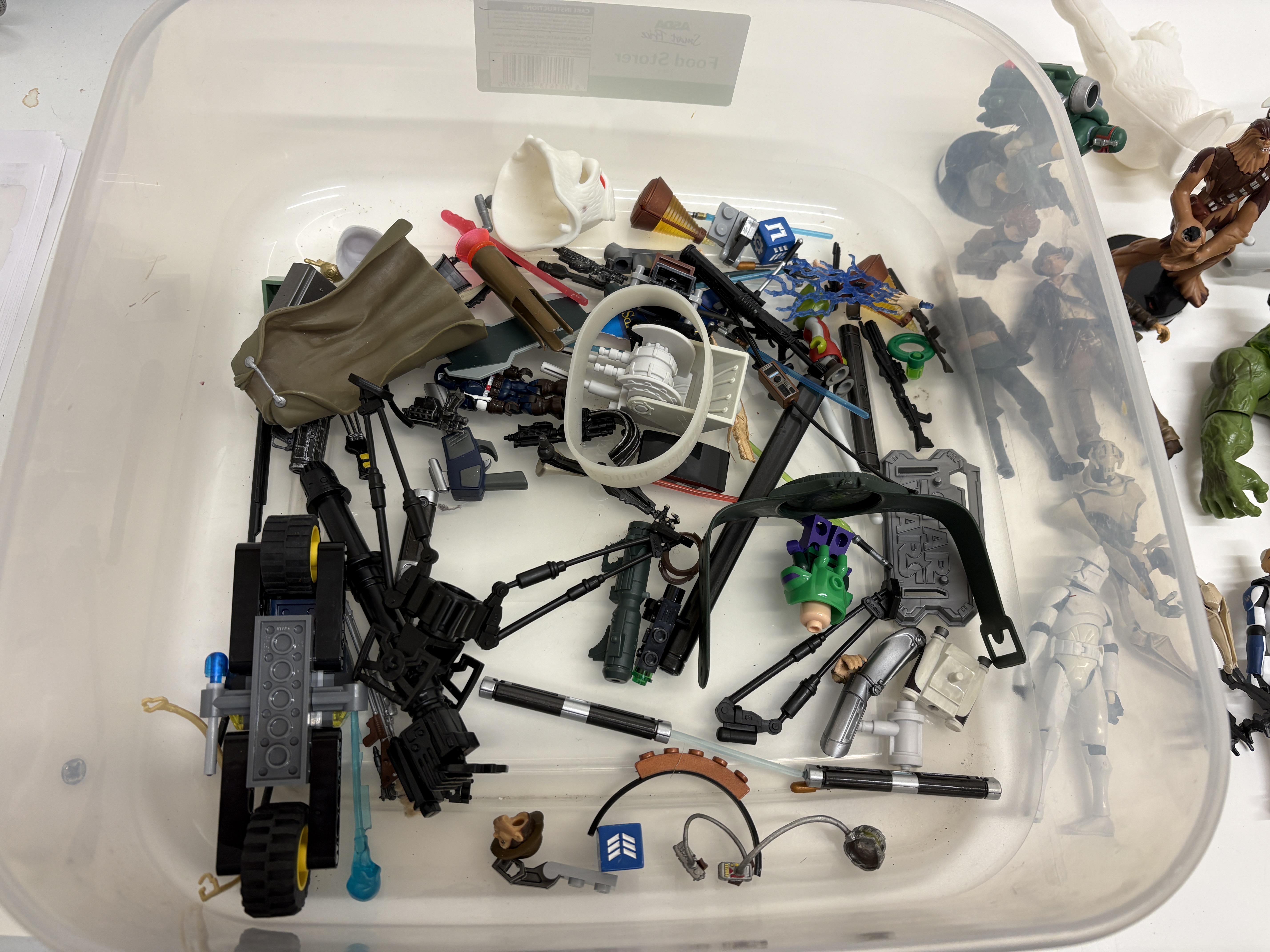 A collection of Star Wars 3.75 inch action figures and accessories, primarily manufactured by Kenner and Hasbro. The group is constructed from moulded plastic and features a wide array of characters from the franchise, including Luke Skywalker, R2-D2, C-3PO, Anakin Skywalker, and various Stormtroopers. Several figures, such as Han Solo and Chewbacca, are mounted on labelled display bases. The lot also includes figures from other popular culture franchises, notably Marvel characters such as the Incredible Hulk and Ghost Rider, alongside an Indiana Jones figure. Additionally, the set contains LEGO-style components including a tracked drill vehicle and a Captain America-themed motorcycle. A large quantity of loose accessories, including miniature blasters, lightsabers, and figure attachments, is included within a clear plastic storage container.