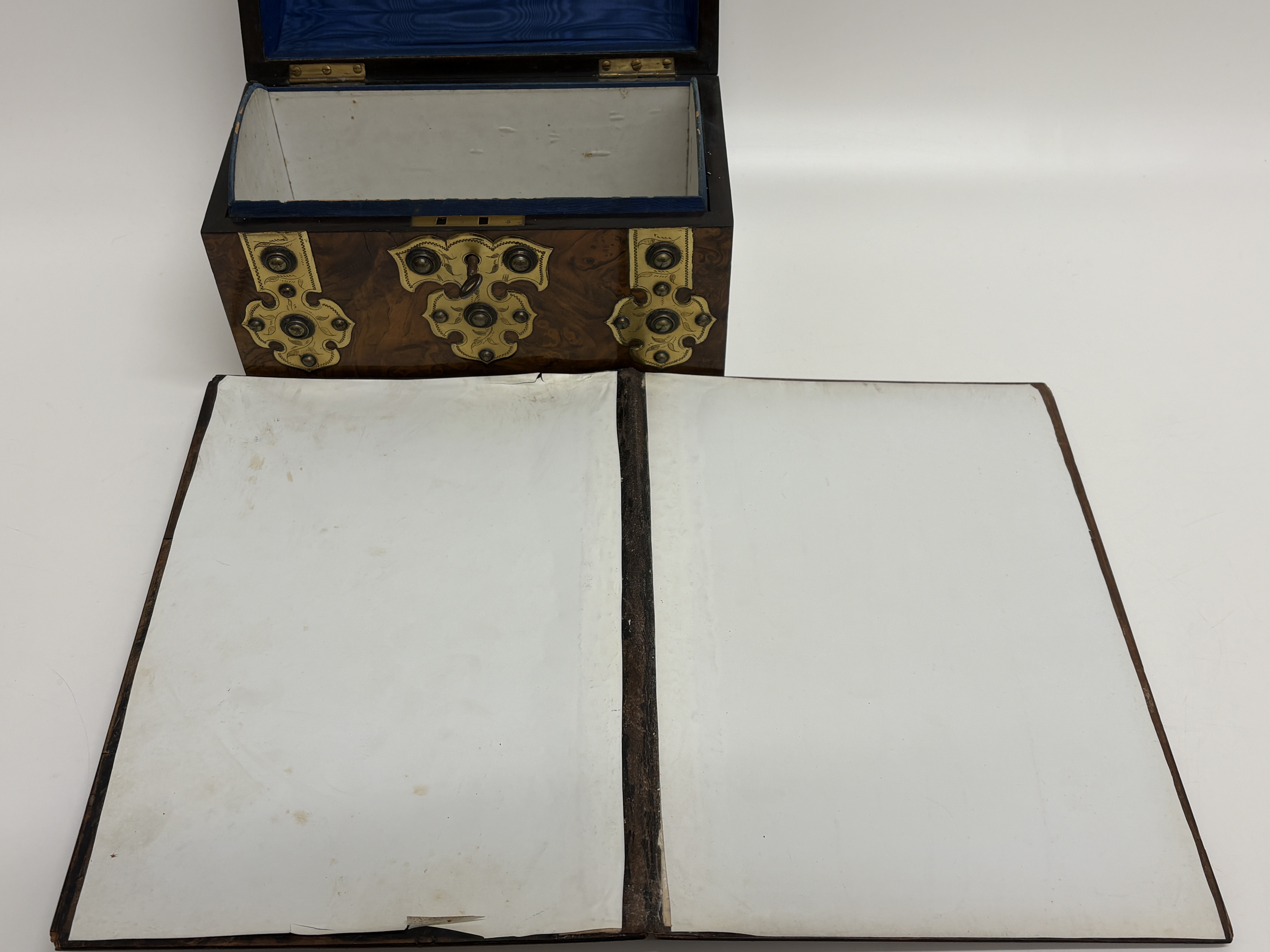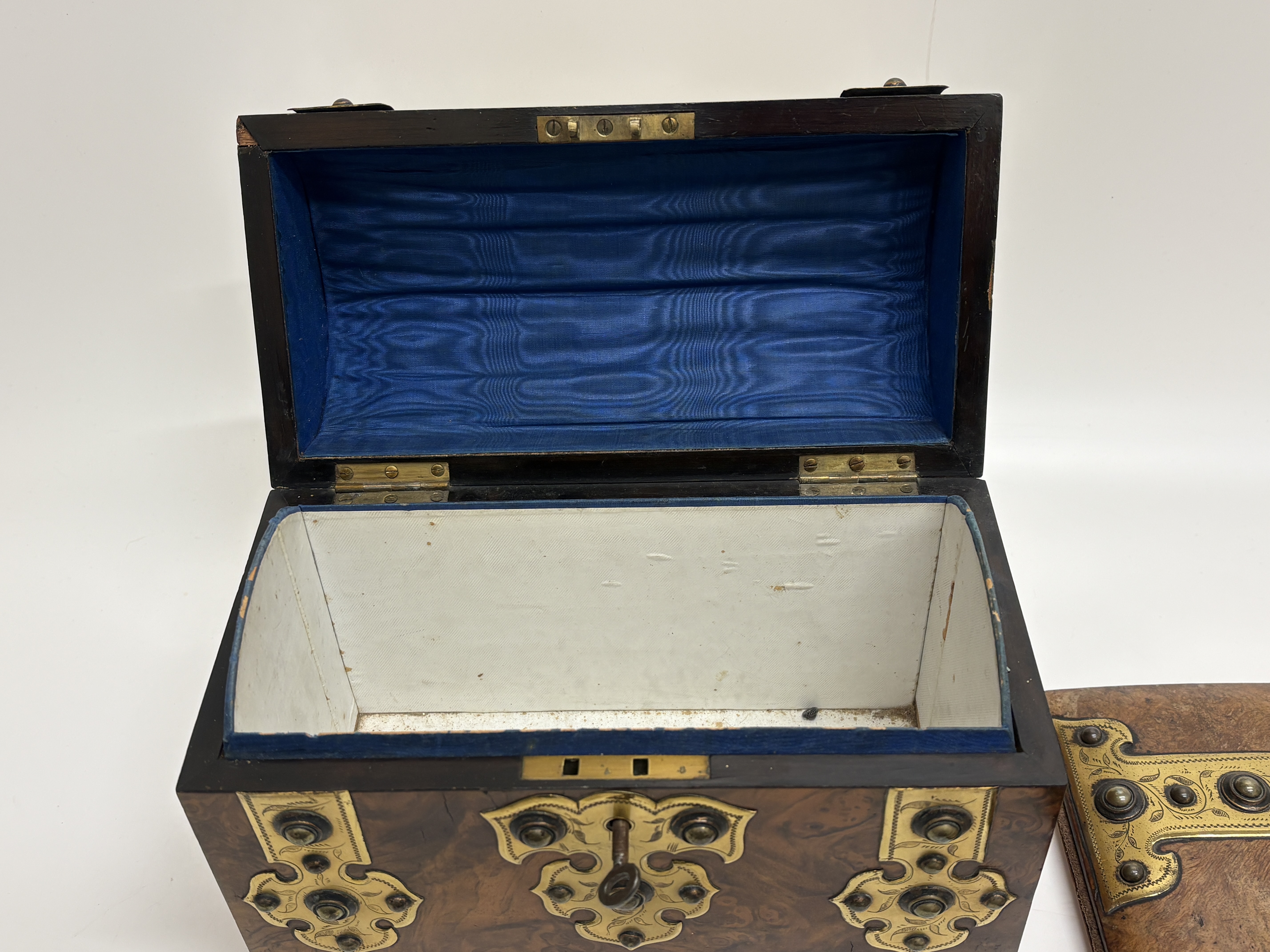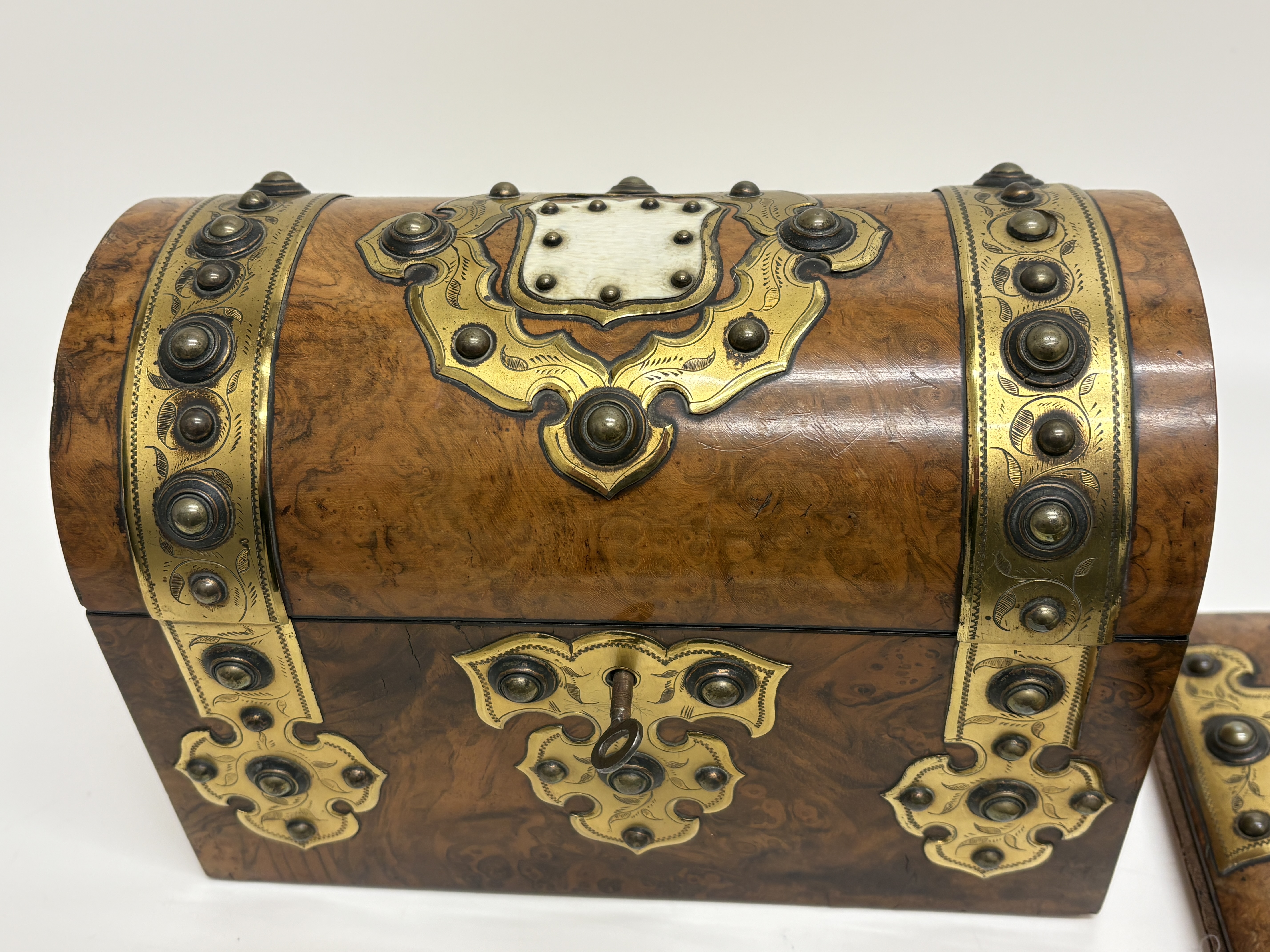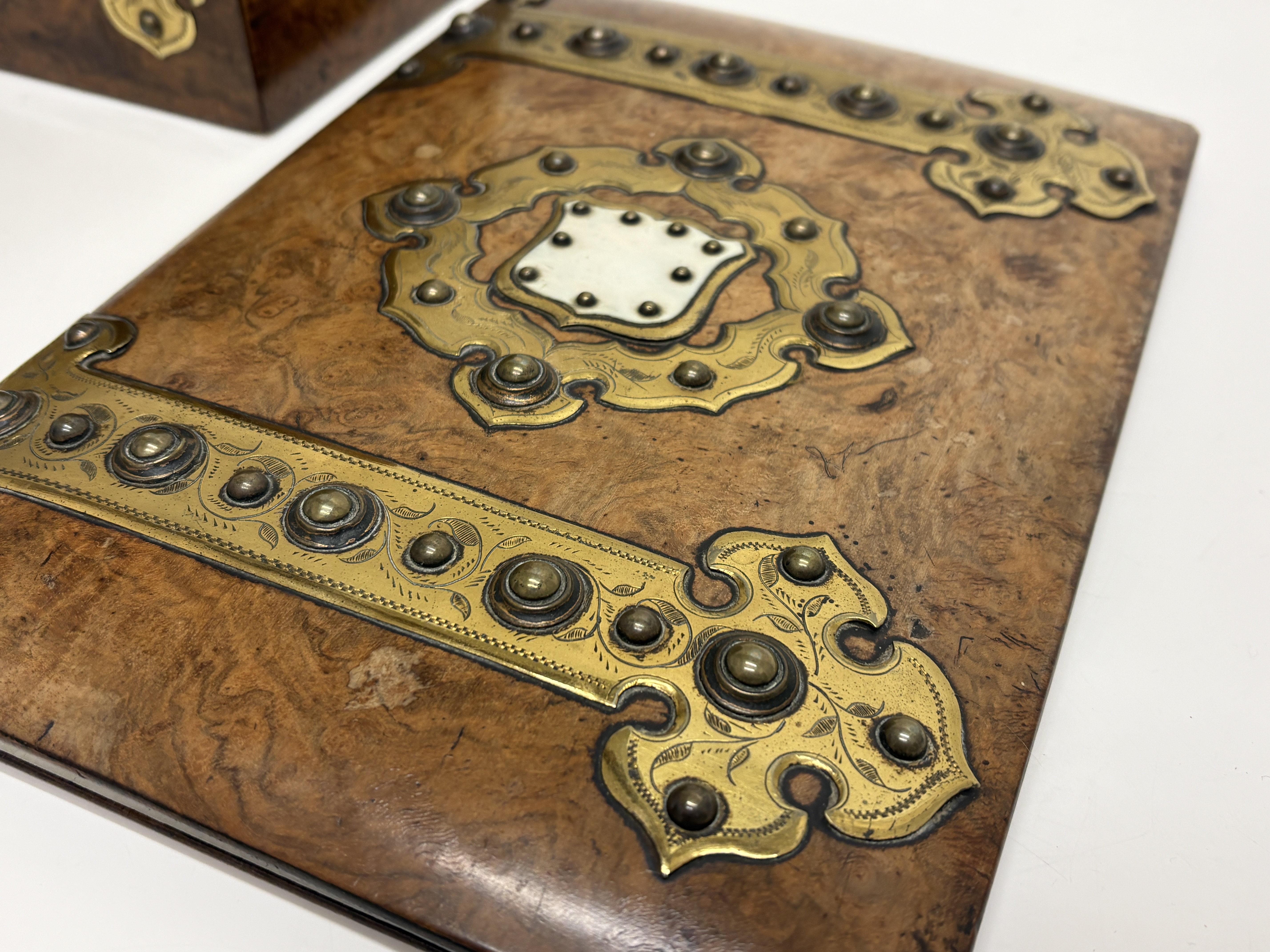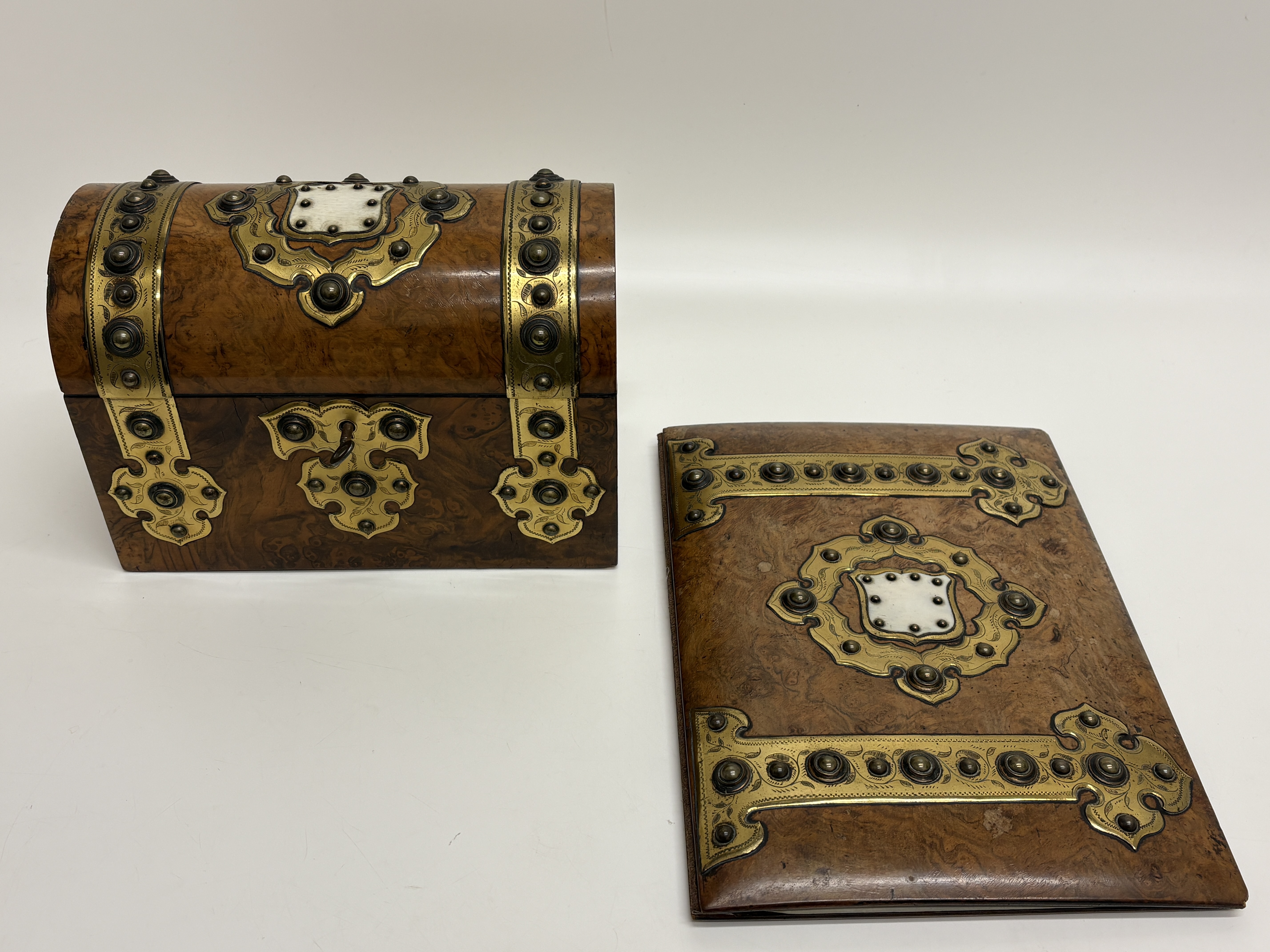 An English Victorian Gothic Revival desktop set comprising a domed-lid stationery box and a matching folder, both constructed from fine burr walnut veneer. The set is heavily ornamented with elaborate engraved brass strapping featuring repeating foliate patterns and accented with raised domed studs. Each piece is centred with a shield-shaped bone inlay secured by brass pins. The box retains its original key and opens to reveal a blue moiré silk lining to the interior of the lid and a white paper-lined base. The matching folder features a plain white paper-lined interior. This set exemplifies the mid-to-late 19th-century taste for medieval-inspired metalwork combined with high-quality cabinet woods. Circa 1870. Box: 23cm x 11cm x 15cm. Folder: 30cm x 23cm.