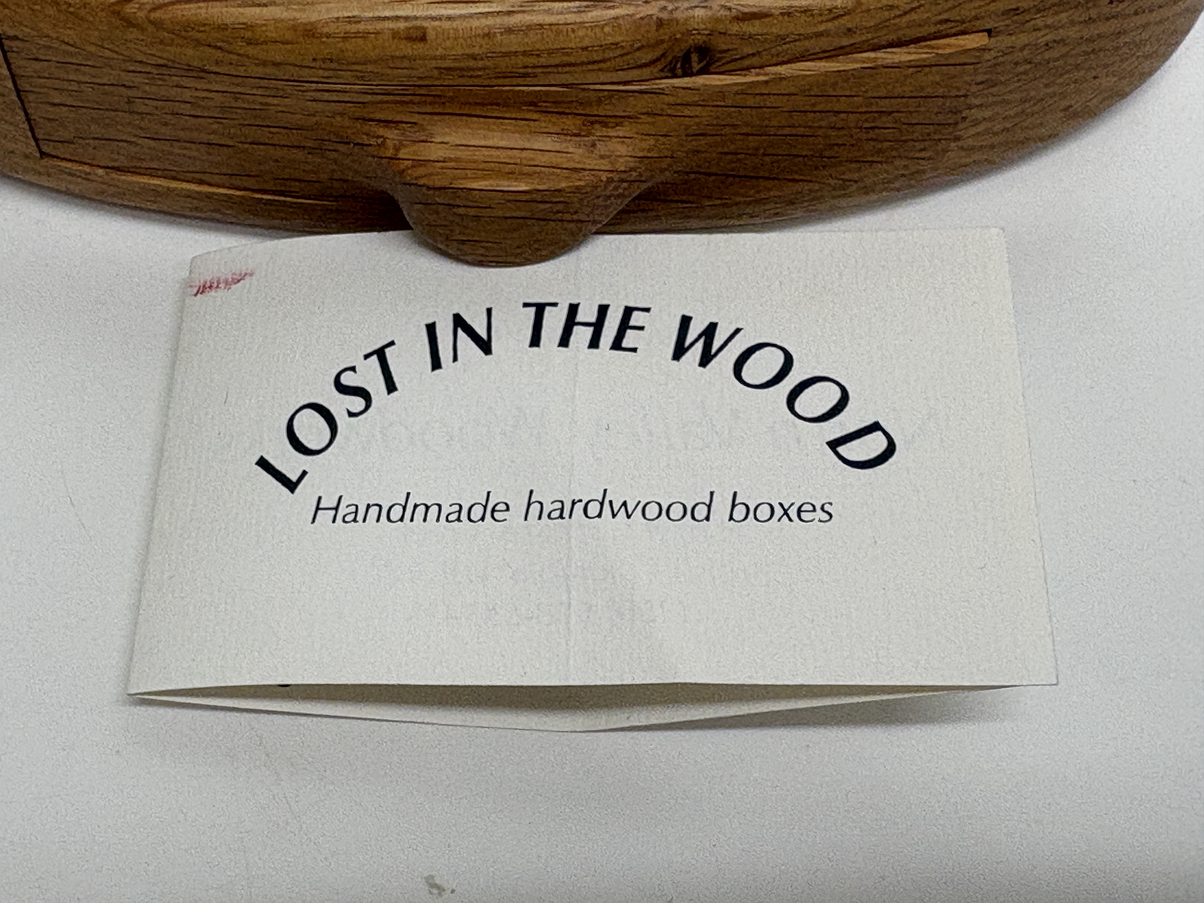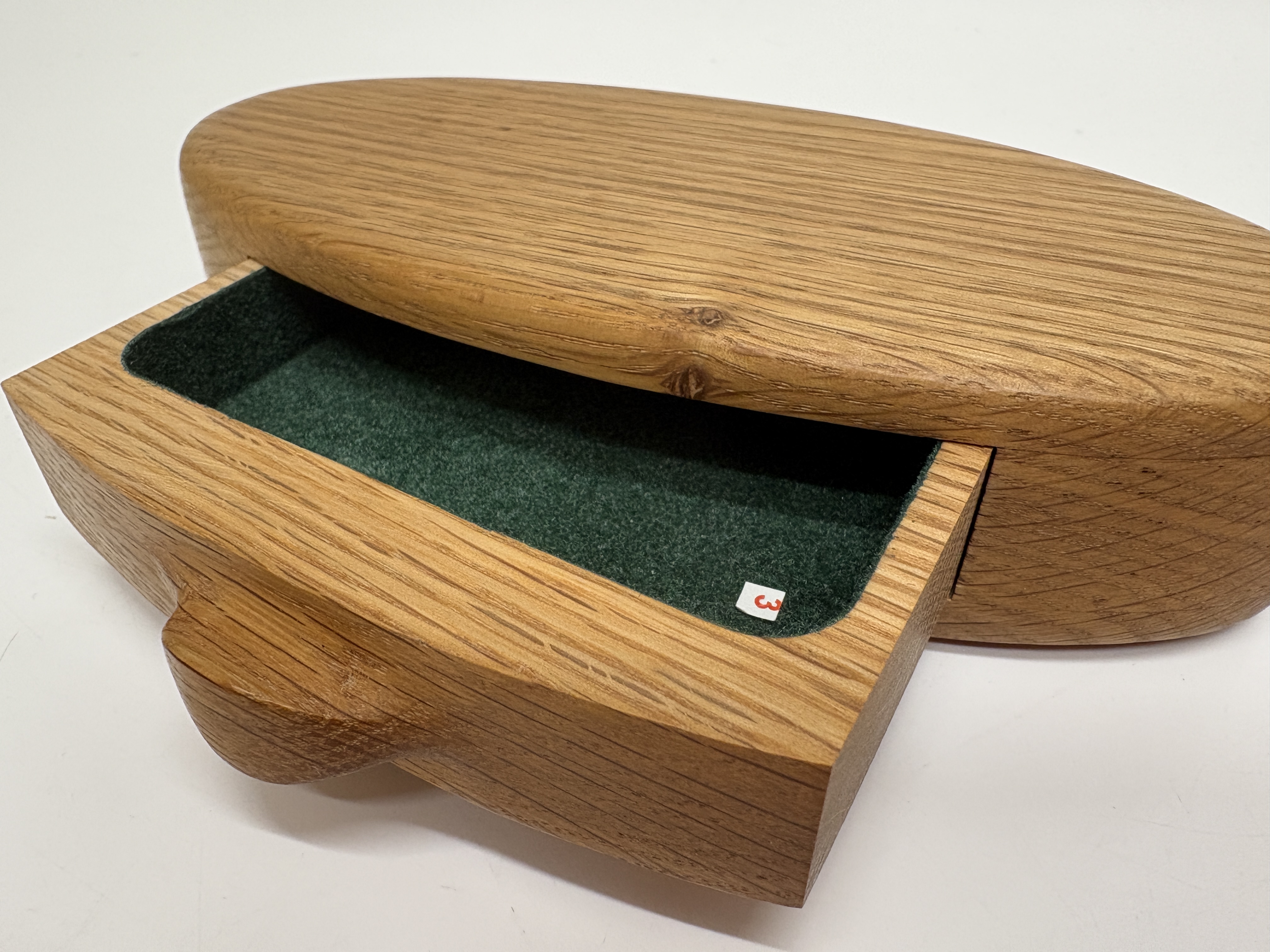 A contemporary handcrafted bandsaw-style trinket box titled Oval, produced by artisan Rainer Schmid of North Valley Woodworks. The piece is constructed from solid Ontario oak and features an organic oval form with a prominent natural wood grain. It contains a single pull-out drawer with an integrated handle, lined with dark green felt. The lot includes the original Lost in the Wood maker’s tag, which identifies the wood species, provides care instructions, and lists the studio location in British Columbia.